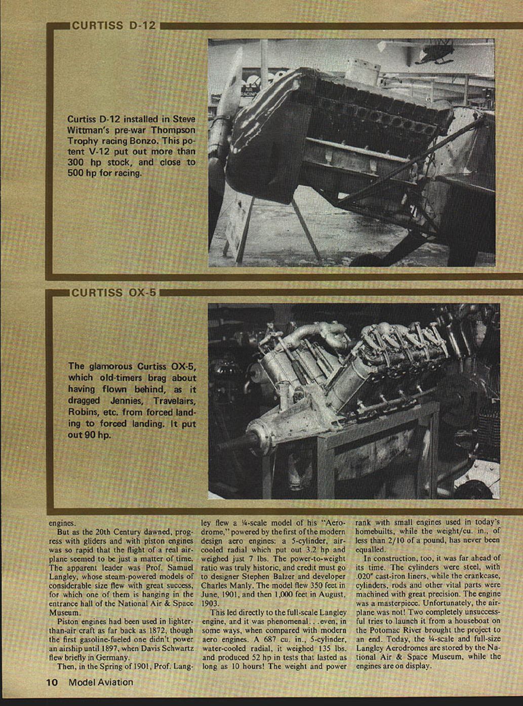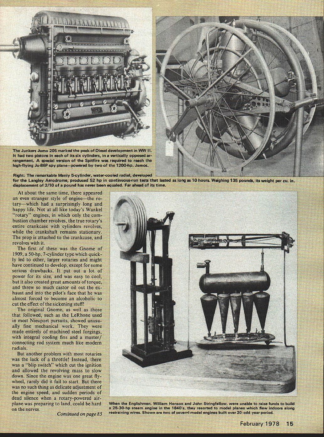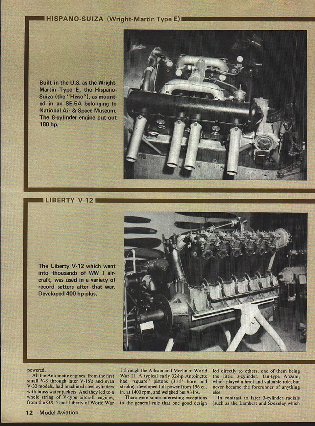 NO OCR TEXT NO OCR TEXT NO OCR TEXT NO OCR TEXT NO OCR TEXT NO OCR TEXT NO OCR TEXT NO OCR TEXT MUFF-L-AIRE I IDEAL FOR PLANES BOATS AND CARSMUFF-L-AIRE EXTREMELY COMPACTIDEAL FOR PLANES FULLY ADJUSTABLE NOISEBOATS LEVEL AND BACKAND $595 PRESSURE FOR BETTERCARS PERFORMANCE ADAPTS TO ALL ENGINES FROMNo 29 TO60144 ONLY 7N3 UNIVERSAL MUFFLER Designed installation wide variety engines 29 60 class Varying number baffle plates controls noise level backSpring action locks Kwik-Klip pressure desire positive contactPatent Pending No 151 battery wires S 125 -DU-BRO PRODUCTS INCORPORATED 480 Bonner Road Wauconda Illinois 60084 USA Openers continued page 60 grees Maybe fly some figure eights 5turns road Partial stalls want loopOKif can roll OK Overhead approach enter pattern downwind leg etc Perhaps shoot some touch-and-goes Better milling around aimlessly Enjoy theme flying Say did ever tell about idea have take Manhattan modelhey wherere going Letters Editor continued page 7 tially resulting lack publicity could introduce fliers events also help stimulate existing compe tition coverage Control-line Team Finals 1976 Team helped crease interest FAI Speed gave goal work towards representing US World Champs attained California summer hope make type inspiration possible other fliers like myself try keep enjoyable interna tional events alive through publicity power maybe once popular events will again flourish now Europe Charles Lieber Moorestown NJ December issuewhich included Team Race Finalsprobably relieved Mr Liebers distress bit although did contain report Speed Team Trials Nats-related team trials included November issue cause insufficient space report both Nats regular events team trials Speed Team Trials other scheduling situation due two sites two dates Once second part Speed Team Trials held affecting three top spots could get report February issue report received time January Engines/Berliner continued page 15 first Gnome rotary square pistons 393 bore stroke 335 cu displacement weight 165 lbs produced its 50 hpat 1150 rpm few later LeRhones can still seen lug ging full-scale reproductions World War airplanes displays World War began sputtering engines wobbling airplanes before long both seen amazing advances rotary engines part replaced water-cooled V-8s came direct ancestors superb V-12s nations used World War II early Vees impact creation Swiss en gineer living Spain went production France Britain later USA Hispano-Suiza familiarly known Hisso Its advanced de sign included en bloc cylinder construc tion cast-aluminum water jacket enclosing steel cylinders effectively lubricated valves gearing combination automatic manual mix ture control fuel system per mitted inverted flight development potential pano-Suiza vast first pro duction model put out 150 hp 1400 rpm boosted 240 hp 2200 rpm no increase internal dimen sions Once bore stroke en larged up-rated 300 hp During World War II almost 50000 produced mainly classic SPAD SE-SA along some Bris tol F2Bs Sopwith Dolphins production Hissos 900 V-8s common versions 150-220 hp bore 472 stroke 511 dis placement 718 cu weight 455-465 lbs free troubles engines time did have difficulties high-pressure February 1978 85 GRISH AIRCRAFT TYPE PROPELLERS Made hardwood fully carved true helical pitch airfoil ready sanding ALL SIZES IN18$700 8 & 10 PITCH20800 RIGHT HAND221000 ROTATION241300 318 BORE AT YOUR DEALER uSE TO PROPEL AIR CREATE THRUST AND BE PROPELLED BY AIR AT DISCRETION OF THE PURCHASER frI1aL PROPELLERS LL GRISH PROPELLERS ARE ENGINEERED TO TRUEHELICAL ITCH AND AIRFOIL FOR EFFICIENCY NEW COLOR. YELLOW propellers fIN DRIPEI phasing out. ULM UIUIbUU NATURAL WHITE phases 54543 Minor production63 savings help hold6486 down prices Grish94 engineered air-114116 efficiency and124125 strength remain same either color lubrication system reduction gear contemporary metallurgy wasnt up Meanwhile back safe side Atlantic America getting act its first important production en gine Curtiss OX-S powered US sole original contribution World War in-the-air JN-4 Jenny 4000 famous trainers built hundreds surplus engines poured private market after war become basis whole range civil aircraft including such famous marks Travelair Waco Curtiss Robin Such nostalgia connected OX-5 has long club have flown behind enjoy swapping tales adven tures OX-S like others day water-cooled aluminum crank case cylinders cast iron monel metal water jackets brazed onto bar rels pushrod actuated overhead valves last major engines have single ignition cause forced landings tendency water pump leak carburetor basic OX-S 4 bore 5 stroke piston displacement 503 cu weight 320 lbs ground out 90 hp 1400 rpm OX-S merely first step very young American aircraft engine industry second step Liberty V12 excellent engine first Liberty wasnt delivered until late 1917 5000 went wartime deHavilland DH-4s built li cense US hundred Handley-Page 0/400 bombers post-war use Lib erty permanently enshrined engine hall-of-fame Four powered Curtiss NC-4 first transatlantic flight airplane 1919 nose Fokker T-2 made first non-stop coast-to-coast flight across US 1923 Libertys two hefty Douglas World Cruisers became first airplanes fly around world 1924 Such flights proved better advertising slogans Lib erty quite powerplant Compared OX-5 Liberty big engine otherwise pretty conventional Based Mercedes style welded cylinders suffered such common complaints burned exhaust valves cracked water jackets broken accessory gears still good engine long enough spare parts handy bore 5 stroke 7 displacement 1650 cu later duplicated Rolls Royce Merlin Liberty weighed 850 lbs rated 420 hp 1700 rpm whereas Rolls 20 years later weighed half again much developed 3-5 times much power Once Liberty shown itself first-class engine Curtiss got game produced whole series castaluminum powerplants V-12s four valves per cylinder first gain fame D-12 used Curtiss P-I Boeing PW-9 pursuits Curtiss R-6 R-8 Army racers R-6 D-12 set world speed 