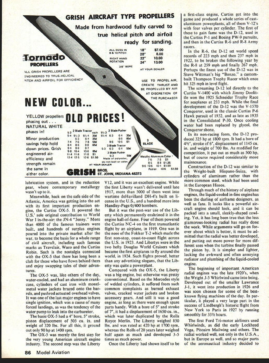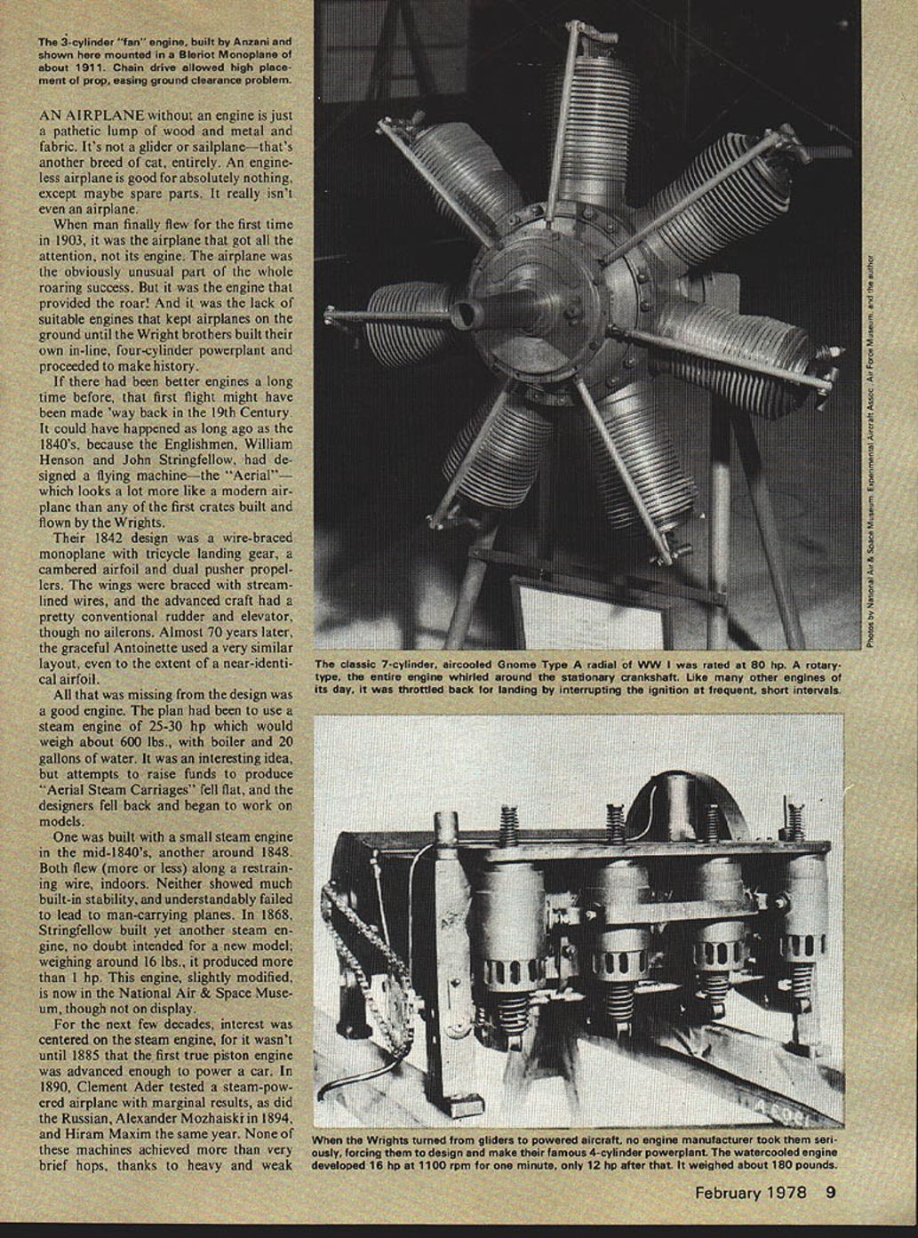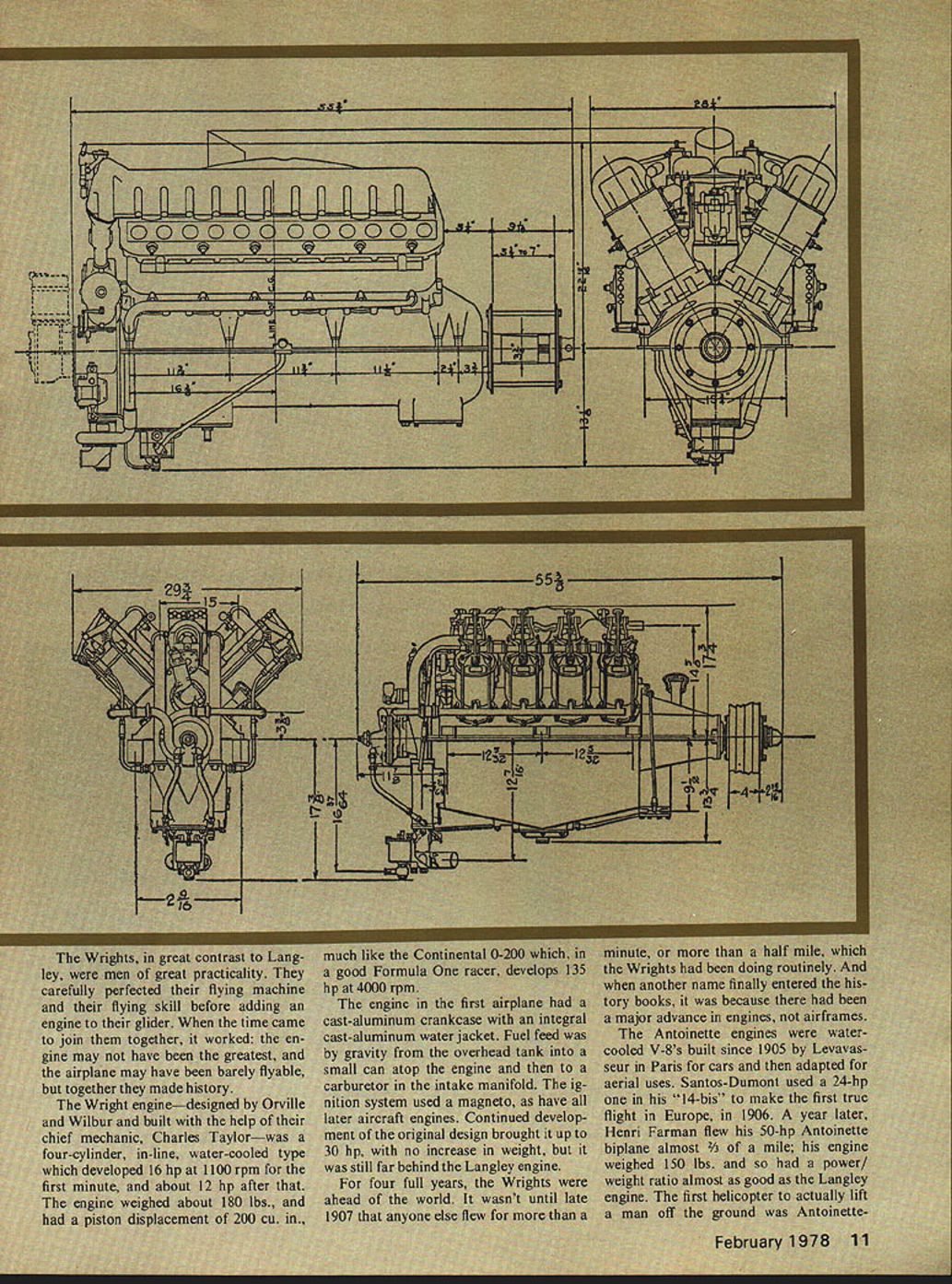 NO OCR TEXT NO OCR TEXT NO OCR TEXT NO OCR TEXT NO OCR TEXT NO OCR TEXT NO OCR TEXT NO OCR TEXT MUFF-L-AIRE I IDEAL FOR PLANES BOATS AND CARSMUFF-L-AIRE EXTREMELY COMPACTIDEAL FOR PLANES FULLY ADJUSTABLE NOISEBOATS LEVEL AND BACKAND $595 PRESSURE FOR BETTERCARS PERFORMANCE ADAPTS TO ALL ENGINES FROMNo 29 TO60144 ONLY 7N3 UNIVERSAL MUFFLER Designed installation wide variety engines 29 60 class Varying number baffle plates controls noise level backSpring action locks Kwik-Klip pressure desire positive contactPatent Pending No 151 battery wires S 125 -DU-BRO PRODUCTS INCORPORATED 480 Bonner Road Wauconda Illinois 60084 USA Openers continued page 60 grees Maybe fly some figure eights 5turns road Partial stalls want loopOKif can roll OK Overhead approach enter pattern downwind leg etc Perhaps shoot some touch-and-goes Better milling around aimlessly Enjoy theme flying Say did ever tell about idea have take Manhattan modelhey wherere going Letters Editor continued page 7 tially resulting lack publicity could introduce fliers events also help stimulate existing compe tition coverage Control-line Team Finals 1976 Team helped crease interest FAI Speed gave goal work towards representing US World Champs attained California summer hope make type inspiration possible other fliers like myself try keep enjoyable interna tional events alive through publicity power maybe once popular events will again flourish now Europe Charles Lieber Moorestown NJ December issuewhich included Team Race Finalsprobably relieved Mr Liebers distress bit although did contain report Speed Team Trials Nats-related team trials included November issue cause insufficient space report both Nats regular events team trials Speed Team Trials other scheduling situation due two sites two dates Once second part Speed Team Trials held affecting three top spots could get report February issue report received time January Engines/Berliner continued page 15 first Gnome rotary square pistons 393 bore stroke 335 cu displacement weight 165 lbs produced its 50 hpat 1150 rpm few later LeRhones can still seen lug ging full-scale reproductions World War airplanes displays World War began sputtering engines wobbling airplanes before long both seen amazing advances rotary engines part replaced water-cooled V-8s came direct ancestors superb V-12s nations used World War II early Vees impact creation Swiss en gineer living Spain went production France Britain later USA Hispano-Suiza familiarly known Hisso Its advanced de sign included en bloc cylinder construc tion cast-aluminum water jacket enclosing steel cylinders effectively lubricated valves gearing combination automatic manual mix ture control fuel system per mitted inverted flight development potential pano-Suiza vast first pro duction model put out 150 hp 1400 rpm boosted 240 hp 2200 rpm no increase internal dimen sions Once bore stroke en larged up-rated 300 hp During World War II almost 50000 produced mainly classic SPAD SE-SA along some Bris tol F2Bs Sopwith Dolphins production Hissos 900 V-8s common versions 150-220 hp bore 472 stroke 511 dis placement 718 cu weight 455-465 lbs free troubles engines time did have difficulties high-pressure February 1978 85 GRISH AIRCRAFT TYPE PROPELLERS Made hardwood fully carved true helical pitch airfoil ready sanding ALL SIZES IN18$700 8 & 10 PITCH20800 RIGHT HAND221000 ROTATION241300 318 BORE AT YOUR DEALER uSE TO PROPEL AIR CREATE THRUST AND BE PROPELLED BY AIR AT DISCRETION OF THE PURCHASER frI1aL PROPELLERS LL GRISH PROPELLERS ARE ENGINEERED TO TRUEHELICAL ITCH AND AIRFOIL FOR EFFICIENCY NEW COLOR. YELLOW propellers fIN DRIPEI phasing out. ULM UIUIbUU NATURAL WHITE phases 54543 Minor production63 savings help hold6486 down prices Grish94 engineered air-114116 efficiency and124125 strength remain same either color lubrication system reduction gear contemporary metallurgy wasnt up Meanwhile back safe side Atlantic America getting act its first important production en gine Curtiss OX-S powered US sole original contribution World War in-the-air JN-4 Jenny 4000 famous trainers built hundreds surplus engines poured private market after war become basis whole range civil aircraft including such famous marks Travelair Waco Curtiss Robin Such nostalgia connected OX-5 has long club have flown behind enjoy swapping tales adven tures OX-S like others day water-cooled aluminum crank case cylinders cast iron monel metal water jackets brazed onto bar rels pushrod actuated overhead valves last major engines have single ignition cause forced landings tendency water pump leak carburetor basic OX-S 4 bore 5 stroke piston displacement 503 cu weight 320 lbs ground out 90 hp 1400 rpm OX-S merely first step very young American aircraft engine industry second step Liberty V12 excellent engine first Liberty wasnt delivered until late 1917 5000 went wartime deHavilland DH-4s built li cense US hundred Handley-Page 0/400 bombers post-war use Lib erty permanently enshrined engine hall-of-fame Four powered Curtiss NC-4 first transatlantic flight airplane 1919 nose Fokker T-2 made first non-stop coast-to-coast flight across US 1923 Libertys two hefty Douglas World Cruisers became first airplanes fly around world 1924 Such flights proved better advertising slogans Lib erty quite powerplant Compared OX-5 Liberty big engine otherwise pretty conventional Based Mercedes style welded cylinders suffered such common complaints burned exhaust valves cracked water jackets broken accessory gears still good engine long enough spare parts handy bore 5 stroke 7 displacement 1650 cu later duplicated Rolls Royce Merlin Liberty weighed 850 lbs rated 420 hp 1700 rpm whereas Rolls 20 years later weighed half again much developed 3-5 times much power Once Liberty shown itself first-class engine Curtiss got game produced whole series castaluminum powerplants V-12s four valves per cylinder first gain fame D-12 used Curtiss P-I Boeing PW-9 pursuits Curtiss R-6 R-8 Army racers R-6 D-12 set world speed 