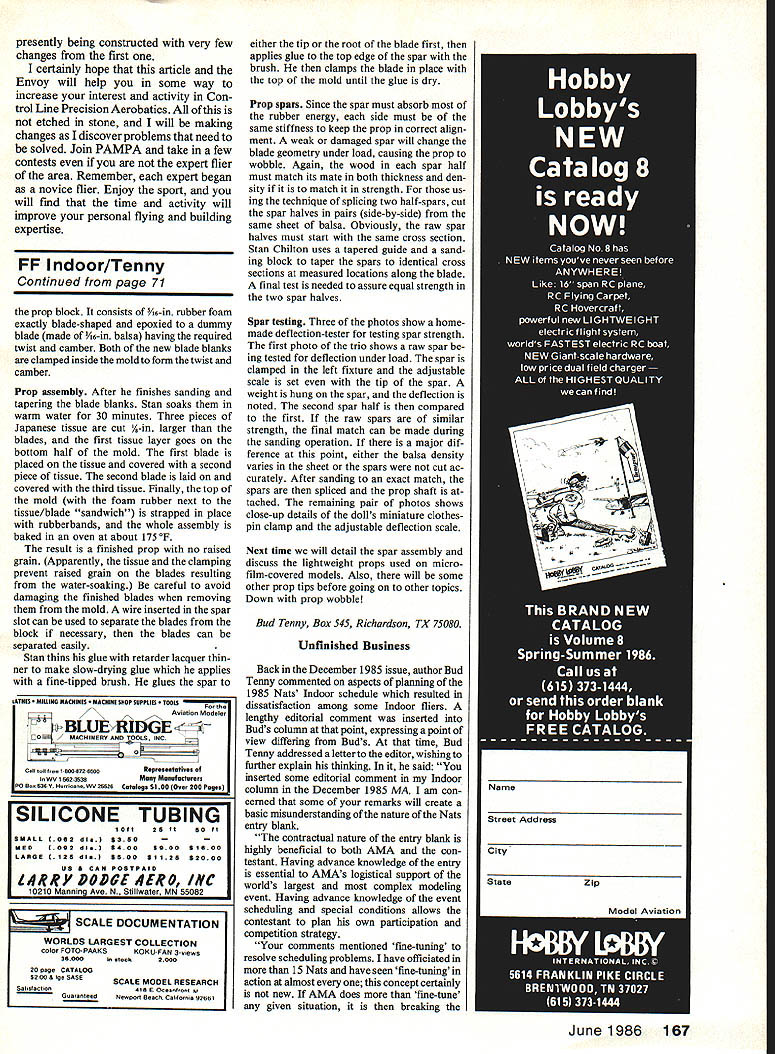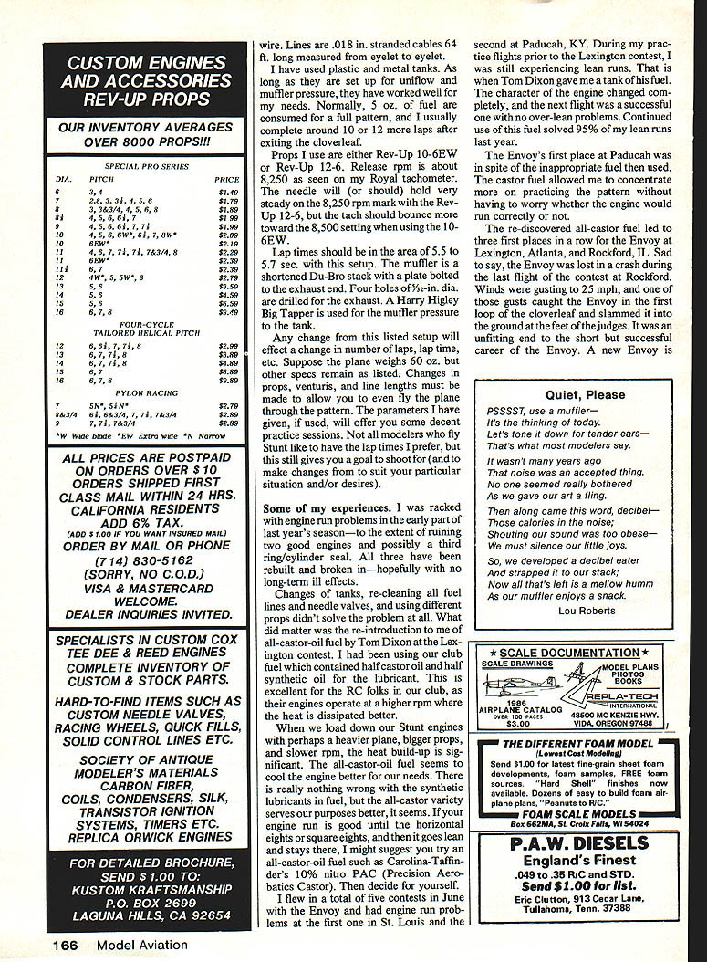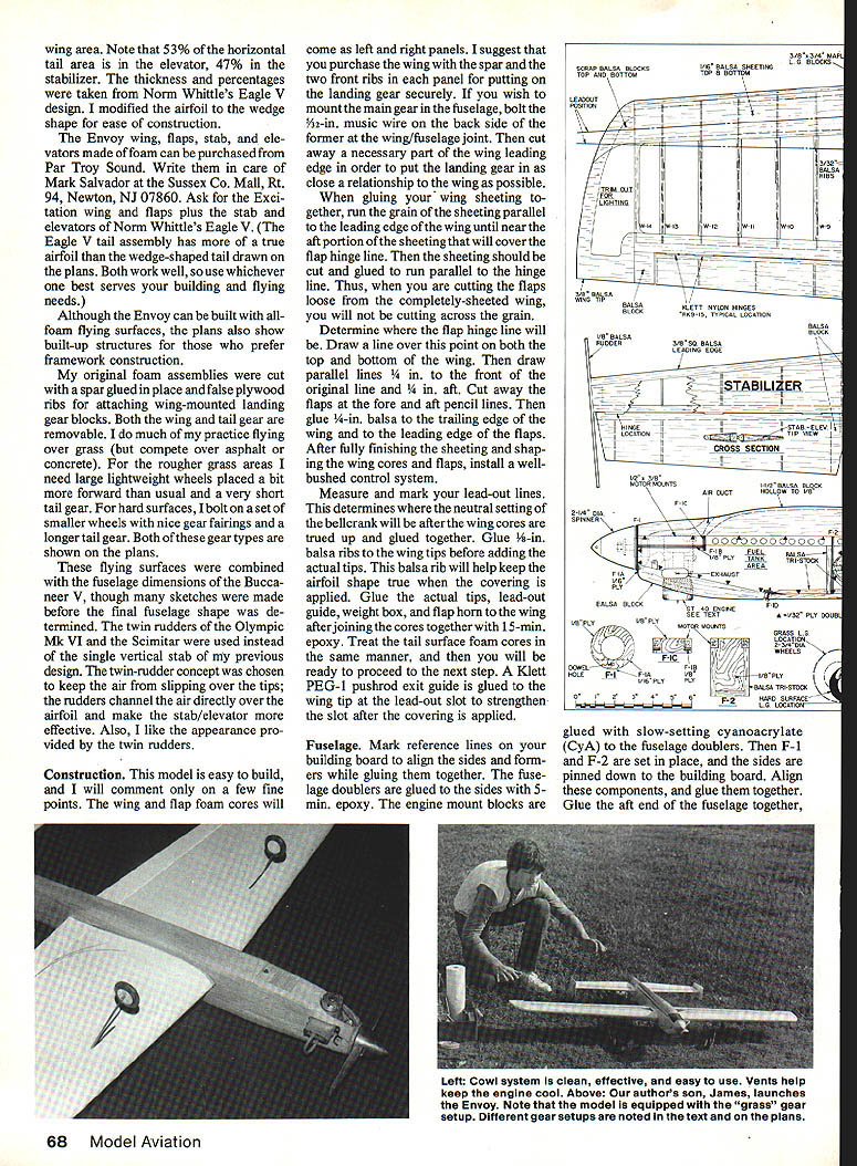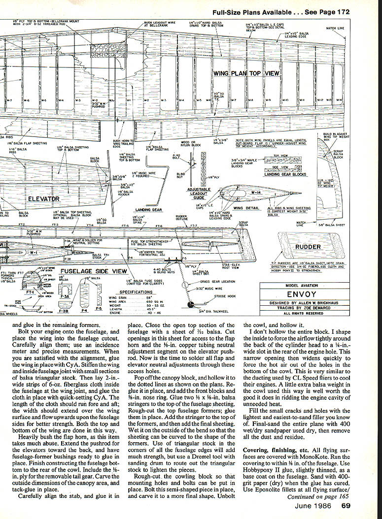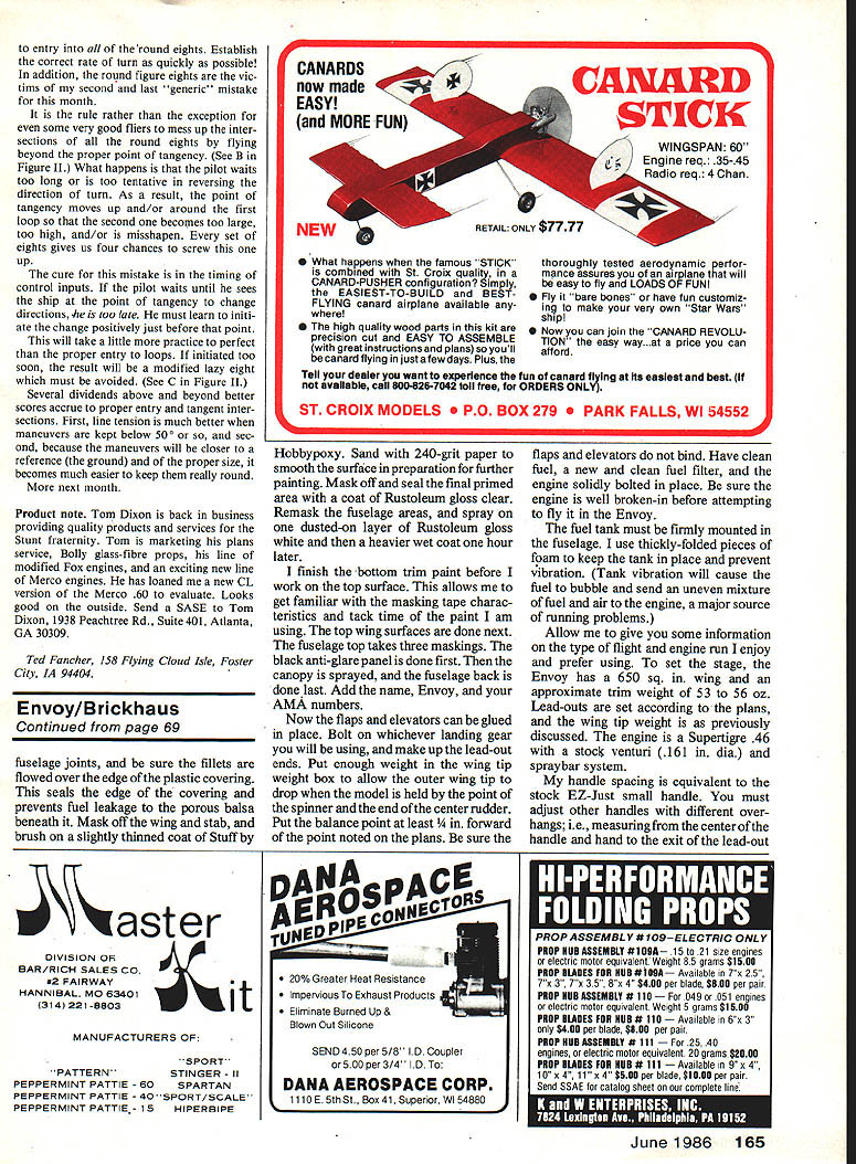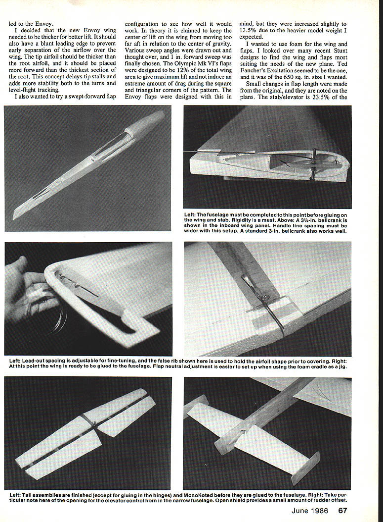 Our author poses design prior Stunt season Aerodynamically clean destined well hands right pilot notables author has pro duced Control Line Precision Aerobatics machine capable top-level performance MY MOST-FLOWN competition ship Buccaneer 5 nearly reached end its useful career fuselage wood oil-soaked ship gained over 6 oz due oil various repairs front end literally coming apart dearly needed new Precision Aerobatics ma chine Normally would build fresh Stunt plane six months three-year hiatus building due job pressures other needs new design planning included read ing both old new articles magazines Stunt concepts designs engine/tank combination opera tion concept adopted suc cessful Buccaneer 5 Since wanted experiment other engine tank combinations designed nose new Envoy receive mostfavored engine also two others other tank design Originally Supertigre 46 Sullivan RST 6-oz tank power source providing needle valve exhaust holes building process pos sible use ST 40 OS Max 40H standard 1-in-high metal tank Carolina-Taffinder Builing way could try different combinations having unsightly modifications after plane finished painted outboard needle valve holes cut runningplastic tanks Jun Lynch has made firm believer system Dont afraid route fuel line inboard side engine using plastic tank also keeps needle valve away hot muffler using customary metal tank needle valve should inboard side overall design concept Envoy first came three most-read older articles Olympic Mk VI Sting Ray Bob Gialdini Stunt Machine Gene Schaffer Further refinement design specifications came articles Ted Fancher .. tion develop ments Gialdini Schaffer highly influ enced earlier Scimitar profile Stunter Gialdinis discussion Sting Ray 66 Model Aviation Borrowing own previous work other Allen W Brickhaus led Envoy decided new Envoy wing needed thicker better lift should also have blunt leading edge prevent early separation airflow over wing tip airfoil should thicker root airfoil should placed forward thickest section root concept delays tip stalls adds stability both turns level-flight tracking also wanted try swept-forward flap configuration see well would work theory claimed keep center lift wing moving too far aft relation center gravity Various sweep angles drawn out thought over i forward sweep finally chosen Olympic Mk Vis flaps designed 12% total wing area give maximum lift induce extreme amount drag during square triangular corners pattern Envoy flaps designed mind increased slightly 135% due heavier model weight expected wanted use foam wing flaps looked over recent Stunt designs find wing flaps suiting needs new plane Ted Fanchers Excitation seemed 650 sq size wanted Small changes flap length made original noted plans stab/elevator 235% LeTt Lead-out spacing aajustaoie Tor Tine-Tuning ana TflO Taise rib shown used hold airfoil shape priorto covering Rigni point wing ready glued fuselage Flap neutral adjustment easlerto set up using foam cradle jig Left Tail assemblies finished except gluing hinges MonoKoted before glued fuselage Right Take par ticular note opening forthe elevator control horn narrow fuselage Open shield provides small amount rudder offset June1986 67 Left fuselage must completed point before gluing wing stab Rigidity must Above 3-in belicrank shown inboard wing panel Handle line spacing must wider setup standard 3-in belicrank also works well wing area Note 53% horizontal tail area elevator 47% stabilizer thickness percentages taken Norm Whittles Eagle V design modified airfoil wedge shape ease construction Envoy wing flaps stab ele vators made foam can purchased Par Troy Sound Write care Mark Salvador Sussex Co Mail Rt 94 Newton NJ 07860 Ask Exci tation wing flaps plus stab elevators Norm Whittles Eagle V Eagle V tail assembly has true airfoil wedge-shaped tail drawn plans Both work well souse whichever best serves building flying needs Although Envoy can built allfoam flying surfaces plans also show built-up structures prefer framework construction original foam assemblies cut spar glued place false plywood ribs attaching wing-mounted landing gear blocks Both wing tail gear removable much practice flying over grass compete over asphalt concrete rougher grass areas need large lightweight wheels placed bit forward usual very short tail gear hard surfaces bolt set smaller wheels nice gear fairings longer tail gear Both gear types shown plans flying surfaces combined fuselage dimensions Bucca neer V though sketches made before final fuselage shape de termined twin rudders Olympic Mk VI Scimitar used instead single vertical stab previous design twin-rudder concept chosen keep air slipping over tips rudders channel air directly over airfoil make stab/elevator effective Also like appearance pro vided twin rudders Construction model easy build will comment few fine points wing flap foam cores will come left right panels suggest purchase wing spar two front ribs panel putting landing gear securely wish mount main gear fuselage bolt 5M-in music wire back side former wing/fuselage joint cut away necessary part wing leading edge order put landing gear close relationship wing possible gluing wing sheeting gether run grain sheeting parallel leading edge wing until near aft portion sheeting will cover flap hinge line sheeting should cut glued run parallel hinge line Thus cutting flaps loose completely-sheeted wing will cutting across grain Determine flap hinge line will Draw line over point both top bottom wing draw parallel lines t original line Cut away flaps fore aft pencil lines glue -in balsa trailing edge wing leading edge flaps After fully finishing sheeting shap ing wing cores flaps install wellbushed control system Measure mark lead-out lines determines neutral setting bellcrank will after wing cores trued up glued together Glue -in balsa ribs wing tips before adding actual tips balsa rib will help keep airfoil shape true covering applied Glue actual tips lead-out guide weight box flap horn wing 