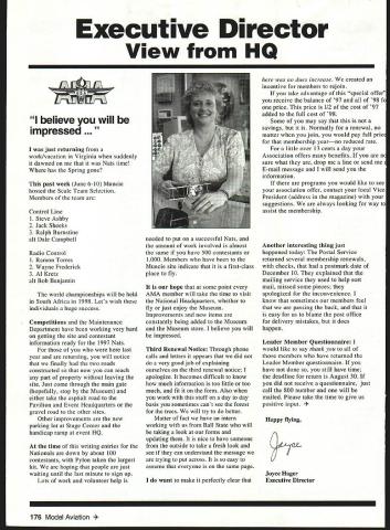 Executive Director View HQ believe will impressed. just returning work/vacation Virginia suddenly dawned Nats time has Spring gone past week June 6-10 Muncie hosted Scale Team Selection Members team Control Line 1 Steve Ashby 2 Jack Sheeks 3 Ralph Burnstine alt Dale Campbell Radio Control 1 Ramon Torres 2 Wayne Frederick 3 Al Kretz alt Bob Benjamin world championships will held South Africa 1998 Lets wish individuals huge success Competitions Maintenance Department have working very hard getting site contestant information ready 1997 Nats last year returning will notice finally two roads constructed now can reach part property leaving site Just come through main gate hopefully stop Museum either take asphalt road Pavilion Event Headquarters gravel road other sites Other improvements new parking lot Stage Center handicap ramp event HQ time writing entries Nationals down about 100 contestants Pylon taken largest hit hoping people just waiting until last minute sign up Lots work volunteer help needed put successful Nats amount work involved almost same have 500 contestants 1000 Members have Muncie site indicate first-class place fly hope some point AMA member will take time visit National Headquarters whether fly just enjoy Museum Improvements new items constantly being added Museum Museum store believe will impressed Third Renewal Notice Through phone calls letters appears did very good job explaining ourselves third renewal notice apologize becomes difficult know much information too little too much fit form Also work stuff day day basis sometimes cant see forest trees will try better Matter fact have intern working us Ball State will taking look forms updating nice have someone outside take fresh look see can understand message trying put across easy assume everyone same page want make perfectly clear no dues increase created incentive members rejoin take advantage special offer receive balance 97 98 fo price price 1/2 cost 97 added full cost 98 Some may say savings Normally renewal no matter join would pay full pric membership yearno reduced rate little over 13 cents day Association offers benefits m sure what drop line send E-mail message will send information programs would like see association offer contact local Vice President address magazine suggestions always looking way tc assist membership Another interesting thing just happened today Postal Service returned several membership renewals checks postmark date December 10 explained mailing service used help sort mail missed some pieces apologized inconvenience know sometimes members feel passing buck easy us blame post office delivery mistakes does happen Leader Member Questionnaire would like say thank members have returned Leader Member questionnaire have done still have time deadline return August 30 did receive questionnaire just call 800 number will mailed Please take time give us positive input y flying QL Joyce Hager Executive Director 176 Model Aviation