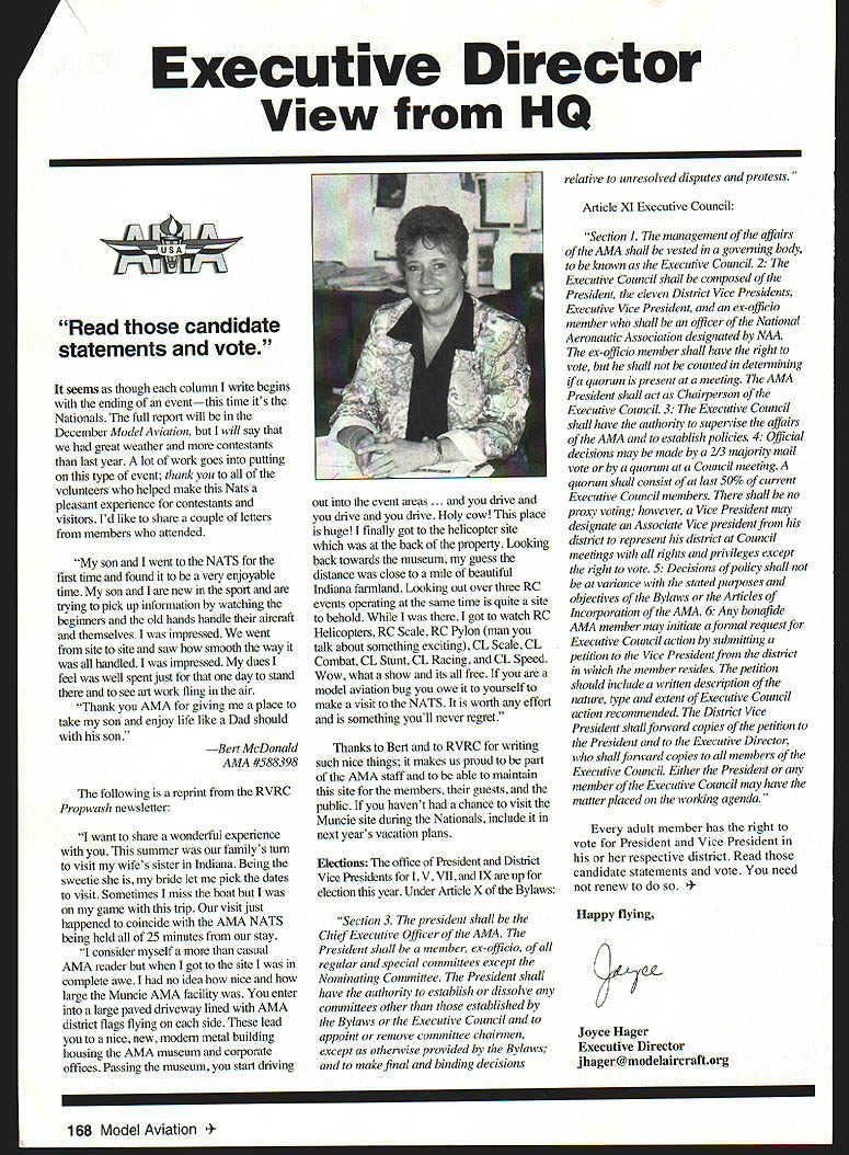 Executive Director View HQ Read candidate statements vote seems though column write begins ending eventthis time its Nationals full report will December Model Aviation will say great weather contestants last year lot work goes puffing type event thank volunteers helped make Nats pleasant experience contestants visitors Id like share couple letters members attended son went NATS first time found very enjoyable time son new sport trying pick up information watching beginners old hands handle aircraft themselves impressed went site site saw smooth way handled impressed dues feel well spent just day stand see art work fling air Thank AMA giving place take son enjoy life like Dad should son Bert McDonald AMA #588398 following reprint RVRC Propwash newsletter want share wonderful experience summer familys turn visit wifes sister Indiana Being sweetie bride let pick dates visit Sometimes miss boat game trip visit just happened coincide AMA NATS being held 25 minutes stay consider myself casual AMA reader got site complete awe no idea nice large Muncie AMA facility enter large paved driveway lined AMA district flags flying side lead nice new modern metal building housing AMA museum corporate offices Passing museum start driving out event areas . drive drive drive Holy cow place huge finally got helicopter site back property Looking back towards museum guess distance close mile beautiful Indiana farmland Looking out over three RC events operating same time quite site behold got watch RC Helicopters RC Scale RC Pylon man talk about something exciting CL Scale CL Combat CL Stunt CL Racing CL Speed Wow what show its free model aviation bug owe yourself make visit NATS worth effort something youll never regret Thanks Bert RVRC writing such nice things makes us proud part AMA staff able maintain site members guests public havent chance visit Muncie site during Nationals include next years vacation plans Elections office President District Vice Presidents V VII IX up election year Under Article X Bylaws Section 3 president shall Chief Executive Officer AMA President shall member ex-officio regular special committees except Nominating Committee President shall have authority establish dissolve committees other established Bylaws Executive Council appoint remove committee chairmen except otherwise provided Bylaws make final binding decisions relative unresolved disputes protests Article XI Executive Council Section] management affairs AMA shall vested governing body known Executive Council 2 Executive Council shall composed President eleven District Vice Presidents Executive Vice President ex-officio member shall officer National Aeronautic Association designated NAA ex-officio member shall have right vote shall counted determining quorum present meeting AMA President shall act Chairperson Executive Council 3 Executive Council shall have authority supervise affairs AMA establish policies 4 Official decisions may made 2/3 majority mail vote quorum Council meeting quorum shall consist last 50% current Executive Council members shall no proxy voting however Vice President may designate Associate Vice president district represent district Council meetings rights privileges except right vote 5 Decisions policy shall variance stated purposes objectives Bylaws Articles Incorporation AMA 6 Any bonafide AMA member may initiate aformal request Executive Council action submitting petition Vice President district member resides petition should include written description nature type extent Executive Council action recommended District Vice President shallforward copies petition President Executive Director shall forward copies members Executive Council Either President member Executive Council may have matter placed working agenda adult member has right vote President Vice President respective district Read candidate statements vote need renew y flying CL Joyce Hager Executive Director jhager@modelaircraftorg 168 Model Aviation