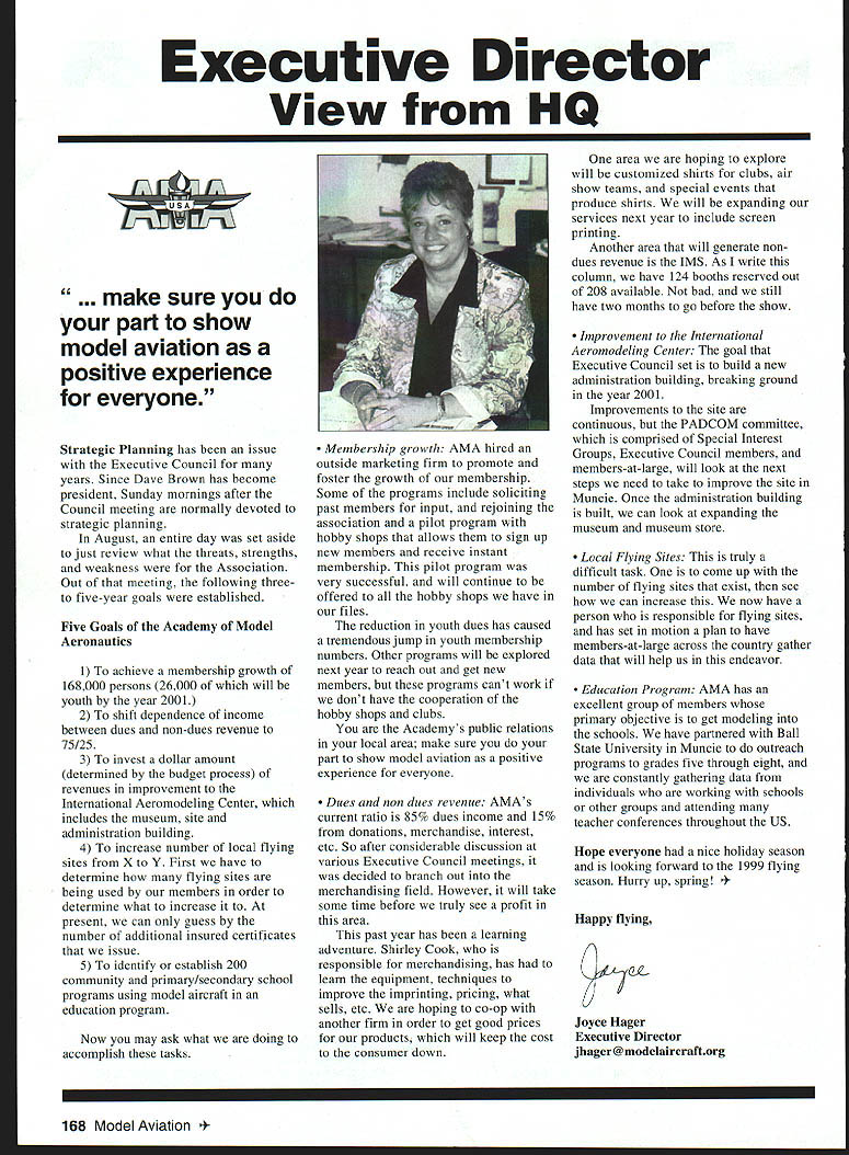 Executive Director View HQ .make sure part show model aviation positive experience everyone Strategic Planning has issue Executive Council years Since Dave Brown has become president Sunday mornings after Council meeting normally devoted strategic planning August entire day set aside just review what threats strengths weakness Association Out meeting following threeto five-year goals established Five Goals Academy Model Aeronautics 1 To achieve membership growth 168000 persons 26000 will youth year 2001 2 To shift dependence income between dues non-dues revenue 75/25 3 To invest dollar amount determined budget process revenues improvement International Aeromodeling Center includes museum site administration building 4 To increase number local flying sites X Y First have determine flying sites being used members order determine what increase present can guess number additional insured certificates issue 5 To identify establish 200 community primary/secondary school programs using model aircraft education program Now may ask what doing accomplish tasks Membership growth AMA hired outside marketing firm promote foster growth membership Some programs include soliciting past members input rejoining association pilot program hobby shops allows sign up new members receive instant membership pilot program very successful will continue offered hobby shops have files reduction youth dues has caused tremendous jump youth membership numbers Other programs will explored next year reach out get new members programs cant work dont have cooperation hobby shops clubs Academys public relations local area make sure part show model aviation positive experience everyone Dues non dues revenue AMAs current ratio 85% dues income 15% donations merchandise interest etc So after considerable discussion various Executive Council meetings decided branch out merchandising field However will take some time before truly see profit area past year has learning adventure Shirley Cook responsible merchandising has learn equipment techniques improve imprinting pricing what sells etc hoping co-op another firm order get good prices products will keep cost consumer down area hoping explore will customized shirts clubs air show teams special events produce shirts will expanding services next year include screen printing Another area will generate nondues revenue IMS As write column have 124 booths reserved out 208 available bad still have two months go before show Improvement International Aeromodeling Center goal Executive Council set build new administration building breaking ground year 2001 Improvements site continuous PADCOM committee comprised Special Interest Groups Executive Council members members-at-large will look next steps need take improve site Muncie Once administration building built can look expanding museum museum store Local Flying Sites truly difficult task come up number flying sites exist see can increase now have person responsible flying sites has set motion plan have members-at-large across country gather data will help us endeavor Education Program AMA has excellent group members primary objective get modeling schools have partnered Ball State University Muncie outreach programs grades five through eight constantly gathering data individuals working schools other groups attending teacher conferences throughout US Hope everyone nice holiday season looking forward 1999 flying season Hurry up spring y flying Joyce Hager Executive Director jhager@modelaircraftorg 168 Model Aviation