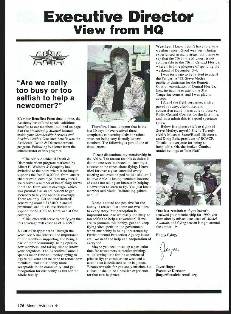 Executive Director View HQ IQf Are really too busy too selfish help newcomer Member Benefits time time Academy has offered special additional benefits members outlined page 2 Membership Manual located inside Membership Services Product Guide such benefit Accidental Death & Dismemberment program Following letter administrator program AMA Accidental Death & Dismemberment program marketed Albert H Woihers & Company has dwindled point no longer supports free $10000 chapter event coverage may recall received number beneficiary forms coverage promoted enticement get members buy optional coverage 130 optional insureds generating around $12000 annual premiums insufficient support $10000 free coverage letter will serve notify coverage will cease 1-1-99 Little Disappointed Through years AMA has stressed importance members supporting being part community being open new members taking time know neighbors Executive Council spends much time money trying figure out what can done attract new members make hobby acceptable community get recognition hobby fun whole family Therefore hate report last 30 days have received three complaints concerning clubs various areas being very friendly new members following part letters Please discontinue membership AMA reason decision no interested teaching newcomer ropes about flying have tried over year attended meeting helped build shelter believe AMA losing members because clubs taking interest helping newcomer learn fly just lost member Model Railroading gained Doesnt sound too positive hobby realize two sides story perception important too Are really too busy too selfish help newcomer promote hobby get keep flying sites petition government hobby being threatened Environmental Protection Agency issues etc need help cooperation everyone Maybe need set up particular time newcomers receive training still allowing time experienced pilot fly consider weekend month dedicated beginner Whatever works club least should positive experience new beginner Weather I know dont have give weather report Good weather being experienced areas have say 70s Midwest comparable 70s Central Florida pleasure spending weekend December 3-4 fortunate invited attend Tangerine 98 Steve Motley publicity chairman Remote Control Association Central Florida Inc invited attend 31st Tangerine contest glad accept found field very nice paved runway clubhouse concession stand able observe Radio Control Combat first time must admit good spectator sport Below picture left right Steve Motley myself Sheila Tweedy AMA Museum Store/Retail Director Doug Bolt president RCACF Thanks everyone being hospitable Oh broken Combat model belongs Tom Huff last reminder havent renewed membership 1999 have already missed issue Model Aviation flying season right around corner y flying Joyce Hager Executive Director jhager@modelaircraftorg 176 Model Aviation