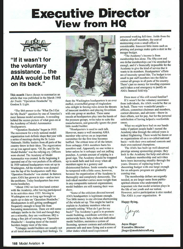 Executive Director View HQ wasnt voluntary assistance . AMA would flat its back month have chosen summarize article published March 1948 Air Trails Operation Headache Gordon S Light $64 answer What Get Buck question Americas famous model aeronauts revealing behind scenes picture what goes Academy Model Aeronautics Headquarters Operation Headache began 1935 movement truly national model organization took definite shape year series meetings during St Louis Nationals Hobby leaders parts country threw ideas organization set up agreed upon Model Builder rallying cry Officers elected Academy Model Aeronautics created beginning operated out vest pockets its officers 1939 national headquarters set up Washington troubles dumped lap headquarters staff thus Operation Headache started thirteen years AMA has grown sizeand have problems Today headquarters has worse headaches About 1942 lost first hand contact Academy afler having participated its activities since 1935 Moving Washington long ago brought us again up date Operation Headache Headquarters still getting sandbagged frequently enough keep life becoming monotonous still some unhappy lambs fold though minority vociferous HQ dong fine job carrying out Operation Headachekeeping model builders happy time Unhappy model builders usually timid about revealing feelings Washington headquarters over staffed overstuffed group ringleaders delight forcing rules down throats innocent modelers playing favoritism group another same rascals headquarters play hands pressure groups write rules suite manufacturers generally ignore poor little model builder Headquarters used such talk However well meaning AMA member serves important committee first time becomes baffled critical tone letters unhappy AMA members hurts sensitive soul Apparently no writes letter unless unhappy pulling punches certain amount sniping good sign Academy should wrapped up moth balls laid away members agree gummy disinterested fashion Snide remarks ought tempered little sense however because organization Academy thoroughly completely democratic individual member carries weight comparable national organization model builders still running won show Some criticism directed toward AMA headquarters legitimate enough Too little money obvious shortcoming whole set up might hard explain Academy members currently asking What get buck Academys goal promote model building coordinate activities nationwide basis help clubs individual model builders maintain system licensing sponsor contests exhibitions promote safe sane flying score other duties need experienced personnel working full time Aside salaries staff members cost maintaining small office considerable Innocent little items such printing postage make quite dent meager budget Academys income membership fees alone fifly-cent dollar memberships cant stretched far enough its financially impossible Academy give kind service wants its members Headquarters efforts necessity spread thin budget too small put staff members field contact groups parts country Theres just no money traveling expenses takes real emergency justify AMA financed field trip Does still sound familiar wasnt voluntary assistance individuals AMA would flat its back very wonderful peopleofficers committee chairmen members contest directors advisors-throw efforts pay personal satisfaction having helped worthwhile cause What might have hands today patient people hadnt nursed Academy idea though critical years indeed frightening would dozen organizations so-called national basis-with own national contests own national champions AMA has built up well-deserved prestige among sponsoring groups look Academy help advice Academy membership activities have increasing steadily through years Dreams replacing todays shoestring budget large enough adequate program gradually coming true membership dollars urgently needed larger sums publicspirited citizens understand important role model aviation plays life youth nation However active participation also needed AMA organization y flying CL Joyce Hager Executive Director jhager@modelaircraftorg 168 Model Aviation