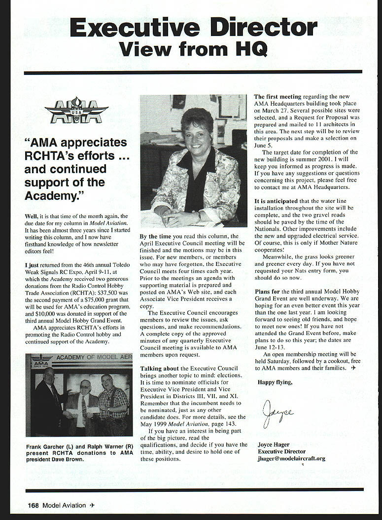 Executive Director View HQ 7II AMA appreciates RCHTAs efforts continued support Academy~ Well time month again due date column Model Aviation has almost three years since started writing column now have firsthand knowledge newsletter editors feel just returned 46th annual Toledo Weak Signals RC Expo April 9-11 Academy received two generous donations Radio Control Hobby Trade Association RCHTA $37500 second payment $75000 grant will used AMAs education program $10000 donated support third annual Model Hobby Grand Event AMA appreciates RCHTAs efforts promoting Radio Control hobby continued support Academy time read column April Executive Council meeting will finished motions may issue new members members may have forgotten Executive Council meets four times year Prior meetings agenda supporting material prepared posted AMAs Web site Associate Vice President receives copy Executive Council encourages members review issues ask questions make recommendations complete copy approved minutes quarterly Executive Council meeting available AMA members upon request Talking about Executive Council brings another topic mind elections time nominate officials Executive Vice President Vice President Districts III VII XI Remember incumbent needs nominated just other candidate does details see May 1999 ModelAviation page 143 have interest being part big picture read qualifications decide have time ability desire hold positions first meeting regarding new AMA Headquarters building took place March 27 Several possible sites selected Request Proposal prepared mailed 11 architects area next step will review proposals make selection June 5 target date completion new building summer 2001 will keep informed progress made have suggestions questions concerning project please feel free contact AMA Headquarters anticipated water line installation throughout site will complete two gravel roads should paved time Nationals Other improvements include new upgraded electrical service course Mother Nature cooperates Meanwhile grass looks greener greener day have requested Nats entry form should now Plans third annual Model Hobby Grand Event well underway hoping better event year last year am looking forward seeing old friends hope meet new ones have attended Grand Event before make plans year dates June 12-13 An open membership meeting will held Saturday followed cookout free AMA members families 4Happy flying Joyce Hager Executive Director jhager@modelaircraftorg 168 Model Aviation k Garcher L Ralph Warner R present RCHTA donations AMA president Dave Brown