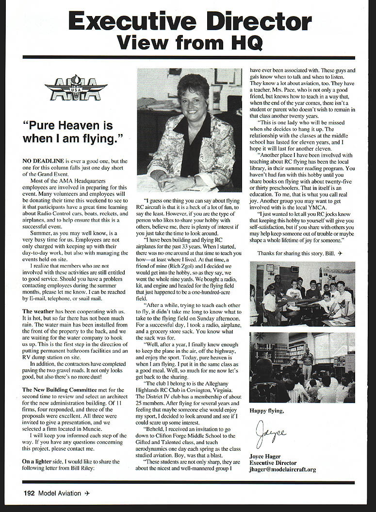 Executive Director View HQ fr7f Pure Heaven am flying NO DEADLINE ever good column falls just day short Grand Event Most AMA Headquarters employees involved preparing event volunteers employees will donating time weekend see participants have great time learning about Radio Control cars boats rockets airplanes help ensure successful event Summer may well know very busy time us Employees charged keeping up day-to-day work also managing events held site realize members involved activities still entitled good service Should have problem contacting employees during summer months please let know can reached E-mail telephone snail mail weather has cooperating us hot far has much rain water main has installed front property back waiting water company hook us up first step direction putting permanent bathroom facilities RV dump station site addition contractors have completed paving two gravel roads looks good also theres no dust New Building Committee met second time review select architect new administration building 11 firms four responded three proposals excellent three invited give presentation selected firm located Muncie will keep informed step way have questions concerning project please contact lighter side would like share following letter Bill Riley guess thing can say about flying RC aircraft heck lot fun say least However type person likes share hobby others believe plenty interest just take time look around have building flying RC airplanes past 33 years started no around time teach howat least lived time friend Rich Zgol decided would get hobby say went whole nine yards bought radio kit engine headed flying field just happened one-hundred-acre field After trying teach other fly didnt take long know what take flying field Sunday afternoon successful day took radio airplane grocery store sack know what sack Well after year finally knew enough keep plane air off highway enjoy sport Today pure heaven am flying put same class good meal Well much now lets get back sharing club belong Alleghany Highlands RC Club Covington Virgiaia District IV club has membership about 25 members After flying several years feeling maybe someone else would enjoy sport decided look around see could scare up some interest Behold received invitation go down Clifton Forge Middle School Gifted Talented class teach aerodynamics day spring class studied aviation Boy blast students sharp about nicest well-mannered group have ever associated guys gals know talk listen know lot about aviation too have teacher Mrs Pace good friend knows teach way end year comes isnt student parent doesnt wish remain class another twenty years lady will missed decides hang up relationship classes middle school has lasted eleven years hope will last another eleven Another place have involved teaching about RC flying has local library summer reading program havent fun hobby until share books flying about twenty-five thirty preschoolers itself education what call real joy Another group may want get involved local YMCA just wanted let RC jocks know keeping hobby yourself will give self-satisfaction share others may help keep someone out trouble maybe shape whole lifetime ofjoy someone Thanks sharing story Bill Model Aviation y flying Joyce Hager Executive Director jhager@modelaircraftorg