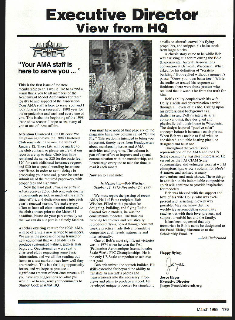 Executive Director View HQ IM7F\ AMA staff serve first issue new membership year would like extend warm thank members Academy Model Aeronautics loyalty support association AMA staff serve look forward successful 1998 year organization also beginning 1998 trade show season hope see affairs Attention Chartered Club Officers planning have 1998 Chartered Club renewals mail week January 12 kits will mailed club contact please ensure records up date Club fees have remained same $20 basic fee $20 additional insurance request $30 special wording insurance certificate order avoid delays processing renewal please sure submit required paperwork proper fees signature Now hard part Please patient AMA receives 2500 club renewals during two-month period much staffs time effort dedication goes years renewal season make effort have club material returned club contact prior March 31 deadline Please part correctly can part timely fashion Another exciting venture 1998 AMA will offering new service members process being trained new equipment will enable us produce customized t-shirts jackets hats bags etc Questionnaires sent chartered clubs requesting some basic information will sending out items test market see well received thrilling opportunity us hope produce significant amount non-dues revenue have suggestions what would like see send comments Shirley Cook AMA HQ may have noticed page six magazine has new column called Fly section intended bring important timely news Headquarters about membership issues AMA activities programs column part effort improve expand communication membership encourage everyone take time read month Now sad note Memo riamBob Wischer October 12 1915-November 24 1997 must report passing recent AMA Hall Fame recipient Bob Wischer Filled passion designing building flying Radio Control Scale models consummate modeler flawless building techniques realistically reproduced flying honed through constant weekly practice made Bob formidable competitor levels nationally internationally Bobs significant victories 1974 won FAJ Federation Aeronautique Internationale Scale World F4C Championships US Scale competitor achieve goal Bob epitomized scratch-builder skills extended far beyond ability translate aircrafts photos measurements necessary threeviews plans produce model developed unique processes simulating details aircraft carved flying propellers stripped balsa stock large blocks classic story came Bob assisting forum during EAA Experimental Aircraft Association convention Oshkosh Wisconsin asked definition scratch building Bob replied moments pause Grow own balsa tree audience treated response fictitious present realized wasnt far truth him Bobs ability coupled wife Dollys skills determination carried through levels life Calling upon professional background draftsman Dollys interests conservationist designed physically built home Wisconsin design featured passive solar concepts before became catch-phrase Bob unable find what considered suitable heating plant designed built Throughout years Bobs representation AMA US Scale community impressive served FAI ClAM Scale subcommittee did volunteer work world championships wrote column Model Aviation assisted conventions trade shows things addition indomitable competitive spirit will continue provide inspiration modelers Bob blessed support love wife Dolly everpresent assisting way possible May know worldwide aeromodeling community reaches out love prayers support enfold family has requested memorials Bobs name designated Frank Ebling Museum Scholarship Fund Underwood Happy flying Joyce Hager Executive Director jhager@modelaircraftorg March 1998 176