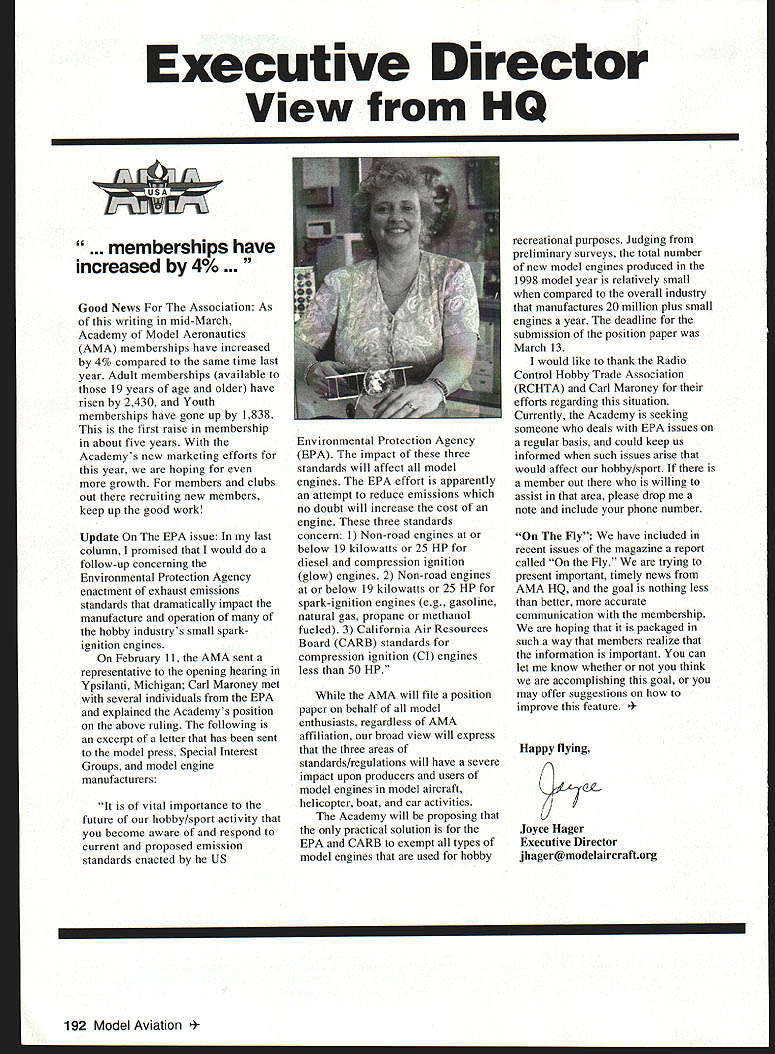Executive Director View HQ .memberships have increased 4%. Good News Association As writing mid-March Academy Model Aeronautics AMA memberships have increased 4% compared same time last year Adult memberships available 19 years age older have risen 2430 Youth memberships have gone up 1838 first raise membership about five years Academys new marketing efforts year hoping growth members clubs out recruiting new members keep up good work Update EPA issue last column promised would follow-up concerning Environmental Protection Agency enactment exhaust emissions standards dramatically impact manufacture operation of hobby industrys small sparkignition engines February 11 AMA sent representative opening hearing Ypsilanti Michigan Carl Maroney met several individuals EPA explained Academys position above ruling following excerpt letter has sent model press Special Interest Groups model engine manufacturers vital importance future hobby/sport activity become aware respond current proposed emission standards enacted US Environmental Protection Agency EPA impact three standards will affect model engines EPA effort apparently attempt reduce emissions no doubt will increase cost engine three standards concern 1 Non-road engines below 19 kilowatts 25 HP diesel compression ignition glow engines 2 Non-road engines below 19 kilowatts 25 HP spark-ignition engines eg gasoline natural gas propane methanol fueled 3 California Air Resources Board CARB standards compression ignition CI engines less 50 HP AMA will file position paper behalf model enthusiasts regardless AMA affiliation broad view will express three areas standards/regulations will have severe impact upon producers users model engines model aircraft helicopter boat car activities Academy will proposing practical solution EPA CARB exempt types model engines used hobby recreational purposes Judging preliminary surveys total number new model engines produced 1998 model year relatively small compared overall industry manufactures 20 million plus small engines year deadline submission position paper March 13 would like thank Radio Control Hobby Trade Association RCHTA Carl Maroney efforts regarding situation Currently Academy seeking someone deals EPA issues regular basis could keep us informed such issues arise would affect hobby/sport member out willing assist area please drop note include phone number Fly have included recent issues magazine report called Fly trying present important timely news AMA HQ goal nothing less better accurate communication membership hoping packaged such way members realize information important can let know whether think accomplishing goal may offer suggestions improve feature 4Happy flying Joyce Hager Executive Director jhager@modelaircraftorg 192 Model Aviation