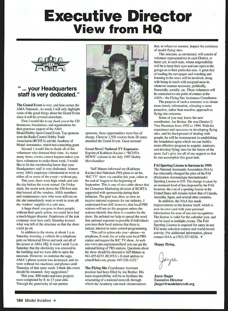 Executive Director View HQ .your Headquarters staff very dedicated Grand Event over comes AMA Nationals As usual will highlight some good things about Grand Event since will covered elsewhere First would like say thank 120 businesses foundations organizations generous support AMA ModellHobby Sport Grand Event lop sponsors Radio Control Hobby Trade Association RCHTA Academy Model Aeronautics matching grant Second would like thank volunteers donated time As stated times events cannot happen unless have volunteers make work would like let membership know Headquarters staff very dedicated Almost AMA employee volunteered work either some eventwithout pay year high winds rain day before event started Friday night storm took down 350-foot tent housed vendors AMA members maintenance crew still out site immediately went work store vendors supplies safe area huge thank von goes people quick action could have much bigger disaster Employees tent company early Saturday erect what left structure show could go addition storm about 1 am Saturday morning vehicle hit telephone pole Memorial Drive took out power AMA HQ wasnt until 3 pm Saturday electricity restored building able open museum However continue saga s phone system destroyed fax machines phones until Thursday same week think event should renamed Any suggestions year 800 make-and-take projects completed 8- 1 7-year-olds Through generosity partner sponsors opportunities free charge Close 3500 visitors 28 states attended Grand Event Great turnout Great News National TV Exposure Reprint Kathleen Racines RCHTA NEWS column July 1997 Hobby Merchandiser Jeff Maturo informed Kathleen Racine Nationals PBS plans air R/C TV show via satellite year either end August beginning September two cable shows Consumer Marketing division RCHTA supported sponsorship during infancies goal now receive national exposure industry understand Jeff however local PBS stations will air program unless stations identify market show enlisted help spread word national exposure possible individuals convince local stations indeed interest radio control programming call action asks youpleaseto telephone E-mail fax write local PBS station request R/C TV show web site wwwpbsorglstations/html can get national listing PBS stations Questions about show should directed Jeff Maturo 941455-6233 RCHTAs E-mail address rchta@Indcom phone 847-526-1222 Flying Site Coordinator Assistant position filled Joe Beshar main responsibility will facilitate structuring national network through Academy can track circumstances whatever manner impact existence model flying sites structure envisioned will consist volunteer representatives District better yet state responsibility will keep eyes ears open goings-on particular area great deal reading newspaper watching listening news will involved along being touch assigned areas whatever manner necessary politically financially socially etc volunteers will connected point contact AMAthe Flying Site Assistance Coordinator purpose such structure obtain timely information allowing proactive rather reactive approach flying site concerns Some may know new coordinator Joe Beshar District II Vice President 1992 1994 experience successes developing flying sites background dealing people will instrumental establishing foundation upon can build effective program acquire maintain develop flying sites future sport Lets give Joe support can accomplish great task FAT Sporting License Increase 1999 National Aeronautic Association NAA has reluctantly changed price FM Federation Aeronautique Intemationale Sporting License $35 change cause increased level fees imposed FM however cost sporting license United States still remains below Canada Australia Japan several other countries addition NAA has made improvements license itself now its own card personal information ease use recognition license valid calendar year can used multiple events FAI Sporting License required entry FAI team selection contest world record activity additional information please contact NAA 703 527-0226 y flying Joyce Hager Executive Director jhager@modelaircraftorg 184 Model Aviation