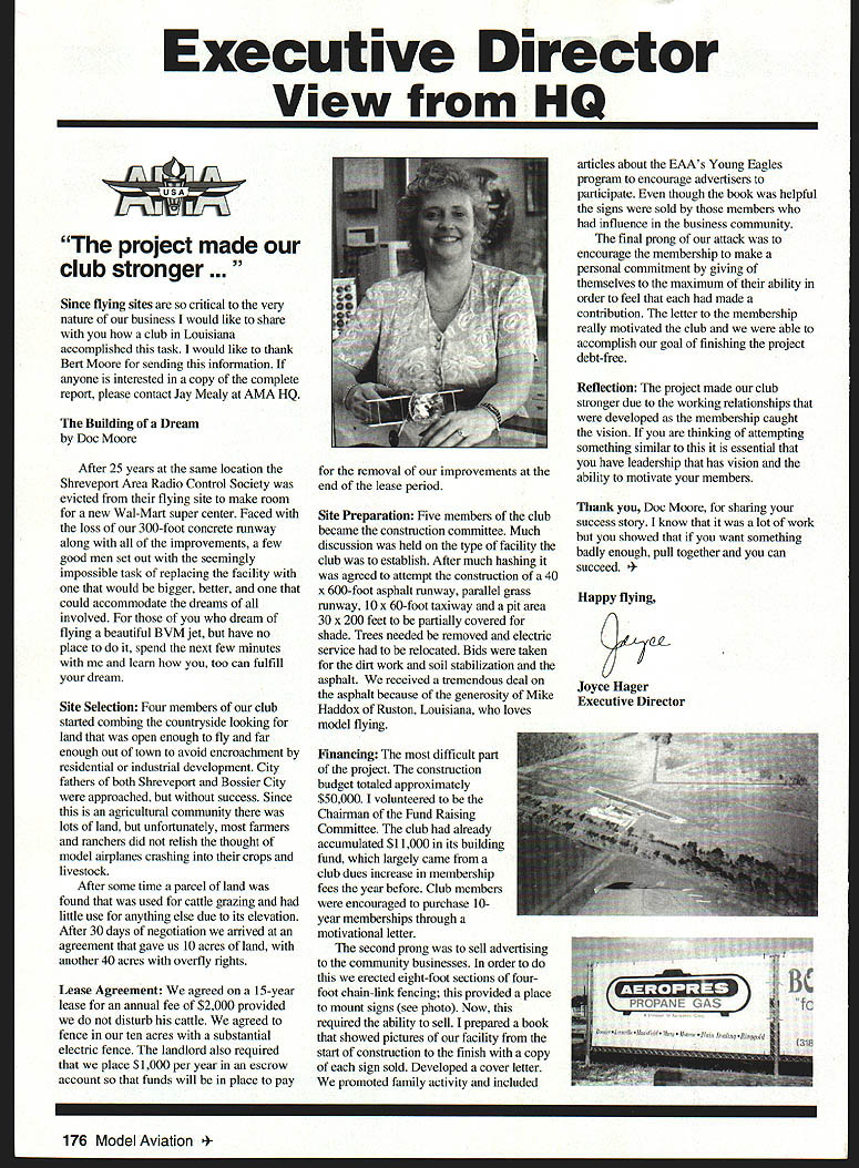 Executive Director View HQ f17\ project made club stronger Since flying sites critical very nature business would like share club Louisiana accomplished task would like thank Bert Moore sending information anyone interested copy complete report please contact Jay Mealy AMA HQ Building Dream Doc Moore After 25 years same location Shreveport Area Radio Control Society evicted flying site make room new Wal-Mart super center Faced loss 300-foot concrete runway along improvements few good men set out seemingly impossible task replacing facility would bigger better could accommodate dreams involved dream flying beautiful BVM jet have no place spend next few minutes learn too can fulfill dream Site Selection Four members club started combing countryside looking land open enough fly far enough out town avoid encroachment residential industrial development City fathers both Shreveport Bossier City approached success Since agricultural community lots land unfortunately farmers ranchers did relish thought model airplanes crashing crops livestock After some time parcel land found used cattle grazing little use anything else due its elevation After 30 days negotiation arrived agreement gave us 10 acres land another 40 acres overfly rights Lease Agreement agreed 15-year lease annual fee $2000 provided disturb cattle agreed fence ten acres substantial electric fence landlord also required place $1000 per year escrow account funds will place pay removal improvements end lease period Site Preparation Five members club became construction committee Much discussion held type facility club establish After much hashing agreed attempt construction 40 x 600-foot asphalt runway parallel grass runway 10 x 60-foot taxiway pit area 30 x 200 feet partially covered shade Trees needed removed electric service relocated Bids taken dirt work soil stabilization asphalt received tremendous deal asphalt because generosity Mike Haddox Ruston Louisiana loves model flying Financing difficult part project construction budget totaled approximately $50000 volunteered Chairman Fund Raising Committee club already accumulated $11000 its building fund largely came club dues increase membership fees year before Club members encouraged purchase 10year memberships through motivational letter second prong sell advertising community businesses order erected eight-foot sections fourfoot chain-link fencing provided place mount signs see photo Now required ability sell prepared book showed pictures facility start construction finish copy sign sold Developed cover letter promoted family activity included articles about EAAs Young Eagles program encourage advertisers participate though book helpful signs sold members influence business commualty final prong attack encourage membership make personal commitment giving themselves maximum ability order feel made contribution letter membership really motivated club able accomplish goal finishing project debt-free Reflection project made club stronger due working relationships developed membership caught vision thinking attempting something similar essential have leadership has vision ability motivate members Thank Doc Moore sharing success story know lot work showed want something badly enough pull together can succeed y flying Joyce Hager Executive Director 176 Model Aviation