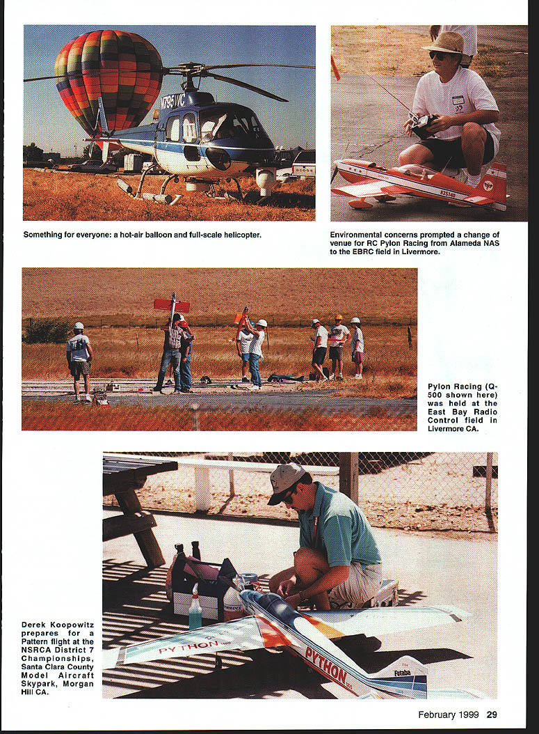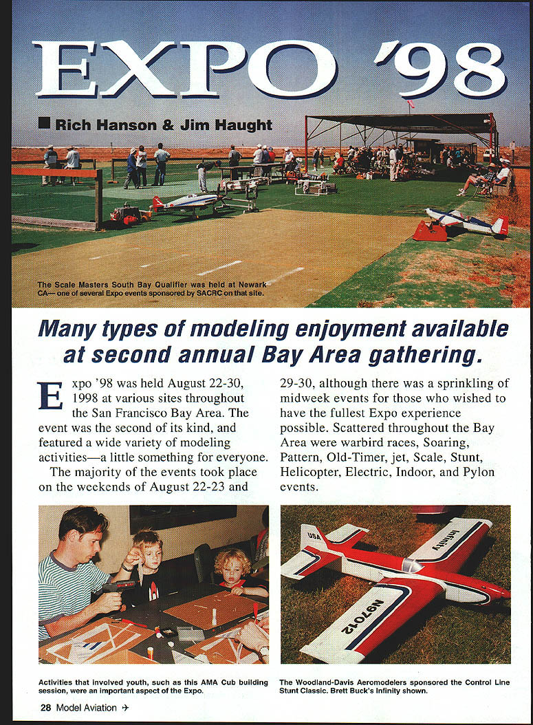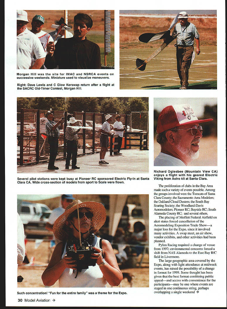 Many types modeling enjoyment available second annual Bay Area gathering E xpo 98 held August 22-30 1998 various sites throughout San Francisco Bay Area event second its kind featured wide variety modeling activitiesa little something everyone majority events took place weekends August 22-23 29-30 although sprinkling midweek events wished have fullest Expo experience possible Scattered throughout Bay Area warbird races Soaring Pattern Old-Timer jet Scale Stunt Helicopter Electric Indoor Pylon events 28 Model Aviation vities involved youth such AMA Cub building Woodland-Davis Aeromodelers sponsored Control Line session important aspect Expo Stunt Classic Brett Bucks Infinity shown Something everyone hot-air balloon full-scale helicopter Environmental concerns prompted change venue RC Pylon Racing Alameda NAS EBRC field Livermore Pylon Racing 0500 shown held East Bay Radio Control field Livermore CA Derek Koopowitz prepares Pattern flight NSRCA District 7 Championships Santa Clara County Model Aircraft Skypark Morgan Hill CA February 1999 29 proliferation clubs Bay Area made such variety events possible Among groups involved Tomcats Santa Clara County Sacramento Area Modelers Oaldand Cloud Dusters South Bay Soaring Society Woodland-Davis Aeromodelers Pioneer RC Bayside RC South Alameda County RC several others placing Moffett Federal Airfield alert status forced cancellation Aeromodeling Exposition Trade Showa major loss Expo since involved activities swap meet alr show vendor exhibits other activities planned Pylon Racing required change venue 1997 environmental concerns forced shift NAS Alameda East Bay RIC field Livermore large geographic area covered Expo along light attendance midweek events has ralsed possibility change format 1999 Some thought has given best format combining public appealand access convenience participantsmay events staged continuous string perhaps overlapping single weekend odel Aviation an Hill site IMAC NSRCA events successive weekends Miniature used visualize maneuvers Right Dave Lewis C Glow Kerswap return after flight SACRC Old-Timer Contest Morgan Hill Several pilot stations kept busy Pioneer RC sponsored Electric Fly-In Santa Clara CA Wide cross-section models sport Scale flown Richard Oglesbee Mountain View CA enjoys flight geared Electric Viking Astro kit Santa Clara Such concentration Fun entire family theme Expo Bayside RC Fremont site Helicopter Fly-In number clubs o p e r t e d concessions stands feed hungry fliers spectators February 1999 31 kids lots fun working own get Free Contest Director Lisa Bruml makes point during pilots Flight Rubber models wound ready flight meeting prior Pattern event Morgan Hill