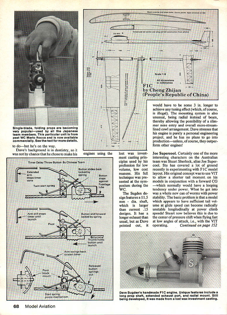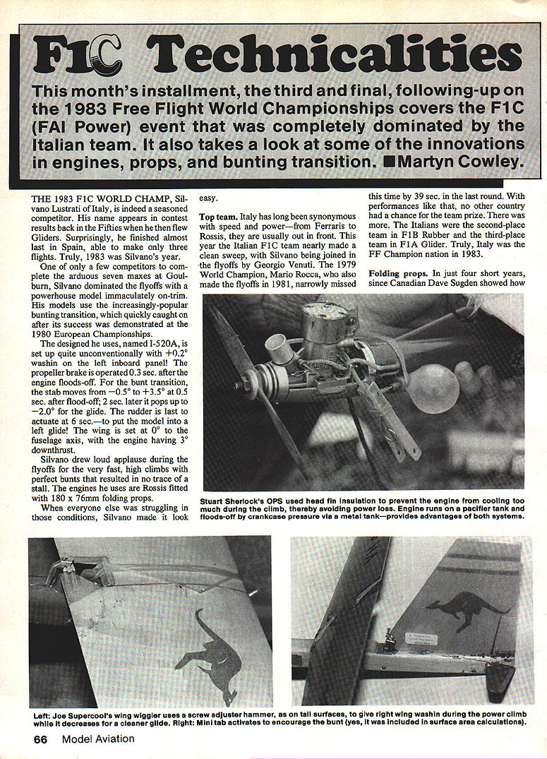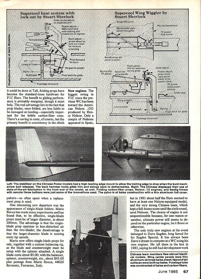 THE 1983 FiC WORLD CHAMP Sil vano Lustrati Italy indeed seasoned competitor name appears contest results back Fifties flew Gliders Surprisingly finished almost last Spain able make three flights Truly 1983 Silvanos year few competitors com plete arduous seven maxes Goul burn Silvano dominated flyoffs powerhouse model immaculately on-trim models use increasingly-popular bunting transition quickly caught after its success demonstrated 1980 European Championships designed uses named I-520A set up quite unconventionally O2 washin left inboard panel propeller brake operated03 sec afterthe engine floods-off bunt transition stab moves 05 350 05 sec after flood-off 2 sec later pops up 20 glide rudder last actuate 6 secto put model left glide wing set 00 fuselage axis engine having 30 downthrust Silvano drew loud applause during flyoffs very fast high climbs perfect bunts resulted no trace stall engines uses Rossis fitted 180 x 76mm folding props everyone else struggling conditions Silvano made look easy Top team Italy has long synonymous speed powerfrom Ferraris Rossis usually out front year Italian Fl C team nearly made clean sweep Silvano being joined flyoffs Georgio Venuti 1979 World Champion Mario Rocca also made flyoffs 1981 narrowly missed time 39 sec last round performances like no other country chance team prize Italians second-place team F 1 B Rubber third-place team FlA Glider Truly Italy FF Champion nation 1983 Folding props just four short years since Canadian Dave Sugden showed Left Joe Supercools wing wiggler uses screw aajuster nammer taii surfaces give right wing washin during power climb whiie decreases cleaner giide Right Mini tab activates encourage bunt yes inciuded surface area caicuiatlons 66 Model Aviation Stuart Sheriocks OPS used head fin insuiation prevent engine cooling too much during ciimb thereby avoiding power ioss Engine runs pacifier tank floods-off crankcase pressure via metai tankprovides advantages both systems patternso often upset replace ment prop used interesting new departure appearance single-blade folders Mario Rocca has made experiments has found effective single-blade props must larger diameter about 200mm advantage singleblade prop operates less-disturbed air two-blader disadvantage larger-diameter blade nearing sonic tip speeds Mario now offers single-blade props sale together custom balancing rig blade counterweight must setup spinner attached single blade costs about $900 balancer spinner counterweight etc about $4500 plus postage Mario Rocca 44020 Rovereto Ferrarese Italy 1983 about half fliers seemed have least Nelson-equipped model very strong Chinese team kept full-house score until sixth round used Nelsons choice engine unquestionable because reason another ultimate power still seems de pend particular englne Rossi otherwise truly new engines event belonged Dave Sugden long famed Sugden Special has always Daves dream compete WC using own engines left box 1983 saying still development work Chinese team members flew almost identi cal models Wing center panels thin aluminum-skinned balsa sheet tips tail surfaces built-up balsa Fuselage tube constructed balsa carbon fIbers June1985 67 Fusel could done Taft folding props have become standard-issue hardware F1C fliers benefit gliding perform ance probably marginal though must help real advantage lies fact prop blades once folded less liable damaged landingespecially impor tant brittle carbon-fiber ones Theres saving costs course primary benefit consistency climb Left stabilizer Chinese Power models high leading edge mount allow trailing edge drop bunt mech anism bolt released back hammer holds glide trim swings back dethermalize Right Chinese displayed use state-of-the-art fabrication front end model well Folding carbon-fiber props Nelson 15 engines Seelig timers remote throw buttons just some innovations used pylon balsa construction thin aluminum foil cover rleo engines using lost wax investment casting prin ciples used profession low volume low cost reasons full technique pre sented sym posium during wC Sugden de sign features 115 mm din shaft larger current 15 designs has longer exhaust usual Dave pointed out Joe Supercool Certainly interesting characters Australian team Stuart Sherlock alias Joe Super cool Stu has covered lot ground recently experimenting F 1 C model layout original concept use VIT allow shorter tail moment models conjunction forward CG normally would have looping tendency under power What got whole new can worms power stability basic problem model appears have sufficient tail vol ume glide speed can become radically unstable longitudinally power climb speeds Stuart now believes due center pressure shift flying fast low angles attack ie VIT operating Continued page 152 68 Model Aviation uIngIe-Dlaae ToldIng props oscoming very popularused Japanese team members particular unit past WC Mario Rocca now available commercially See text details dobut hes way Daves background dentistry chance chose make elay Throi would have some 3 longer achieve tuning effect course illegal mounting system also unusual being radial instead beam thereby allowing possibility slim mer nose entry overall more-stream lined cowl arrangement Dave stresses engine purely personal engineering project has no plans go productionunless course outper form other engines Dave Sugdens handmade PlC engine Unique features include long prop shaft extended exhaust port radial mount Still being developed made lost wax Investment casting ELECTRIC MODEL SAILPLANE SPECIALISTS 1981 World Soaring Champ DWIGHT HOLLEY IS PROUD TO ANNOUNCE NEW COMPANY TO HELP BOTH BEGINNER & EXPERT FLY INTO THE NEW ERA OF ELECTRIC AIRCRAFT WE ALSO OFFER SELECT FEW PURE SAILPLANES 4 DEMONSTRATION FLIGHTS CHECK OUT ANDIOR TEST FLIGHTS OF I0OR NEW PLANES CALL OR WRITE 5FOR FREE DESCRIPTIVE FLYER O UPS COD FOR IMMEDIATE SHIPMENT ELECTRIC KITS IN STOCK AEROBATIC OLOTIMER SPORTSCALE GLIDERS HOLLEYS SILENT FLIGHT 203 748-0083 151 CHESTNUT RIDGE ROAD BE