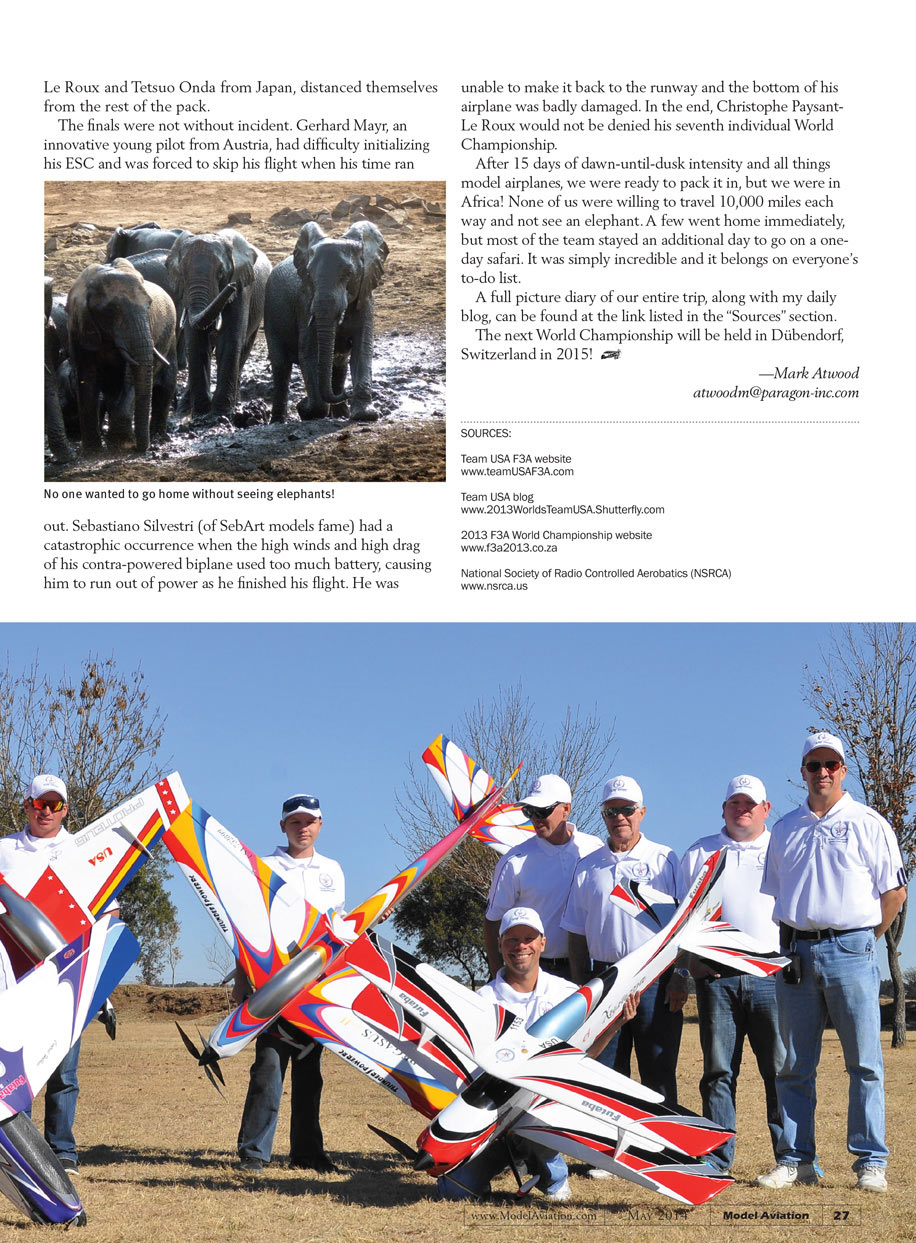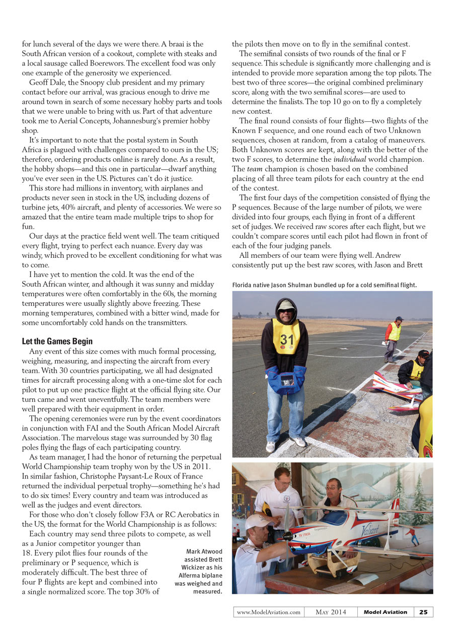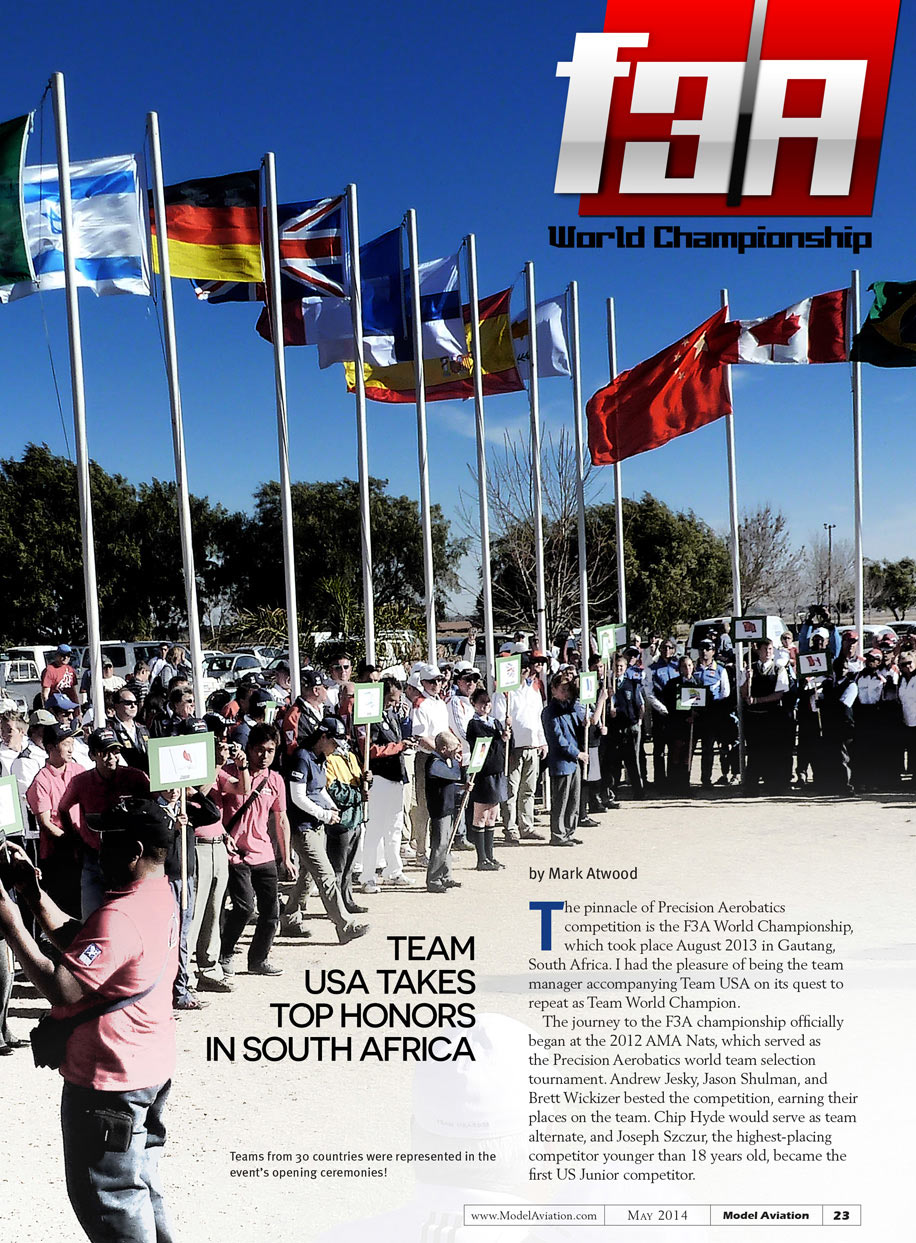 The pinnacle of Precision Aerobatics competition is the F3A World Championship, which took place August 2013 in Gautang, South Africa. I had the pleasure of being the team manager accompanying Team USA on its quest to repeat as team World Champions.