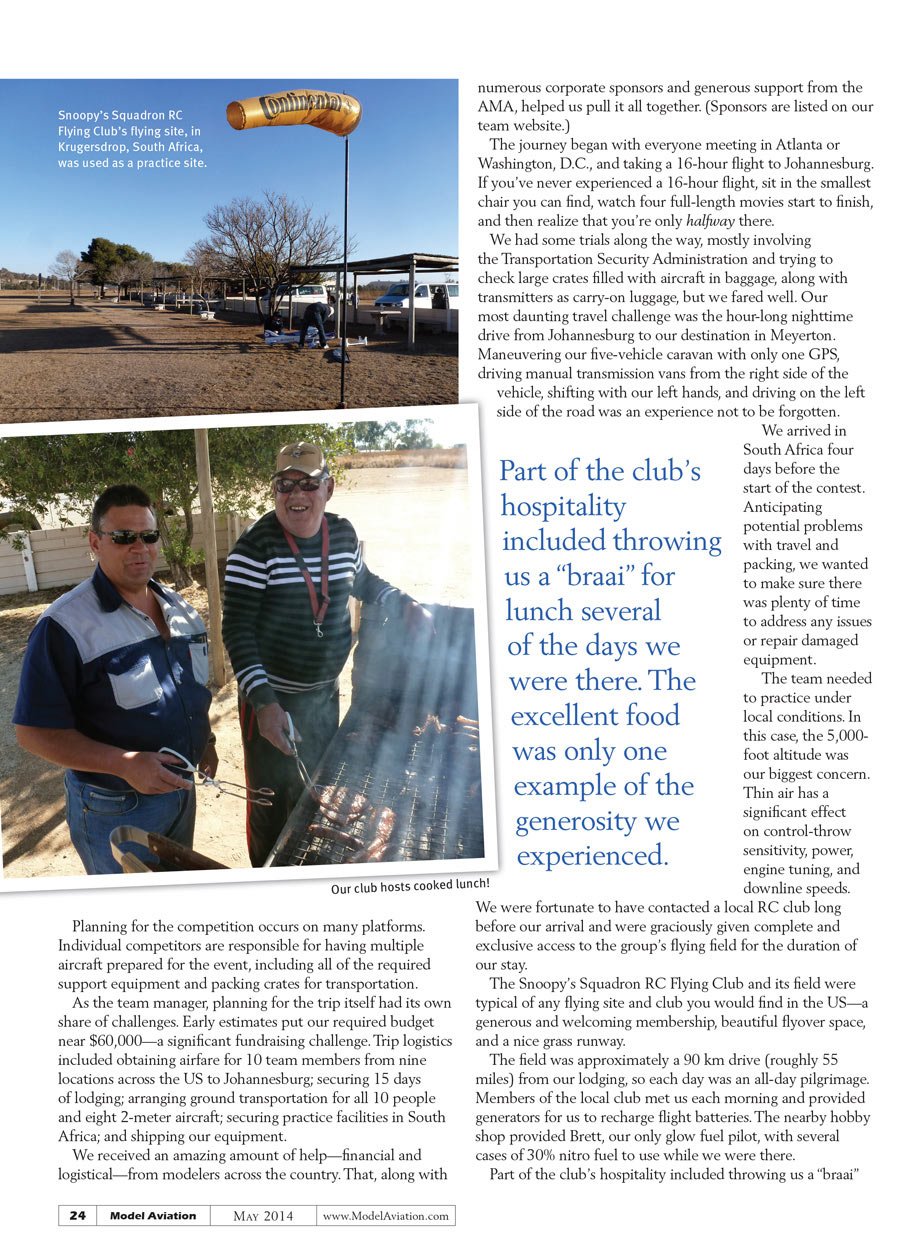 We did have some trials along the way, mostly involving the Transportation Security Administration and trying to check large crates filled with aircraft in baggage, along with RF transmitters as carry-on luggage, but we fared well. Our most daunting travel challenge was the hour-long nighttime drive from Johannesburg to our destination in Meyerton. Maneuvering our five-vehicle caravan with only one GPS, driving manual transmission vans from the right side of the vehicle, shifting with our left hands, on the left side of the road was an experience not to be forgotten.