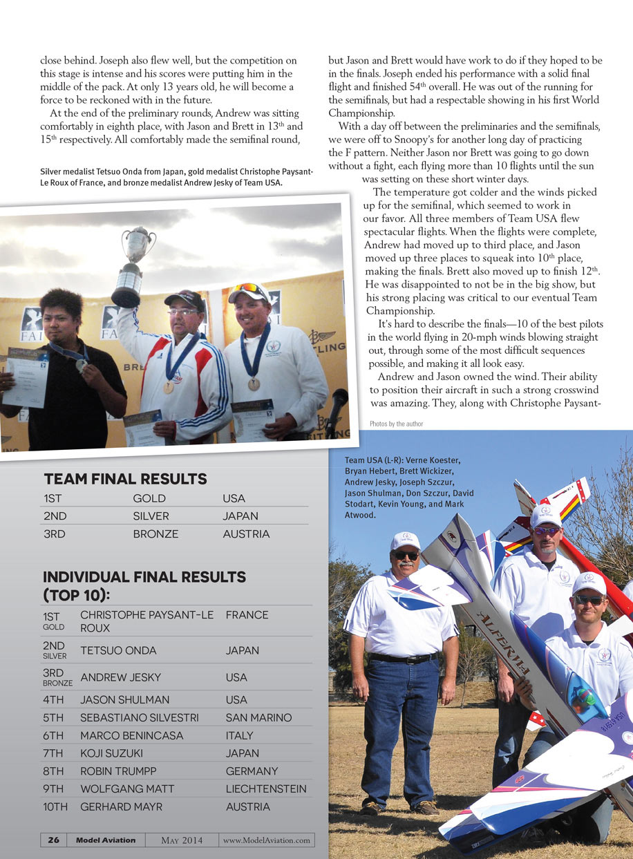 The journey to the F3A championship officially began at the 2012 AMA Nats which served as the official Precision Aerobatics world team selection tournament. Andrew Jesky, Jason Shulman, and Brett Wickizer bested the competition, earning their places on the team. Chip Hyde would serve as team alternate, and Joseph Szczur, the highest placing competitor under 18 years old, became the first US Junior competitor.