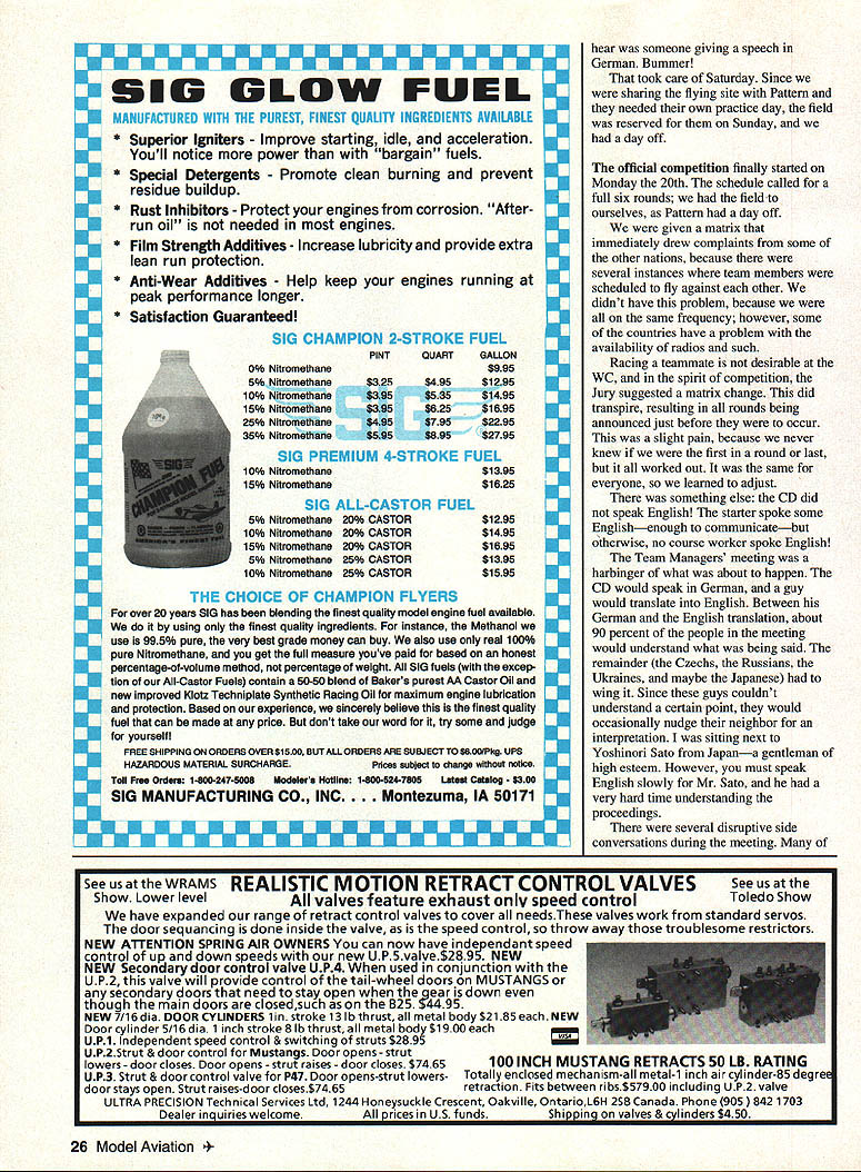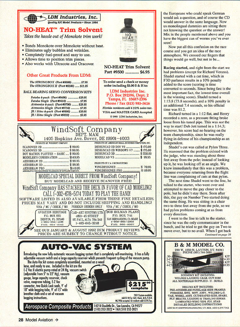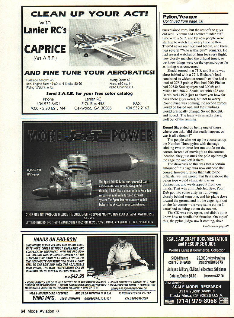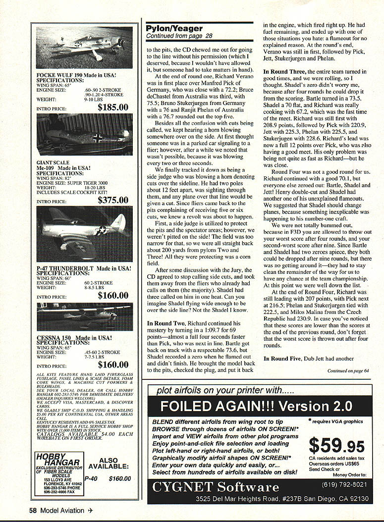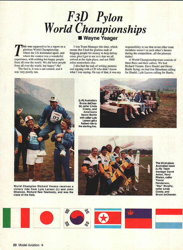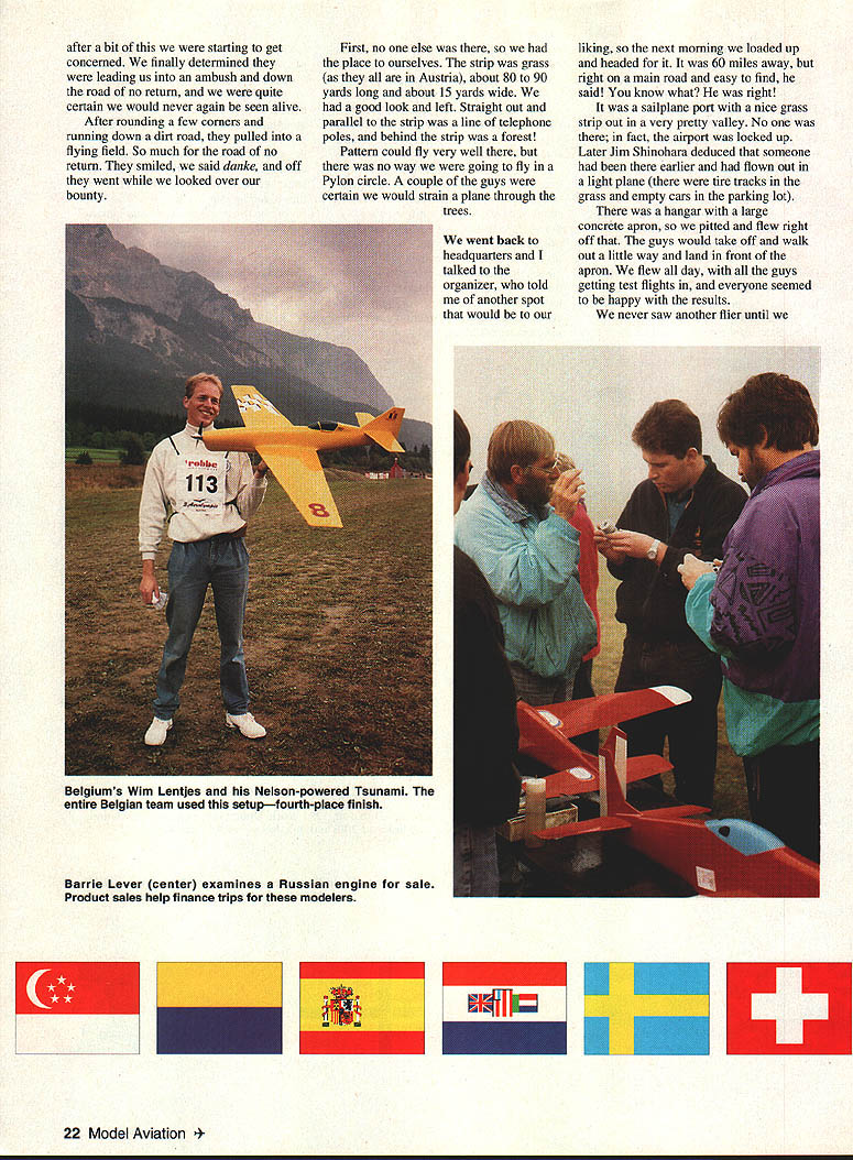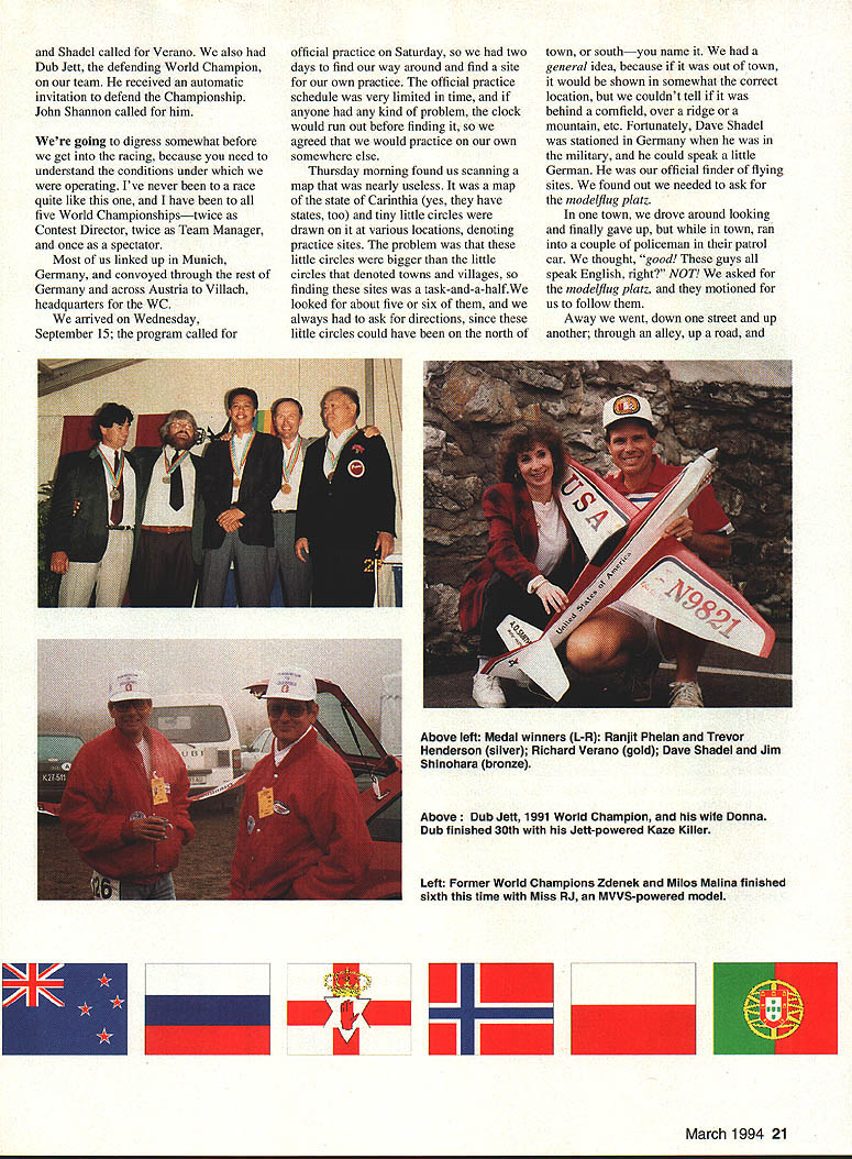 Pylon F3D World Championships U Wayne Yeager supposed report glorious World Championship US dominated again contest wonderful experience nothing happy people over world did have people over world happy Ha fact sad contest very poorly run Team Manager time means glorious task begging people money help defray costs plus got see arrived right place 5000 miles somewhere else also task writing protests arguing CD didnt know what saying top responsibility see seven other team members werent others throats daring competition.all pleasant duties World Championship team consists three fliers callers Richard Verano Dave Shadel Henry Bartle flying Jim Shinohara calling Shadel Lyle Larson calling Bartle L-R Ausfralias Bruce deChas tel caller Linda Creely Americans Henry Bartle caller Lyle Larson get flatbed ride starting line I/I 4 third-place Australian team L-R Team manager David Axton Ranji Phelan caller Trevor Henderson Baz Murphy caller Linda Creely Bruce deChastel 20 Model Aviation d Champion Richard Verano receives victory ride Lyle Larson L John Shannon Richard flew flawlessly class field Shadel called Verano also Dub Jett defending World Champion team received automatic invitation defend Championship John Shannon called him going digress somewhat before get racing because need understand conditions under operating Ive never race quite like have five World Championshipstwice Contest Director twice Team Manager once spectator Most us linked up Munich Germany convoyed through rest Germany across Austria Villach headquarters WC arrived Wednesday September 15 program called official practice Saturday two days find way around find site own practice official practice schedule very limited time anyone kind problem clock would run out before finding agreed would practice own somewhere else Thursday morning found usscanning map nearly useless map state Carmnthia yes have states too tiny little circles drawn various locations denoting practice sites problem little circles bigger little circles denoted towns villages finding sites task-and-a-halfWe looked about five six always ask directions since little circles could have north town southyou name general idea because out town would shown somewhat correct location couldnt tell behind cornfield over ridge mountain etc Fortunately Dave Shadel stationed Germany military could speak little German official finder flying sites found out needed ask modelfiug platz town drove around looking finally gave up town ran couple policeman patrol car thought good guys speak English right NOT asked modelfiug platz motioned us follow Away went down street up another through alley up road Above Dub Jeff 1991 World Champion wife Donna Dub finished 30th Jeff-powered Kaze Killer Left Former World Champions Zdenek Milos Malina finished sixth time Miss RJ MVVS-powered model March 1994 21 Above left Medal winners L-R Ranjit Phelan Trevor Henderson silver Richard Verano gold Dave Shadel Jim Shinohara bronze after bit starting get concerned finally determined leading us ambush down road no return quite certain would never again seen alive After rounding few corners running down dirt road pulled flying field So much road no return smiled said danke off went looked over bounty First no else place ourselves strip grass Austria about 80 90 yards long about 15 yards wide good look left Straight out parallel strip line telephone poles behind strip forest Pattern could fly very well there no way going fly Pylon circle couple guys certain would strain plane through trees went back headquarters talked organizer told another spot would liking next morning loaded up headed 60 miles away right main road easy find said know what right sailplane port nice grass strip out very pretty valley No fact airport locked up Later Jim Shinohara deduced someone earlier flown out light plane tire tracks grass empty cars parking lot hangar large concrete apron pitted flew right off guys would take off walk out little way land front apron flew day guys getting test flights everyone seemed happy results never saw another flier until Barns Lever center examines Russian engine sale Product sales help finance trips modelers 22 Model Aviation iums Wim Lentles Nelson-powered Tsunami entire Belgian team used setupfourth-place finish iii almost finished Pattern guy showed up told us lucky seems though raining south nobody practicing anywhere completed now ready official practice next day official flying site field picturesque valley sufficient flying room organizer laid temporary pad asphalt about 30 feet square ROA rise-off-asphalt sufficient Landings course grass needed cutting never happened entire meet digress further friend says let splam no Pylon Racing Austria outlawed president national modeling organization Since no Pylon hadnt quite some time also no experienced workers Event Director never seen race neither course workers except starter imported Gennany charge operations Picture can spend lot money dream trip chance compete world-class level racers over world discover race management knows nothing about event top management stubbornthese guys knew exactly what transpire woe anyone would suggest otherwise kept mouths shut discovered early See results Focus Competition Left Bobo Sato Japan wearing Richard Veraio shifl Richard Nelson-powered Stiletto March 1994 23 Above Second-place winner Ranjit Phelan Australia Midget Mustang powered Phelan Rossi can never go wrong finishing model Hobbypoxy enamel paint Superior hiding power performance make Hobbypoxy sure winner time Nobody can beat winning formula Super-strong two-part epoxy enamel Can brushed sprayed Durable flexible Wont chip crack peel Stands up racing fuels water wear Adheres iron-films woven fabric iron-on coverings Matches films mixing 16 standard colors high gloss flat finishes Mixing formula chart military colors Hobbypoxy Custom Metallizer adds superb metallic lusters just coat second coat will put miles ahead competition Hobbypoxy paint model