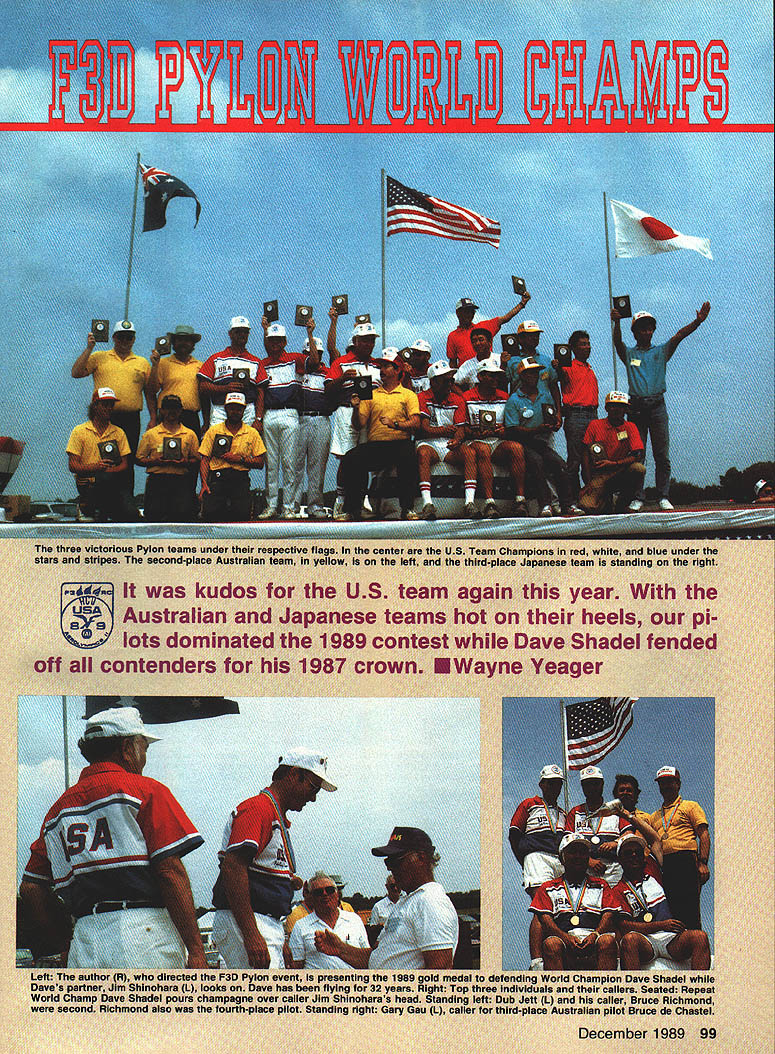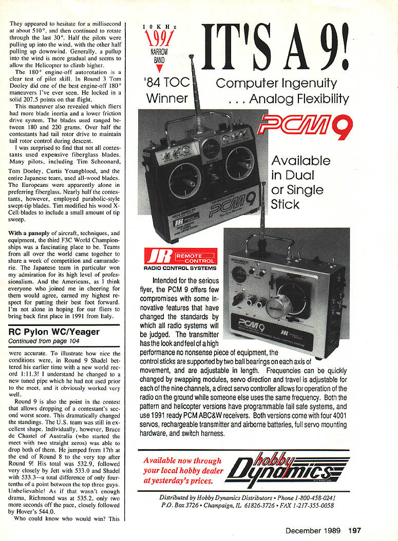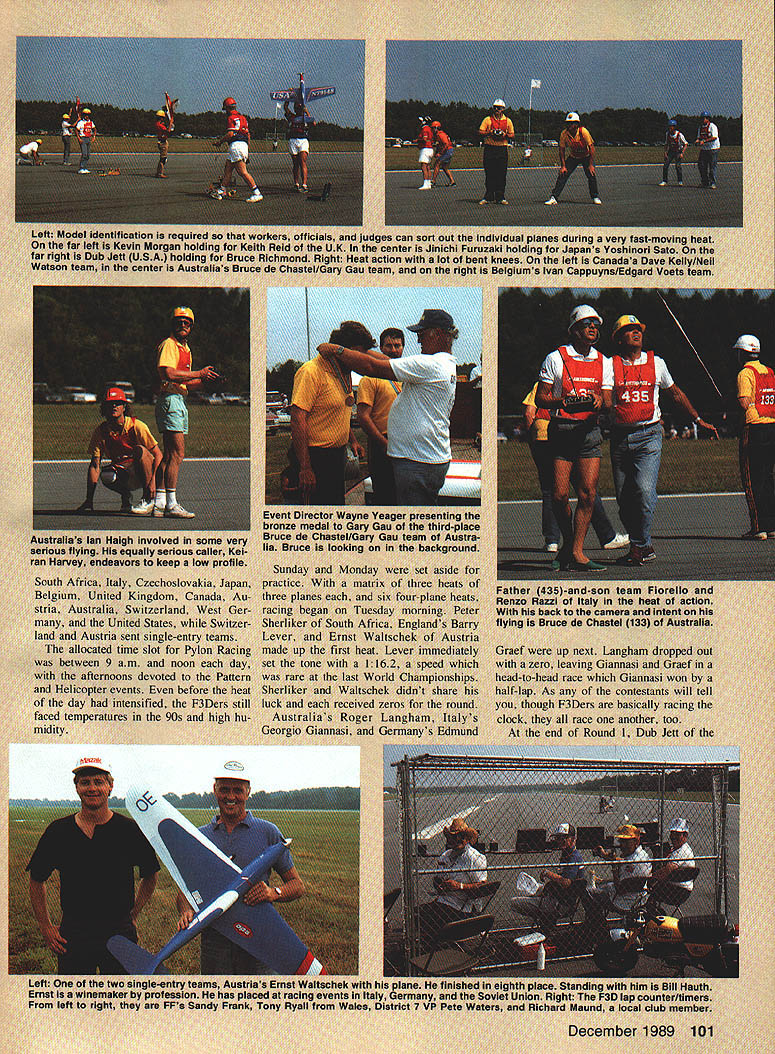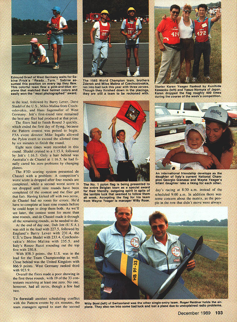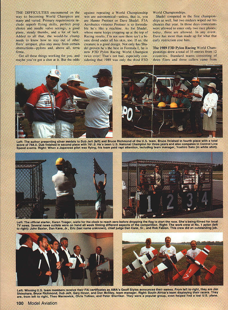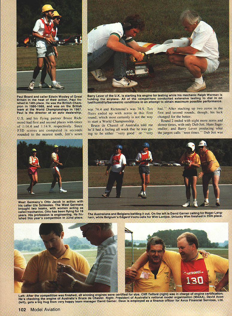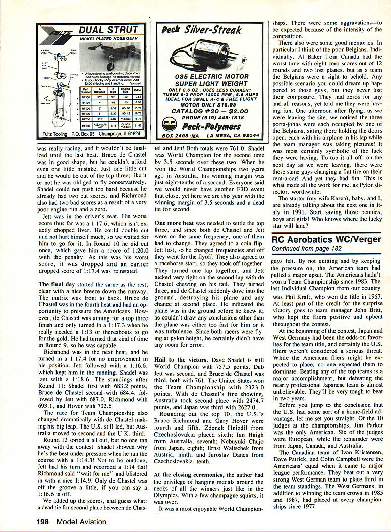 NO OCR TEXT THE DIFFICULTIES way becoming W varied elude superb flying s choice needle valv plane steady thumbs Added needs know tc fliers airspace plus sta obstructionspylons ma 5et thu youve got 4 -epeatiui astrn anno batics hes e na rld er As rig up ure skin U n t Fo Da o Bruce F en US m paid rap zero b rent al chief jude 1 u nships npeted two mid year days contestani d enter two race planes allowed event ire made up what rn cost him Pylon Racing World Chain atotalof33entu ndard id three purth plac ompete mnlro Sato outatan ice wnrk ci erner d C k di zeros La Ge ii Board caller lain in heat os 14th olace lie puan Paul director c US flying pa mond first secon nf 1144 1149 comp e nearest te manys Otto r Ut Schiesle two teams v hanlcs Otto protesslon us years camp 102 Model Aviation irpIa aroi nd Richmond d up h certain orld Champioi Chastel / e1ing wee r very hans BE Belgiums E mechani extensive tea p maximum pos stacking up cond rounds better ended P s with Barry Lever pn Ills teen times cmli nfini Jn taulce I ennu Turn ovan Ba ilos Ma] s SageiS Ld ish ay 0 Nas Mike peo al secj iine m Ir mthat didnt ul 22 er v WII Wldifl nts US Inn Now avalable hty Ut.. woilds tkm premium grade Hght plywood Mighty Lbs ul smooth grain finish alows Umited fling *tualy no flaking saving hours preciousbidlclng time Mighty Ut bonds easily ZAP other CAs cuts Ike butter X-AC1D knife Shattering spflntering warping n*few thing past Mighty Utes qualty fonnula tion currenfly being used leading manufac turers including BOB VIOLETT MODELS HOUSE OF BALSA because Its superior strength-to-weight ratio So youre tired shattering experiences next timedoitright useMightyUtel Mig~ Lit I Maim aleaJ Fta*Thno Enbtpdmes 2013051mb Road cewltoa California 9012400 sw 65th1rrace Davis Philda 383e4 213860-1275 5 473-11 Mighty Lila avaimble better hobby store ewrywhare ii may order auct Ihe regional aaleoIIo nougat u first off fly weather wasnt hot would later rem edy reversed matrix other day meant guys scheduled last heat round first off next day case Ernst WaIts chek Austria Yoshinori Sato Japan Dave Shadel Shadel set days standard turning good 1155 followed Sato 118 flat Waltscheks 1223 After Danes Czechoslovakia Chujo Japan Haigh Australia Haigh zero Danes barely beat Chujo 1201 1221 Round 4 ended eight zeros big change placings because worst score being dropped Dub Jett still first place 2275 points fol lowed very closely Shadel 2279 US s Bruce Richmond 2292 UKs Barry Lever 2314 US s Gary Hover 2324 Richmond sick run Round 2 able drop Hover got rid zero US s lead Team Championship moved up 333 points over Czechoslo vakia 69 1 over United Kingdom Round 5 racing usual six contestants receiving zeros US team starting pull away dominance Team Championship soon became obvious no going touch unless completely fell apart doubtful because well prepared five teen times round three longed US Hnizdil Czechoslo vakia de Chastel Austra lia starting sneak picture turned rounds fastest time 1161 exceptional speed starting noticed Round 6 last day two speed picked up slightly seven contes tants teens Barry Lever best 1166 followed five 117s lonely 119 Dub Jett still first place 2 /2 seconds over Shadelwith Richmond 26 seconds back Lever 65 se conds Hnizdil 113 racing half way over dividual race top still too close predict Team Championship starting widen however US led 989 seconds over United Kingdom 1565 over Czechoslovakia third day decided slow down little since estimated total 12 rounds maximum entire meet After first two days half way Therefore decided run two rounds per day remaining days acceptable teams Rounds 7 8 completed tal 10 teen times eight zeros FAI ships very fast far Formula speeds number zeros recorded astronomical some crashes double cuts inordi nate number no starts Obviously start ing up gems delicate matter some Others seemed have no trouble end Round 8 discovered close contest gotten between top fliers dead heat first place tween Bruce Richmond Dub Jett identical scores 5352 Keep mind points seconds Unbelievably after eight full rounds tie last tenth second doesnt end third place Shadel 5456 points Hnizdil fourth 5558 rounding out top five Gary Hover 5593 Team Championship still US camp leading UK 1746 points Czechoslovakia 1942 Bar ring complete wipe-out race team honors going second third place because no going touch United States Dave Shadel US team mem ber competed reigning World Champion Therefore scoring noth ing team points US accumulating US team Jett Richmond Hover Day four Round 9 started right time reverse matrix put Shadel first heat proceeded turn meet fast time 1121 round pro duced eight times teens indicating conditions good flying setups Continued page 197 104 Model Aviation appeared hesitate millisecond about 5100 continued rotate through last 300 Half pilots pulling up wind other half pulling up downwind Generally pullup wind gradual seems allow Helicopter climb higher 1800 engine-off autorotation clear test pilot skill Round 3 Tom Dooley did best engine-off 1800 maneuvers Ive ever seen locked solid 2075 points flight maneuver also revealed fliers blade inertia lower friction drive system blades used ranged tween 180 220 grams Over half contestants tail rotor drive maintain tail rotor control during descent surprised find contes tants used expensive fiberglass blades pilots including Tim Schoonard Tom Dooley Curtis Youngblood entire Japanese team used all-wood blades Europeans apparently alone preferring fiberglass Nearly half contes tants however employed parabolic-style swept-tip blades Tim modified wood X Cell blades include small amount tip sweep panoply aircraft techniques equipment third F3C World Champion ships fascinating place Teams over world came together share week competition camarade rie Japanese team particular won admiration its high level profes sionalism Americans think everyone joined cheering would agree earned highest re spect putting best foot forward Im alone hoping fliers bring