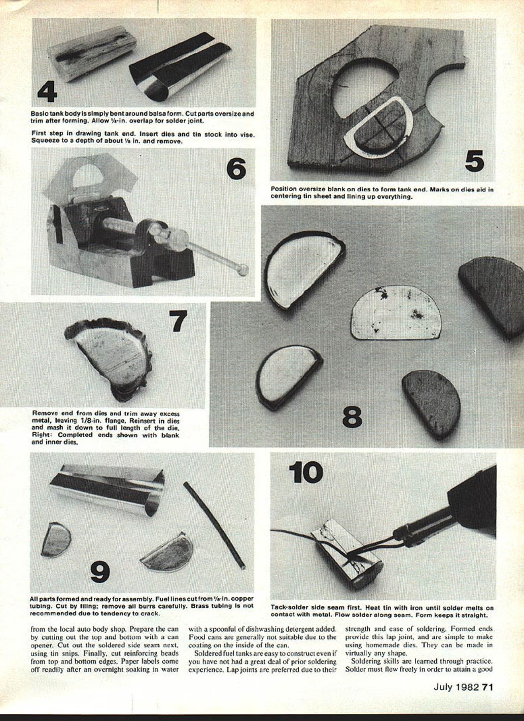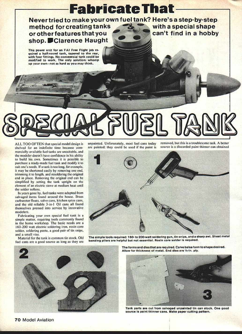 Fabricate Nevertriedto make own fu method creating tanks other features shop EClarence Haught power unit FAI Free Flight job re quired half-round tank tapered rear four fittings No commercial tank could modified work solution whomp up ownnot hard may think ptri Heres step-by-step special shape cant find hobby ALL TOO OFTEN special model design shelved indefinite time because com mercially-available fuel tanks unsuitable modeler doesnt have confidence ability build own Sometimes possible purchase ready-made fuel tank modify suit ones needs tank too long example may shortened easily removing end trimming length resoldering original end place Removing original end can simplified setting tank upright element electric stove medium heat until solder softens years gone fuel tanks adapted salvaged items found around house Brass carburetor floats salve cans kitchen spice cans old reliable 3-in-l Oil cans found themselves pressed service innovative modelers Fabricating own special fuel tank simple matter requiring tools commonly found home workshop basic needs 160-200 watt electric soldering iron rosin core solder soldering paste good pair tin snips small vise Material tank common tin stock Old fuel cans good source long unpainted Unforunately fuel cans today removed troublesome task better painted could used paint source discarded paint thinner can obtained 70 Model Aviation inc simpie sools requirco iou- iu uuwrn1 uuuurnu .s i. ding pliers helpful essential Rosin core solder required forms dies required Carve balsa form shape desired Allow thickness metal End dies 1/4-in ply 8u1Y iui iruni 38iVWUU U1P5IflIUU Uil i811 5L01P iJflU gOUU source paint thinner cans Make paper cutting pattern local auto body shop Prepare can cutting out top bottom can opener Cut Out soldered side seam next using tin snips Finally cut reinforcing beads top bottom edges Paper labels come off readily after overnight soaking water spoonful dishwashing detergent added Food cans generally suitable due coating inside can Soldered fuel tanks easy construct have great deal prior soldering experience Lap joints preferred due strength ease soldering Formed ends provide lap joint simple make using homemade dies can made virtually shape Soldering skills leamed through practice Solder must flew freely order attain good July 198271 Remove end dies trim away excess metal leaving 1/8-in flange Reinsert dies mash down full length die Right Completed ends shown blank inner dies parts formed ready assembly Fuel lines cutfrom 1/s-in copper tubing Cut filing remove burrs carefully Brass tubing notTack-solder side seam first Heat tin iron until solder melts recommended due tendency crackcontact metal Flow solder along seam Form keeps straight 11 tank shows no leaks air forced fueling syringe Any leaks must carefully resoldered tested Watch corners bond Insufficient temperature pro duces rough cold solder joints leak-prone subject early fail ure best tech nique heat material sol dered sol dering iron until solder will melt touches materiaL flowed along joint Commercial soldering paste helpful forming good joints Simply dip end solder paste time time photographs provide step-by step instructions fabricate own tank little imag ination will enable adapt technique own needs Upper Left Fuel tube soldered same manner tank seams Heat copper tube until solder will flow touches tubing tip iron Left Inside ends tubes should anchored spot solder prevent loosening due vibration careful solder end tub ing shut Tanks ready leaktesting Plug lines insertfuel tubing unplugged line submerge water blow tubing Watch telltale air bubbles fruit labors nestles snugly Its home Silicone sealant helps Sn hnid und qhiald frnm vibrntinn End fuel lines attached next Soldering paste helps make solder flow easier improves bond Avoid building up too much solder Moles tor tUel line vent puncheo end sharp awl eliminates drilling chips provides flanged hole soldering Liean excess Tiux trom inside ot tank arter caretul inspection solder other end tank has four separate outlets