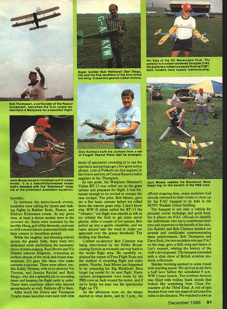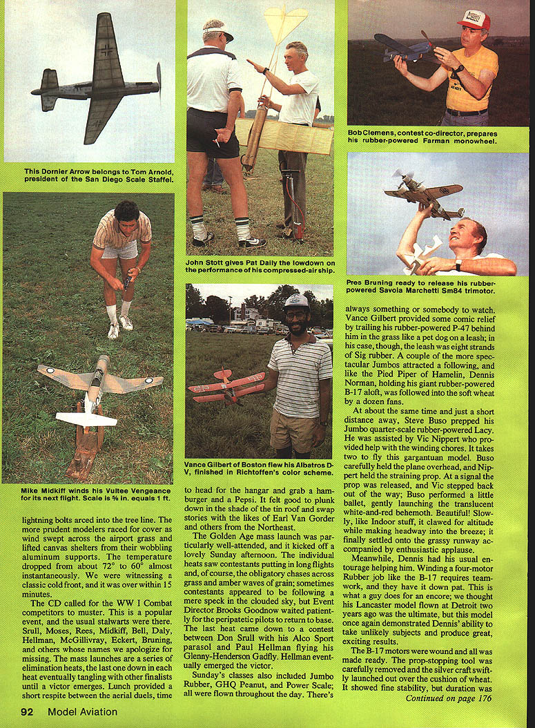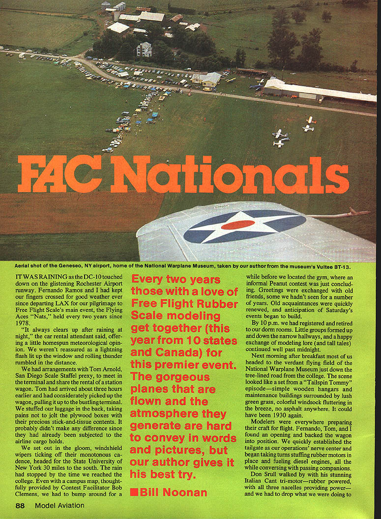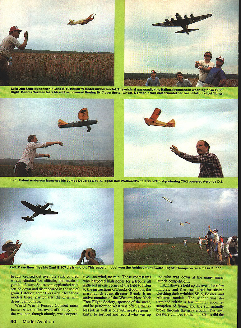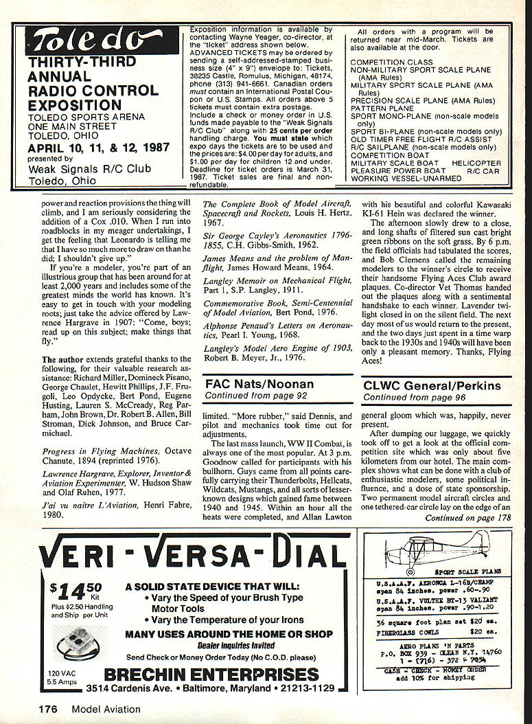 NO OCR TEXT NO OCR TEXT NO OCR TEXT NO OCR TEXT NO OCR TEXT ANNUAL RADIO CONTROL EXPOSITION TOLEDO SPORTS ARENA ONE MAIN STREET TOLEDO OHIO APRIL 1O 11 & 12 1987 presented Weak Signals RIO Club Toledo Ohio power reaction provisions thing will climb am seriously considering addition Cox 0 10 run roadblocks meager undertakings get feeling Leonardo telling have much draw did shouldnt give up youre modeler youre part illustrious group has around least 2000 years includes some greatest minds world has known Its easy get touch modeling roots just take advice offered Law rence Hargrave 1907 Come boys read up subject make things fly author extends grateful thanks following valuable research sistance Richard Miller Domineck Pisano George Chaulet Hewitt Phillips JF Fm goli Leo Opdycke Bert Pond Eugene Husting Lauren S McCready Reg Parham John Brown Dr Robert B Allen Bill Stroman Dick Johnson Bruce Car michael Progress Flying Machines Octave Chanute 1894 reprinted 1976 Lawrence Hargrave Explorer Inventor & Aviation Experimenter W Hudson Shaw Olaf Ruhen 1977 Jai vu naitre L Aviation 1980 Henri Fabre exposition inrormation avaiiaoie D contacting Wayne Yeager co-director ticket address shown below ADVANCED TICKETS may ordered sending self-addressed-stamped busi ness size 4 x 9 envelope Tickets 38235 Castle Romulus Michigan 48174 phone 313 941-6661 Canadian orders must contain International Postal Cou pon US Stamps orders above 5 tickets must contain extra postage Include check money order US funds made payable Weak Signals R/C Club along 25 cents per order handling charge must state expo days tickets used prices $400 per day adults $100 per day children 12 under Deadline ticket orders March 31 1987 Ticket sales final non rfr nrIhIQ Complete Book Model Aircraft Spacecraft Rockets Louis H Hertz 1967 Sir George Cayleys Aeronautics 17961855 CH Gibbs-Smith 1962 James Means problem Manflight James Howard Means 1964 Langley Memoir Mechanical Flight Part 1 SP Langley 1911 Commemorative Book Semi-Centennial Model Aviation Bert Pond 1976 Alphonse Penauds Letters Aeronau tics Pearl Young 1968 Langleys Model Aero Engine 1903 Robert B Meyer Jr 1976 FAC Nats/Noonan Continued page 92 limited rubber said Dennis pilot mechanics took time out adjustments last mass launch WW II Combat always popular 3 pm Goodnow called participants bullhorn Guys came points care fully carrying Thunderbolts Helicats Wildcats Mustangs sorts lesserknown designs gained fame between 1940 1945 Within hour heats completed Allan Lawton orders program will returned near mid-March Tickets also available door COMPETITION CLASS NON-MILITARY SPORT SCALE PLANE AMA Rules MILITARY SPORT SCALE PLANE AMA Rules PRECISION SCALE PLANE AMA Rules PATTERN PLANE SPORT MONO-PLANE non-scale models SPORT BI-PLANE non-scale models OLD TIMER FREE FLIGHT R/C ASSIST R/C SAILPLANE non-scale models COMPETITION BOAT MILITARY SCALE BOAT HELICOPTER PLEASURE POWER BOAT R/C CAR WORKING VESSEL-UNARMED beautiful colorful Kawasaki KI-6 1 Hem declared winner afternoon slowly drew close long shafts filtered sun cast bright green ribbons soft grass 6 pm field officials tabulated scores Bob Clemens called remaining modelers winners circle receive handsome Flying Aces Club award plaques Co-director Vet Thomas handed out plaques along sentimental handshake winner Lavender twi light closed silent field next day us would return present two days just spent time warp back 1 930s 1 940s will have pleasant memory Thanks Flying Aces CLWC General/Perkins Continued page 96 general gloom happily never present After dumping luggage quickly took off get look official com petition site about five kilometers hotel main com plex shows what can done club enthusiastic modelers some political fluence dose state sponsorship Two permanent model aircraft circles tethered-car circle lay edge Continued page 178 VERI #ERSA VIAL h 1 450A SOLID STATE DEVICE THAT WILL a& m Kit Vary Speed Brush Type Plus $250 Handling Motor Tools Ship per Unit ary Temperature Irons MANY USES AROUND THE HOME OR SHOP ISend Check orDealer Inquiries Invited Money Order Today No COD please 12OVACBRECHIN ENTERPRISES L~Ps 3514 Cardenis Ave imore Maryland 3-1129 176 Model Aviation US,AA7 AZROIA L-16fl/OIUP Open 8J Such. pewer 6090 U8AA1 VIJLTER N3-13 VALIABT open 8i juehes power 90-120 56 aquw foot plan aet S2d ca FThEROUSS C3LS120 ea AIRO PLANS N PARTS PO BdYL 939 NY 114760 372 CASE CHUCK 140hZ C2DER add 10% ahippLig