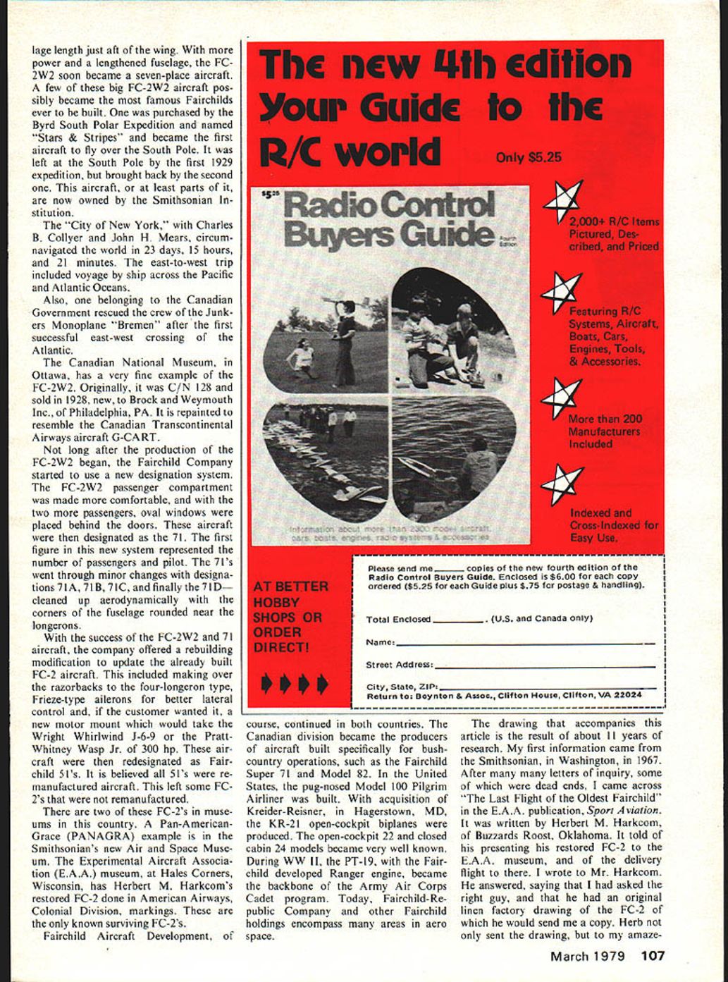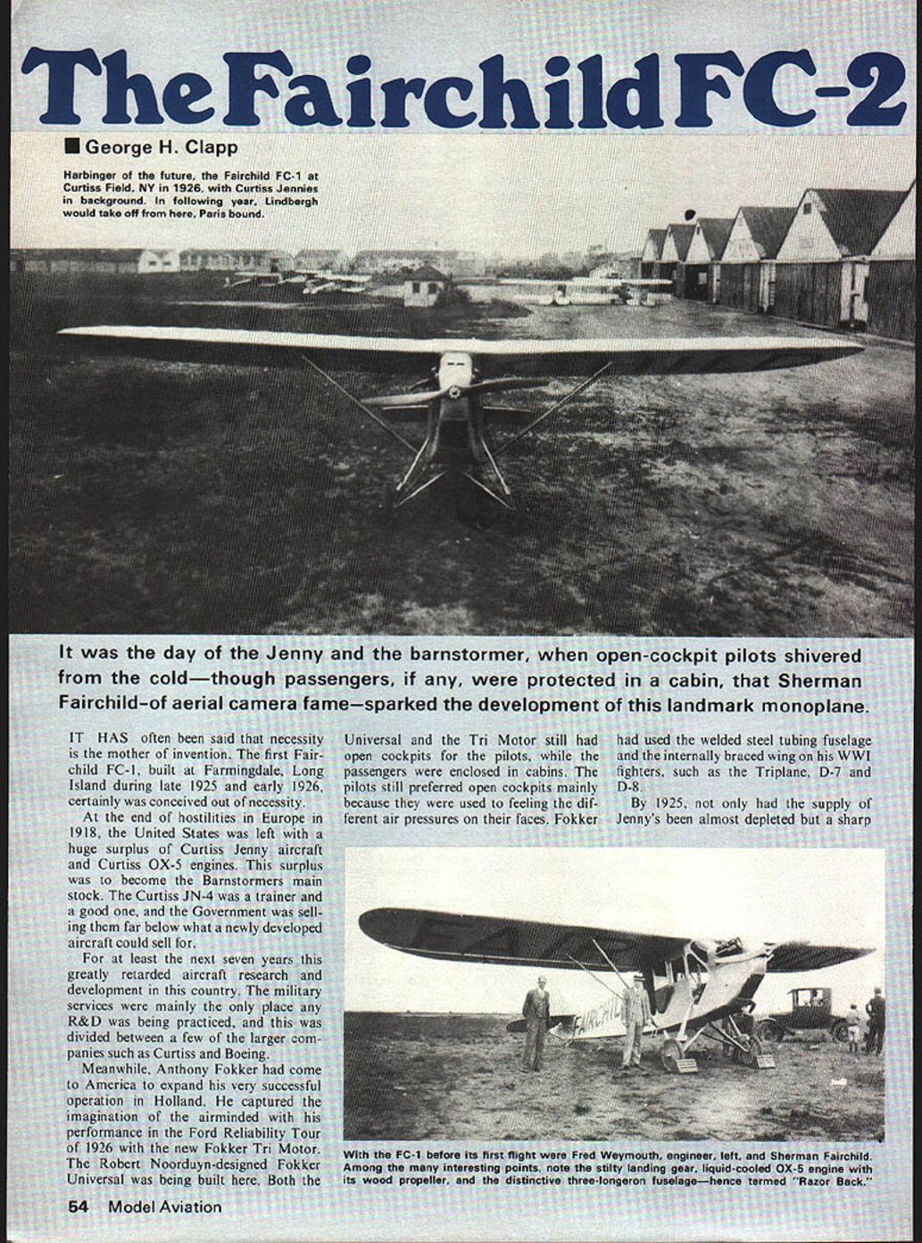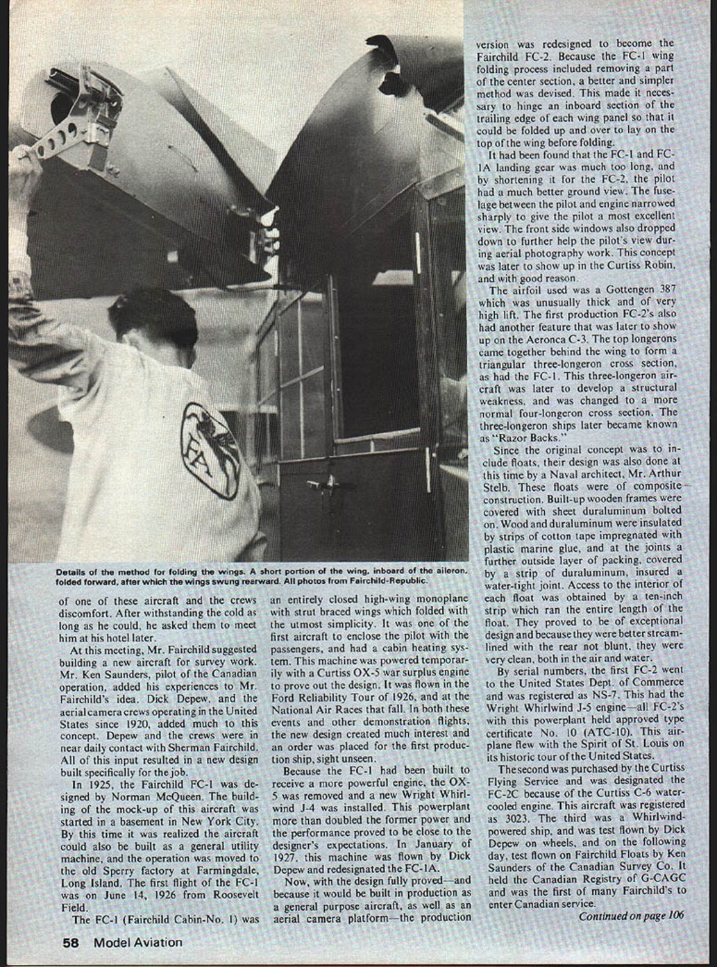 George H Harbinger futu Curtisa Field NV 15 da cold chi Id-of - often ing raft cot t barn 5 w -sparked versal Tn cockpits engers enclos still preferred ope ause used rent air pressures t k NO OCR TEXT NO OCR TEXT NO OCR TEXT portion wing 111 photos Fairch entirely closed h 11 strut braced wins e utmost simplicity rst aircraft enclose assengers machine Curtiss OX-5 rove out design Reliability Tour mnal Air Races th its other new design creat irder placed ship sight unseen cause FC-l redesi2l FC-2 Bi ocess inclu 1er section devised hinge ml edge e folded tin hewin2h RADIO REMOTE CONTROL MODELS* PRESSURE SENSITIVE TRIM DECALS PC-iSPITFIREPT 30013 x 22 Ir 2 Scolioped Red Whre o,d Blue RC-2T-28 BP130023522 rh 2Sl Red RC-3FW 190 0-9PT3OWi 522 ocrI 2Honn Red RC-4WACO YMT-3PT 30043 622 rh 2 Funnels Red PC-SDUELLISS 2/40PT 35055 58 h sqcoes Block end Cmeor RC-6CESSNA 1821 3aP3 68 WkreSo, 7 sold lourlne PRESSURE SENSITIVE DECALSPT 311073 520 Wrp Sros S oId 5 ourlOp PD-21X11RAF DECAL LargePT33 6 22 *,I 2 S*,Is Geen P0 2002U S NAVY DECAL LargePT 30093% 5 22 h 2 Hons Green P0203GERMAN WW II Large APT 301o3 5 22 crh 2 Punnein Green P0-21304CIvILIAN DECAL SETPT 30113 5 22 rh 2 S,In IRIuCI P0-2005cLIFTWAFFE WW Large APT 30123 5 22 ,, RIue P0-2006LUETWAFFEE WW Smoll APT 3033 5 22 .t 2 Punnels Rice P02007LUETWAFFEE WW (Large B ICA PLASTIC PARTS P0-2006LUFTWAFFEE WW LargePP uce WACO COWL & 14 BLISTERS P0-2009LUETWAFFEE WW (SmallPP2WACO WHEEL PANTS P0-2010US WW (LargePP3WACO BLISTERS ONLY (4 P02011US WW II SmallP110534FW 90 COWL P0-2012US WW (LargePesFW 90 CANOPY P0-2013US WW (Small11511-28 COWL l3pecesl P0-2014RAF WW II SmallPF7-28 CANOPY SET 2 preces P0-2015RAP WW (Largecccna7-28 REAR CANOPY P0-2016RAP WW Smallresiec7-28 FRONT WINDSHIELD P0-2017NCAM 1-0 3 blk 5hT- -SPITFIRE CANOPY P0-208NCAM 1-0 2 blk TFIRE BUBBLE CANOPY P02019NCAM 0 DUELLIST CANOPY P0-2020AIRCRAFT STENCILS-~pJ A 82 WNDSHELD SET 4 pieces P0-202US WW (Small Blue CESSNA 82 COWL 2 pece P02022RAE WW (Largepv4osj NA 82 WHEEL PANTS 3 piece SCALE SPINNERS 3" FW-90 NylanPRODUCTS P5550 3P-5 P-39Nylae2657 NE 188th ST MIAMI FLORIDA 33180 PSSnJ33 P40 / SpTfreNyIor305 935 1436 PS 5504 3" FW-190NylonChrameNNOVATIONS IN MODElING PS 50053 P 51 P 39-Nyon-Chrome P5510303 P 4O/Splfre-Nyon-ChromeAvalabe 90 days Look products consistently running over 200 phe nomenon result new engines improvement set upwhich have already pointed out must An engine carefully put together test run bench failing come up ex pectations should scrapped test circle might show performance never dreamed Dubby Jett can testify David Layman took Dubs large box discarded cylinders pistons engine outran Dub Na tionals set new speed record engine 500 1000 rpm off what already have try might like what expect happen year First thing expect see inyour local hobby shop crease number contestants Class D Rossi excellent D-class engine available ring version ABC have heard nothing praise engine speed free flight RC boats everyone agrees surprised output engine right out box well-made well-designed stock engine what event has needed 5 6 years mini-pipes will good run will help cut down expense class yield fun excitement Formula 40 will continue popular event think speeds class will higher ever lot new faces emerging winners circle Nitromethane synthetic oil will harder harder come price will probably increase both fact seems telling probably should going alcohol move could make contests challenging time time will guest editors write about opinions recommendations hope doing will inspire people write about what would like read Gene Hempel 301 N Yale Dr Gar land TX 75042 Ciklon/Meczner continued page 53 left left adjusting screw tail plane should raised 02 03 mm order increase overall position angle model timing actuating rudder might also brought forward does help may try reduce wing twist Raise right-hand side adjusting screw tail plane controls free flight such extent ie increase position angle model glides safely gusts thermic weather conditions Fairchild/Clapp continued page 58 Fairchild test pilot Dick Depews log gives different test flight sequence Ac cording Curtiss machine first flew June 12 1927 Fairchild Surveys Canada aircraft June 20 Department Commerce machine June 30 chronology probably accurate Fairchild history somewhat complicated point fact FC-2 soon built Canada under license Canadian Vickers Ltd Mon treal built 12 FC-2 Razor Backs before Fairchild license withdrawn Fairchild Aviation Limited Longueuil Quebec formed first aircraft built new company early 71 series explained later FC-2 soon followed Pratt & Whitney Wasp powered FC-2W prototype wing span creased 50 feet jury struts added longer wing struts Otherwise air frame remained basically same doing lateral control became less effective because extended wing tip drag Freize-type ailerons stalled correction Ten FC-2Ws built after proto type second produced sold Bell Telephone Laboratories aircraft became instrumental devel opment air-to-ground two-way radio helpful newly forming airlines FC-2W discontinued favor FC-2W2 same airframe two feet added fuse106 Model Aviation lage length just aft wing power lengthened fuselage FC 2W2 soon became seven-place aircraft few big FC-2W2 aircraft pos sibly became famous Fairchilds ever built purchased Byrd South Polar Expedition named Stars & Stripes became first aircraft fly over South Pole left South Pole first 1929 expedition brought back second aircraft least parts now owned Smithsonian stitution City New York Charles B Collyer John H Mears circum navigated world 23 days 15 hours 21 minutes east-to-west trip included voyage ship across Pacific Atlantic Oceans Also belonging Canadian Government rescued crew Junk ers Monoplane Bremen after first successful east-west crossing Atlantic Canadian National Museum Ottawa has very fine example FC-2W2 Originally C/N 128 sold 1928 new Brock Weymouth Inc Philadelphia PA repainted resemble Canadian Transcontinental Airways aircraft G-CART long aft