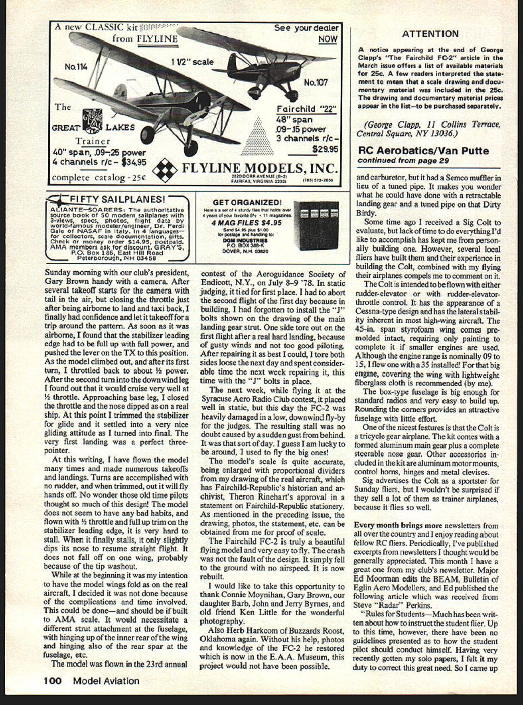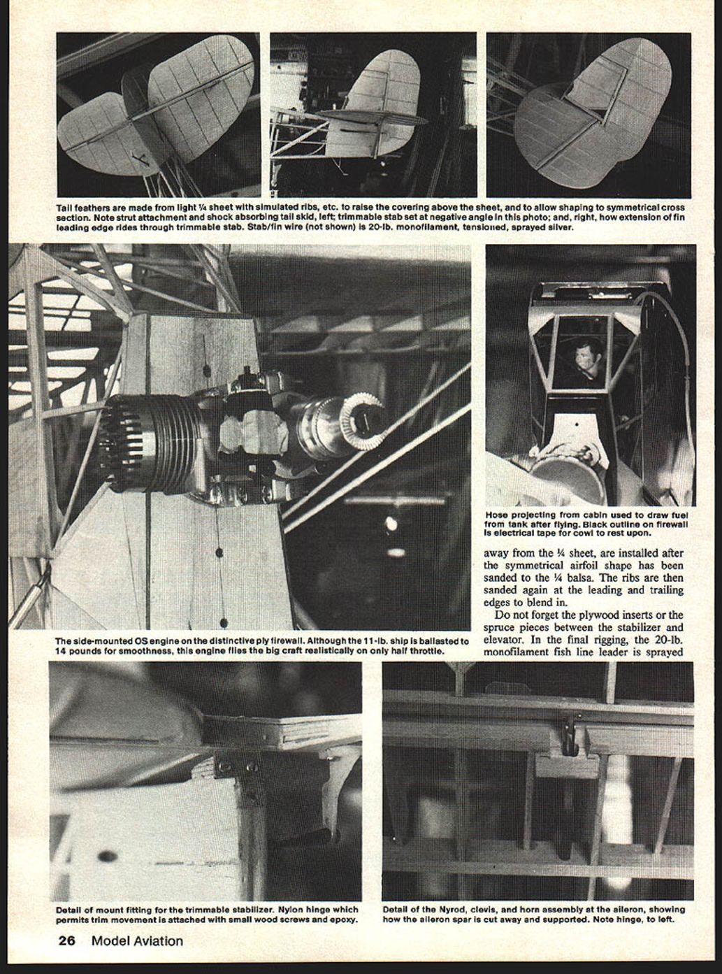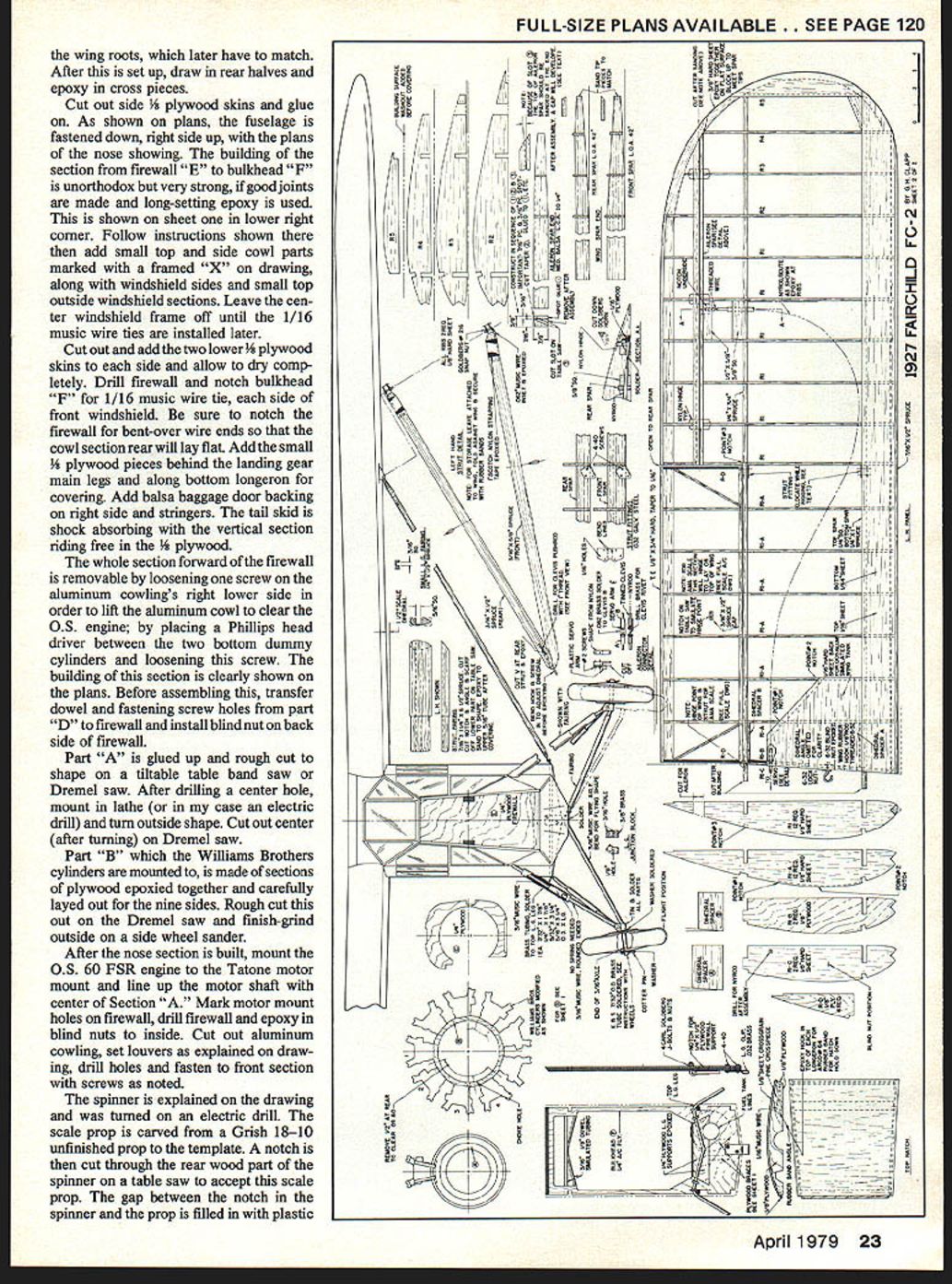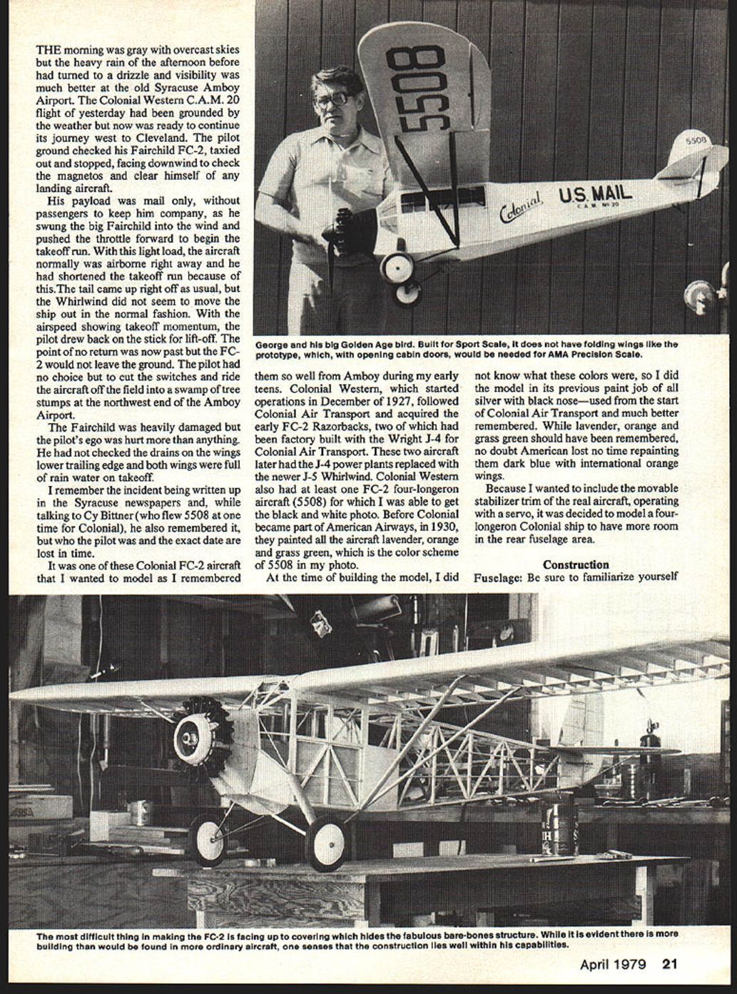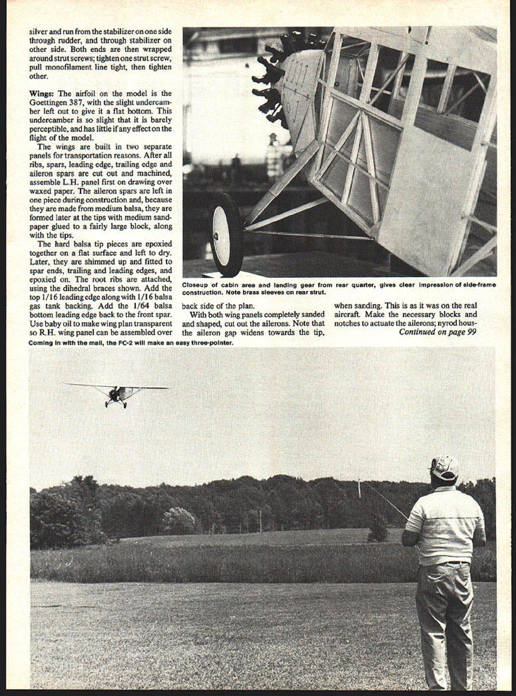 saw FC-2 in2 i plane weighs undsand has FSR handles scale built stabilizertrim ease Insp purpos just like THE morning gray overcast skies heavy rain afternoon before turned drizzle visibility much better old Syracuse Amboy Airport Colonial Western CAM 20 flight yesterday grounded weather now ready continue its journey west Cleveland pilot ground checked Fairchild FC-2 taxied out stopped facing downwind check magnetos clear himself landing aircraft payload mail passengers keep him company swung big Fairchild wind pushed throttle forward begin takeoff run light load aircraft normally airborne right away shortened takeoff run because thisThe tail came up right off usual Whirlwind did seem move ship out normal fashion airspeed showing takeoff momentum pilot drew back stick lift-off point no return now past FC 2 would leave ground pilot no choice cut switches ride aircraft off field swamp tree stumps northwest end Amboy Airport Fairchild heavily damaged pilots ego hurt anything checked drains wings lower trailing edge both wings full rain water takeoff remember incident being written up Syracuse newspapers talking Cy Bittner flew 5508 time Colonial also remembered pilot exact date lost time Colonial FC-2 aircraft wanted model remembered well Amboy during early teens Colonial Western started operations December 1927 followed Colonial Air Transport acquired early FC-2 Razorbacks two factory built Wright J-4 Colonial Air Transport two aircraft later J-4 power plants replaced newer J-5 Whirlwind Colonial Western also least FC-2 four-longeton aircraft 5508 able get black white photo Before Colonial became part American Airways 1930 painted ali aircraft lavender orange grass green color scheme 5508 photo time building model did know what colors did model its previous paint job silver black noseused start Colonial Air Transport much better remembered lavender orange grass green should have remembered no doubt American lost no time repainting dark blue international orange wings Because wanted include movable stabilizer trim real aircraft operating servo decided model four longeron Colonial ship have room rear fuselage area Construction Fuselage Be sure familiarize yourself difficult thing making FC-2 facing up covering hides fabulous bare-bones structure Ha evioeni mere building would found ordinary aircraft senses construction lies well within capabilitIes April 1979 21 George big Golden Age bird Built Sport Scale does have foldIng wings like prototype opening cabin doors would needed AMA PrecisIon Scale TOM ASS FOB EXIST CABSVONOL IX TEXT #cUJ HURON FOAM 7T#-EIflBOBBXT1O0 TIEhflXXIssWEN 4IoJEI\flSEEr eXAM V8 XXIX SlEET CR V LOIXTXX S TLOLEOLAXOC XXFLYWXXX59 FL XXXIX U V4XVX ItTCLEARXJC OXFITWXXO XOELSEX SEWS XXLXEFED TIE SO XNTTEO TIX7 Mt CLXXX XX DISBE XX______ OXWAL_ SA CTO LOXEBLOXXXIX RT NELXX VB SCOW BXCELSOXOTRECTIXI XNT TIWOLIEX BETAXEVE LXLXLXRXXXIX CLARITY IX XETX CXVEMEY XXEE7 SLEET 0 XXXO/0 IU-SET XXI __ LEFT XEE__XEE ONEILCXVXROX/ FXXTX LET ICTEE SXX PLYNOOXXXCTXXlAO ELTWXEO TXE SOOXINIBEX IIFRAME LSIIS BOTTOM FORt. NILX BLOOM XEBEW BELOWELYWOOX BEG0 SEXyr BEEISOCE TOES BOTTOM LXNOXRXSEI1nwI LYREIYUXXO XE S BXTTXN LXX BETWEEN tVt~IYBCRXXXARXEILOCOEzF TOO OLOESTT~I OXOL EXt WXXO / LEAVE EFEN TO LOOXTE CXXX ELO BET ISTIO[I ANELTWOO~ CAEINO TOES BOTTOMXXXX BOLSXVt XXX FOR BELOWBILXXXR VCOI VOELTWXXX TOES BOTTOM ILIOXXISTOES BOTTXM BETWEEN N_ _______ LIPXXYTXN XELS FITBEOX EXT TO XCWBXLOL AX TEE SLAP WIBEXIX BLABELE XX XXX 0000 TO SOBELOW EXYXOSIXLI4XO LONOERONS S LONXXRXS XXEXLW XXSSMLATXO RUXELEVATOB CX&E MOlEF- LflAELYWOXXAT XXXII X5X MXXX XXX NOWTEE XE FINOWL- FOB S EPXXT LXX IXEEFREE TOAVEL ER SCREWXECTARE 0 EL-AC TXXX BOThSEE TEE EBOLIT MISSX SOLO JI X ALOS CAMFIALY SITX FROM FROST XE9XV WITX LOSE XETTBO TTEE LOT BET OVEN XXX OTLER 00 FLYWOCO 0000 1927SCALE 0 FAIRCHILD FC-2 DESLOXED S DRAWN OT 00 CL-APP WRE XXXIX 0R CLERE AREA 1004500 WELOLT WOO OXLLASTI4L-IX OTLWEIO--LENGTh OVER ALL XX FOX E CAWLIE LOOXEBS TYFEAL OXRIyr pj OWLELBEX OX ELE GRAS FC XE mOO OOXTIOOXS FlEEWBLO OTBOT FITTINO XOX NALOXXX ELAC XXBI ON ERE WITH LOOVER XLOBEO WOO STEELGRAS S OXTUEX OXSRX EPOVY ALL OXOTS FORWOXO orKoOK: YIO5TtXTtLOOO ESS SLABSXXIXBELt XXIXELM ROE FONEC LOXOER WLL BE WOO LOIN BETTOLO TYPEXXX COWLL.ALEXOXIXCE FOX Ot MOTOR 0 PATTERNI--NLXX SLEET FOX OX-BOO MOFLER NM-TON S LX OEELAOX-ORE E ELS NOWICATION XE OSIOX 0-10 ONE ONFILLXR IS REMOVEMLE ST5W0L-LANLO BORE REMOVOLO FREE 0 SEXIER SIIBOXEFL SCREWS AT ST SEX 0 BETWEENSELLO 0085 CXXX OXTTEOSSTOW ON REAL A/C TOILER OXYIS LOXOOLLOIT BENO OF -F O C b rLLE~Cb ~ CV~~ CY.EEXTL ~O~I11X CIX b ~.DoXXuo~go CX 0 ~ 0CIXCX~ -EXXQ XX _~Ao0 OEX CoYbOO EN IoX O b~IeQQIS000 MO~ OO~ XNO 0LO b O 8 XX& CNbb E CoN 0OCX~SMO O S 0 0RN_b0~o 0 0S ~bCXO MOOI5~flMO~X~ bLbb 9~5boMOCoSOQ O~ N EETN3@Q 0 0 CD L.X 1 C I m z C, w rn C, m m rr ICV 0 FULL-SIZE PLANS AVAILABLE . SEE PAGE 120 wing roots later have match After set up draw rear halves epoxy cross pieces Cut out side ood skins glue As shown plans fuselage fastened down right side up plans nose showing building section firewall E bulkhead F unorthodox very strong good joints made long-setting epoxy used shown sheet lower right corner Follow instructions shown add small top side cowl parts marked framed X drawing along windshield sides small top outside windshield sections Leave cen ter windshield frame off until 1/16 music wire ties installed later Cut out add two lower ood skins side allow dry comp letely Drill firewall notch bulkhead F 1/16 music wire tie side front windshield sure notch firewall bent-over wire ends cowl section rear will lay flat Add small plywood pieces behind landing gear main legs along bottom longeron covering Add balsa baggage door backing right side stringers tail skid shock absorbing vertical section riding free ood whole section forward firewall removable loosening screw aluminum cowlings right lower side order lift aluminum cowl clear 05 engine placing Phillips head driver between two bottom