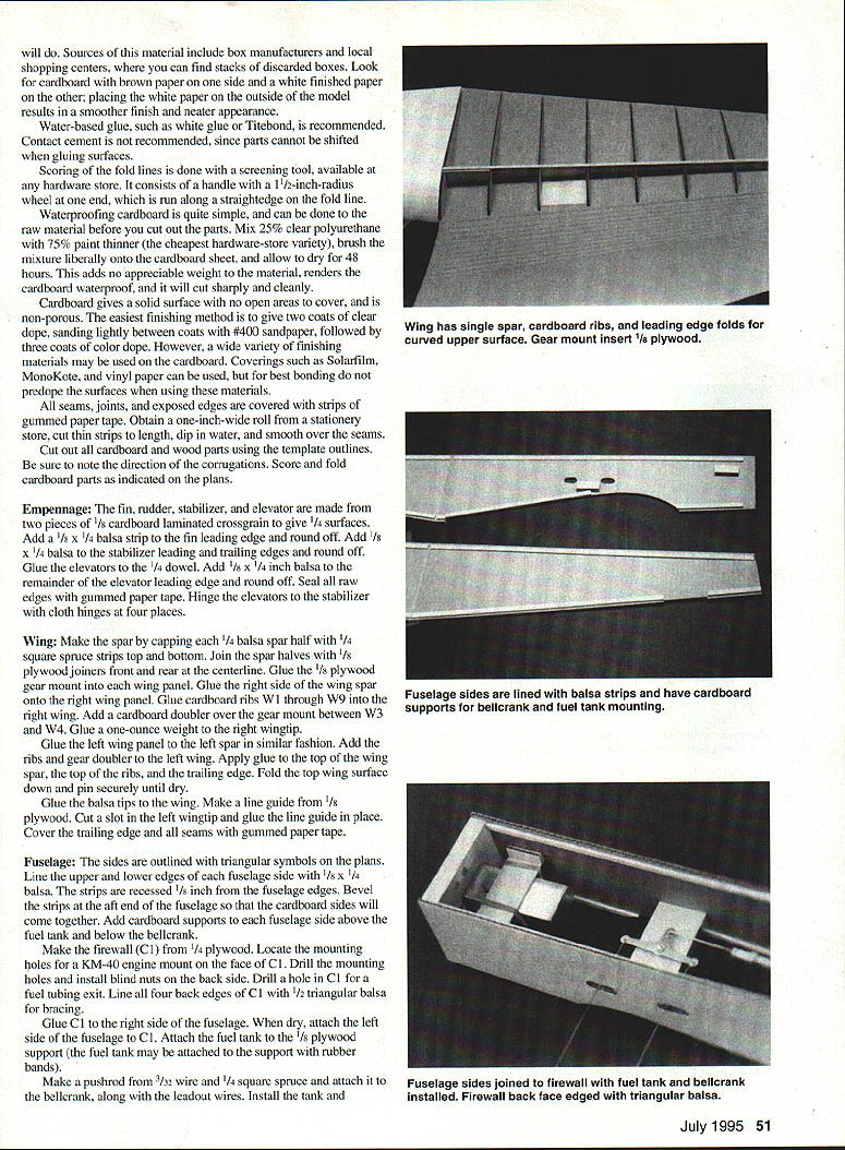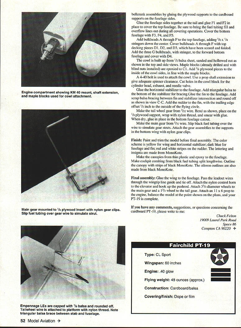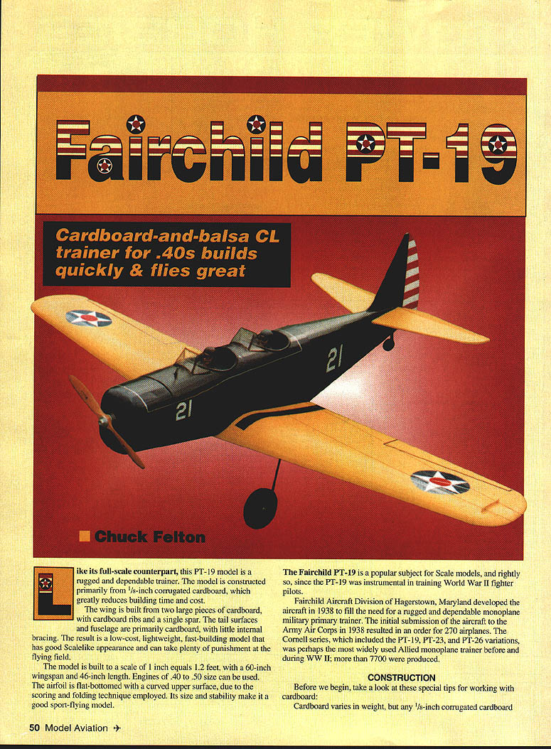ike its full-scale counterpart PT-19 model rugged dependable trainer model constructed primarily /8-inch corrugated cardboard greatly reduces building time cost wing built two large pieces cardboard cardboard ribs single spar tail surfaces fuselage primarily cardboard little internal bracing result low-cost lightweight fast-building model has good Scalelike appearance can take plenty punishment flying field model built scaie 1 inch equals 12 feet 60-inch wingspan 46-inch length Engines 40 50 size can used airfoil flat-bottomed curved upper surface due scoring folding technique employed Its size stability make good sport-flying model Fafrchild PT-19 popular subject Scale models rightly since PT-19 instrumental training World War II fighter pilots Fairchild Aircraft Division Hagerstown Maryland developed aircraft 1938 fill need rugged dependable monoplane military primary trainer initial submission aircraft Army Air Corps 1938 resulted order 270 airplanes Cornell series included PT-19 PT-23 PT-26 variations perhaps widely used Allied monoplane trainer before during WW II 7700 produced CONSTRUCTION Before begin take look special tips working cardboard Cardboard varies weight /8-inch corrugated cardboard 50 Model Aviation Sources material include box manufacturers local shopping centers can find stacks discarded boxes Look cardboard brown paper side white finished paper other placing white paper outside model results smoother finish neater appearance Water-based glue such white glue Titebond recommended Contact cement recommended since parts cannot shifted gluing surfaces Scoring fold lines done screening tool available hardware store consists handle l/2-inch-radius wheel end run along straightedge fold line Waterproofing cardboard quite simple can done raw material before cut out parts Mix 25% clear polyurethane 75% paint thinner cheapest hardware-store variety brush mixture liberally onto cardboard sheet allow dry 48 hours adds no appreciable weight material renders cardboard waterproof will cut sharply cleanly Cardboard gives solid surface no open areas cover non-porous easiest finishing method give two coats clear dope sanding lightly between coats #400 sandpaper followed three coats color dope However wide variety finishing materials may used cardboard Coverings such Solarfilm MonoKote vinyl paper can used best bonding predope surfaces using materials seams joints exposed edges covered strips gummed paper tape Obtain one-inch-wide roll stationery store cut thin strips length dip water smooth over seams Cut out cardboard wood parts using template outlines sure note direction corrugations Score fold cardboard parts indicated plans Empennage fin rudder stabilizer elevator made two pieces 1/ cardboard laminated crossgrain give 1/4 surfaces Add /8 x /4 balsa strip fin leading edge round off Add x 1/4 balsa stabilizer leading trailing edges round off Glue elevators 1/4 dowel Add 1/g x /4 inch balsa remainder elevator leading edge round off Seal raw edges gummed paper tape Hinge elevators stabilizer cloth hinges four places Wing Make spar capping 1/4 balsa spar half 1/4 square spruce strips top bottom Join spar halves 1/ plywood joiners front rear centerline Glue 1/ plywood gear mount wing panel Glue right side wing spar onto right wing panel Glue cardboard ribs Wi through W9 right wing Add cardboard doubler over gear mount between W3 W4 Glue one-ounce weight right wingtip Glue left wing panel left spar similar fashion Add ribs gear doubler left wing Apply glue top wing spar top ribs trailing edge Fold top wing surface down pin securely until dry Glue balsa tips wing Make line guide /s plywood Cut slot left wingtip glue line guide place Cover trailing edge seams gummed paper tape Fuselage sides outlined triangular symbols plans Line upper lower edges fuselage side / x 1/4 balsa strips recessed 1/8 inch fuselage edges Bevel strips aft end fuselage cardboard sides will come together Add cardboard supports fuselage side above fuel tank below bellcrank Make firewall Cl /4 plywood Locate mounting holes KIVI-40 engine mount face Cl Drill mounting holes install blind nuts back side Drill hole Cl fuel tubing exit Line four back edges Cl 1/2 triangular balsa bracing Glue Cl right side fuselage dry attach left side fuselage Cl Attach fuel tank /8 plywood support fuel tank may attached support rubber bands Make pushrod /32 wire 1/4 square spruce attach bellcrank along leadout wires Install tank July1995 51 Wing has single spar cardboard ribs leading edge folds curved upper surface Gear mount insert 1/8 plywood Fuselage sides lined balsa strips have cardboard supports bellcrank fuel tank mounting Fuselage sides joined firewall fuel tank bellcrank installed Firewall back face edged triangular balsa belicrank assemblies gluing plywood supports cardboard supports fuselage sides Glue fuselage sides together tail glue Fl F2 place cover top fuselage sure bring fuel tubing fill overflow lines out during covering operations Cover bottom fuselage F3 F4 F5 Add bulkheads through F top fuselage adding /8 X 1/4 stringers down center Cover bulkheads through F top decking pieces Dl D2 D3 have scored folded Add three G bulkheads stringer forward bottom fuselage cover D4 cowl built up /2 balsa sheet sanded hollowed out shown top side views Maple blocks already drilled blind nuts installed epoxied Cl Add 1/8 plywood pieces inside cowl sides line maple blocks 4-40 bolt used attach cowl Use prop shaft extension give adequate spinner clearance Cut holes cowl block cylinder head exhaust needle valve Glue horizontal stabilizer fuselage Add triangular balsa bottom stabilizer bracingGlue fin fuselage Add scrap balsa bracing between fin stabilizer intersection round off shown view C-C Add rudder fin trailing edge offset 1/2 inch outside flying circle Make tail wheel gear I32 wire Bend shown place /8 plywood support wrap nylon thread smear glue dry glue place bottom fuselage cutout Make main gear 5/33 wire Slip black fuel tubing ov