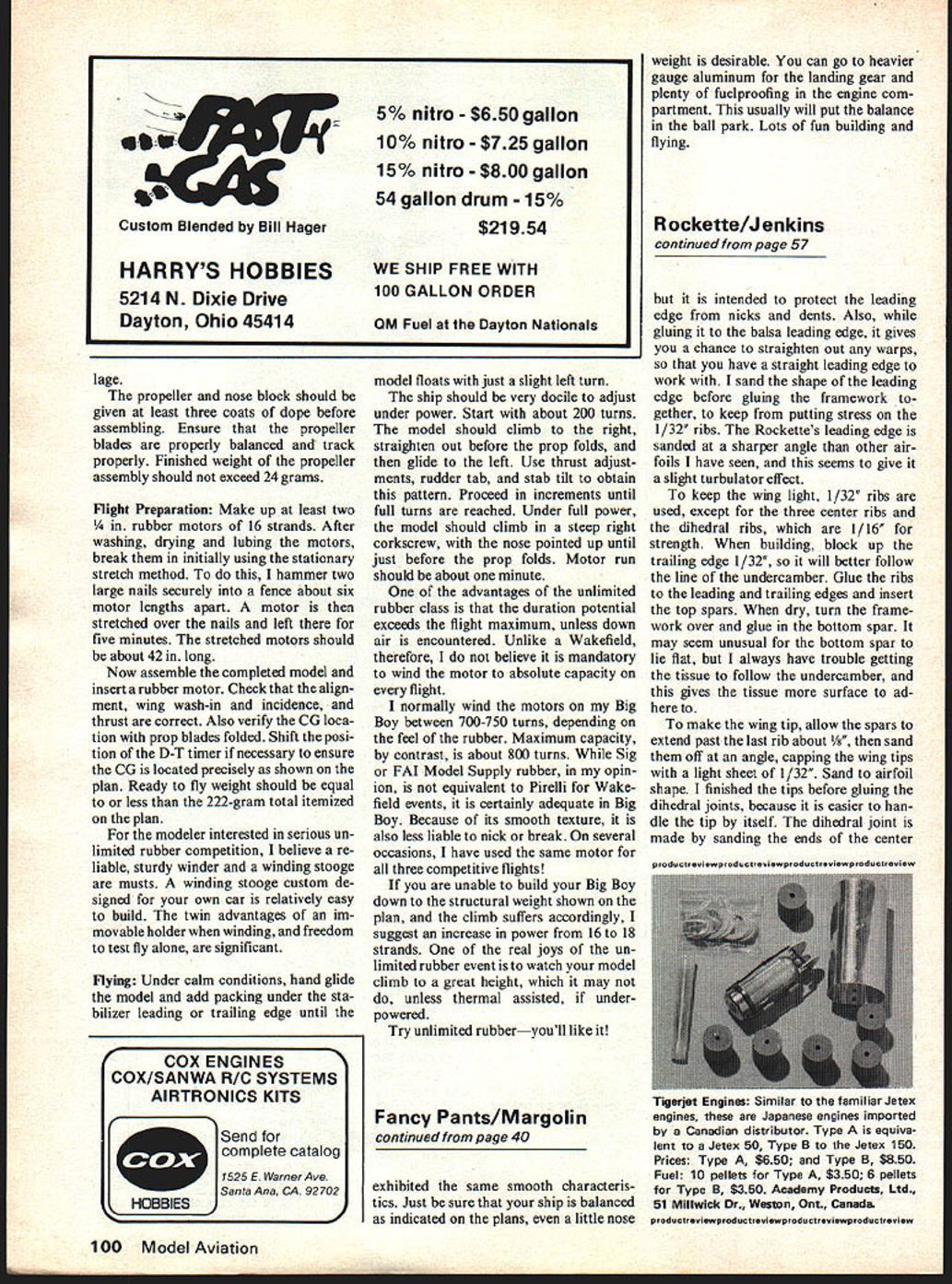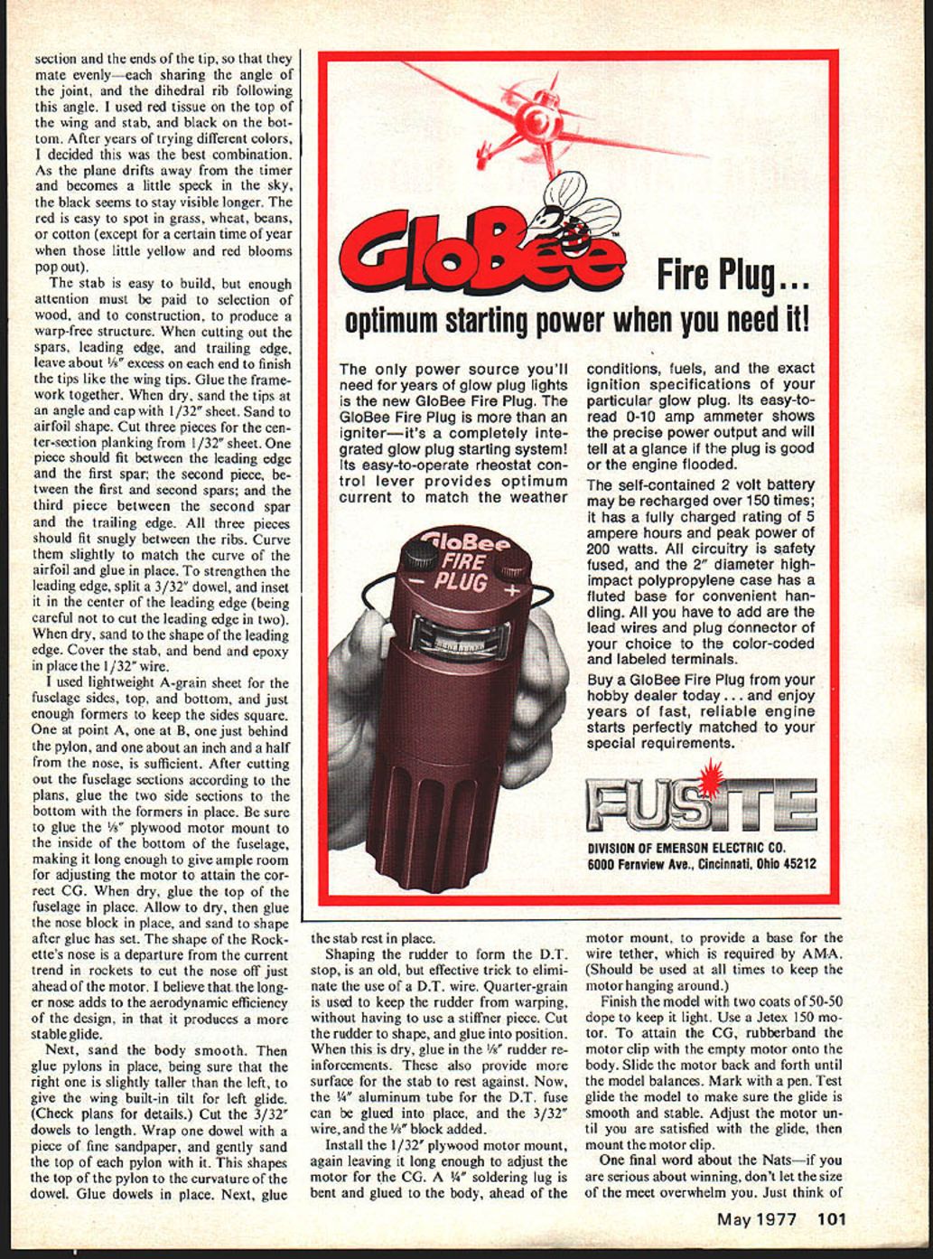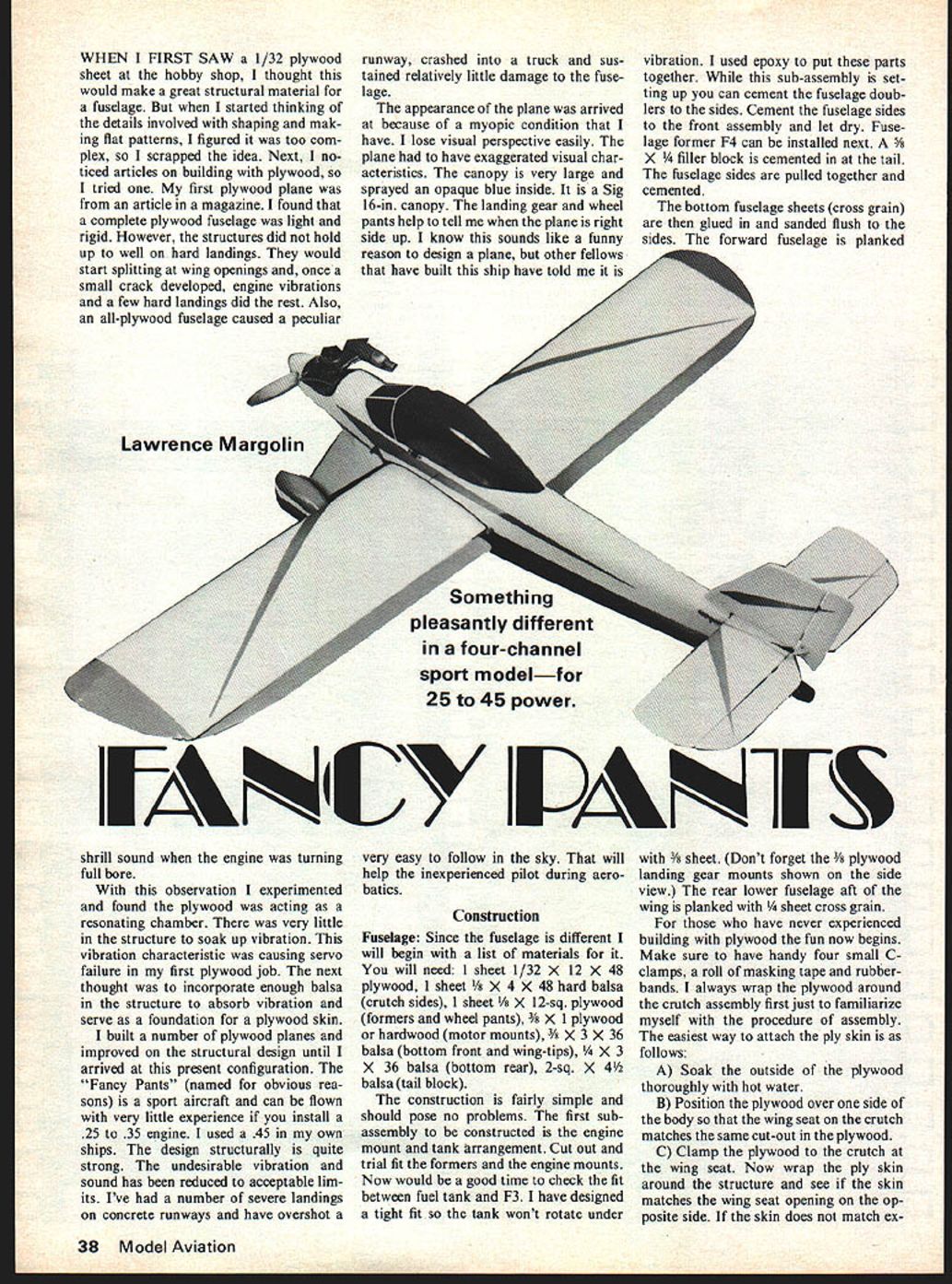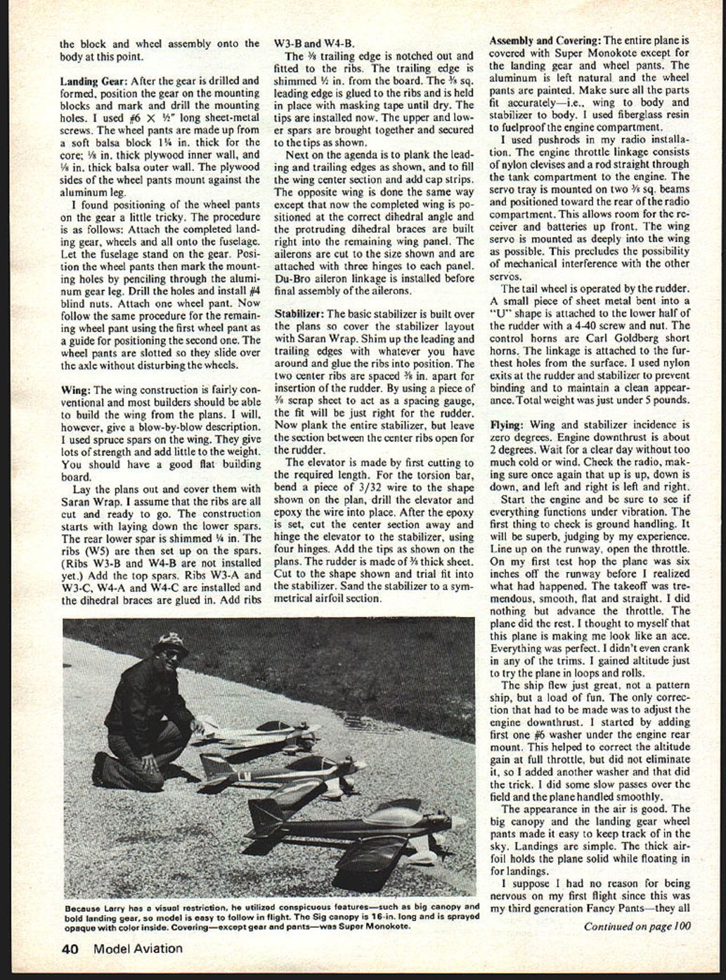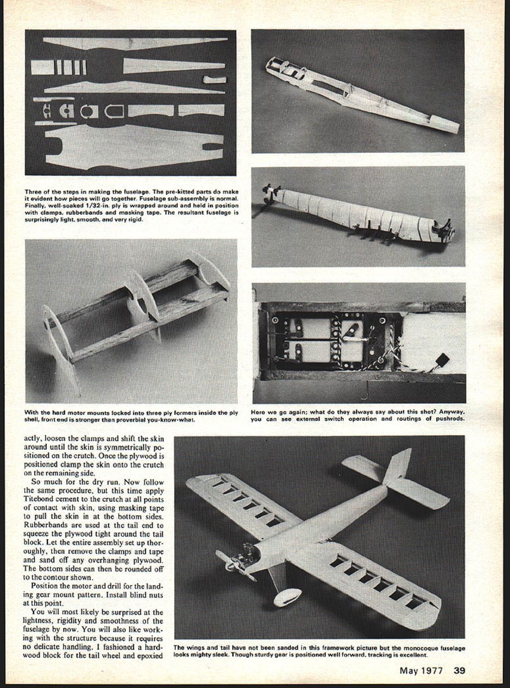 WHEN FIRST SAW 1/32 plywood sheet hobby shop thought would make great structural material fuselage started thinking details involved shaping mak ing flat patterns figured too com plex scrapped idea Next no ticed articles building plywood tried first plywood plane article magazine found complete plywood fuselage light rigid However structures did hold up well hard landings would start splitting wing openings once small crack developed engine vibrations few hard landings did rest Also all-plywood fuselage caused peculiar shrill sound engine turning full bore observation experimented found plywood acting resonating chamber very little structure soak up vibration vibration characteristic causing servo failure first plywood job next thought incorporate enough balsa structure absorb vibration serve foundation plywood skin built number plywood planes improved structural design until arrived present configuration Fancy Pants named obvious rea sons sport aircraft can flown very little experience install 25 35 engine used 45 own ships design structurally quite strong undesirable vibration sound has reduced acceptable lim its Ive number severe landings concrete runways have overshot runway crashed truck sus tained relatively little damage fuse lage appearance plane arrived because myopic condition have lose visual perspective easily plane have exaggerated visual char acteristics canopy very large sprayed opaque blue inside Sig 16-in canopy landing gear wheel pants help tell plane right side up know sounds like funny reason design plane other fellows have built ship have told very easy follow sky will help inexperienced pilot during aero batics Construction Fuselage Since fuselage different will begin list materials will need 1 sheet 1/32 X 12 X 48 plywood sheet X 48 hard balsa crutch sides sheet 1/8 X 12-sq plywood formers wheel pants /s X 1 plywood hardwood motor mounts /8 X 3 X 36 balsa bottom front wing-tips /4 X 3 X 36 balsa bottom rear 2-sq X 4 balsa tail block construction fairly simple should pose no problems first sub assembly constructed engine mount tank arrangement Cut out trial fit formers engine mounts Now would good time check fit between fuel tank F3 have designed tight fit tank wont rotate under vibration used epoxy put parts together sub-assembly set ting up can cement fuselage doub lers sides Cement fuselage sides front assembly let dry Fuse lage former F4 can installed next X er block cemented tail fuselage sides pulled together cemented bottom fuselage sheets cross grain glued sanded flush sides forward fuselage planked /8 sheet Dont forget ood landing gear mounts shown side view rear lower fuselage aft wing planked t cross grain have never experienced building plywood fun now begins Make sure have handy four small Cclamps roll masking tape rubberbands always wrap plywood around crutch assembly first just familiarize myself procedure assembly easiest way attach ply skin follows A Soak outside plywood thoroughly hot water B Position plywood over side body wing seat crutch matches same cut-out plywood C Clamp plywood crutch wing seat Now wrap ply skin around structure see skin matches wing seat opening op posite side skin does match ex 38 Model Aviation N Lawrence Margolin FANCY IDA 1 Something pleasantly different four-channel sport modelfor 25 45 power 11-s actly loosen clamps shift skin around until skin symmetrically po sitioned crutch Once plywood positioned clamp skin onto crutch remaining side So much dry run Now follow same procedure time apply Titebond cement crutch points contact skin using masking tape pull skin bottom sides Rubberbands used tail end squeeze plywood tight around tail block Let entire assembly set up thor oughly remove clamps tape sand off overhanging plywood bottom sides can rounded off contour shown Position motor drill land ing gear mount pattern Install blind nuts point will likely surprised lightness rigidity smoothness fuselage now will also like work ing structure because requires no delicate handling fashioned hard wood block tail wheel epoxied May1977 39 Three steps making fuselage pre-kitted parts make evident pieces will go together Fuselage sub-assembly normal Finally well-soaked 1/32-in ply wrapped around held position clamps rubberbands masking tape resultant fuselage surprisingly light smooth very rigid hard motor mounts locked three ply formers inside ply shell front end stronger proverbial you-know-what go again what always say about shot Anyway can see external switch operation routings pushrods wings tail have sanded framework picture monocoque fuselage looks mighty sleek Though sturdy gear positioned well forward tracking excellent block wheel assembly onto body point Landing Gear After gear drilled formed position gear mounting blocks mark drill mounting holes used #6 X sheet-metal screws wheel pants made up soft balsa block thick core /t thick plywood inner wall thick balsa outer wall plywood sides wheel pants mount against aluminum leg found positioning wheel pants gear little tricky procedure follows Attach completed land ing gear wheels onto fuselage Let fuselage stand gear Posi tion wheel pants mark mount ing holes penciling through alumi num gear leg Drill holes install #4 blind nuts Attach wheel pant Now follow same procedure remain ing wheel pant using first wheel pant guide positioning second wheel pants slotted slide over axle disturbing wheels Wing wing construction fairly con ventional builders should able build wing plans will however give blow-by-blow description used spruce spars wing give lots strength add little weight should have good flat building board Lay plans out cover Saran Wrap assume ribs cut ready go construction starts laying down lower spars rear lower spar shimmed ribs W5 set up spars Ribs W3-B W4-B installed yet Add top spars Ribs W3-A W3-C W4-A W4-C installed dihedral braces glued Add ribs W3-B W4-B trailing edge notched out fitted ribs trailing edge shimmed d sq leading edge glued ribs held place mask
