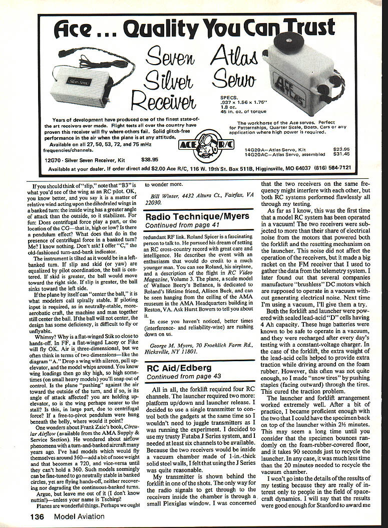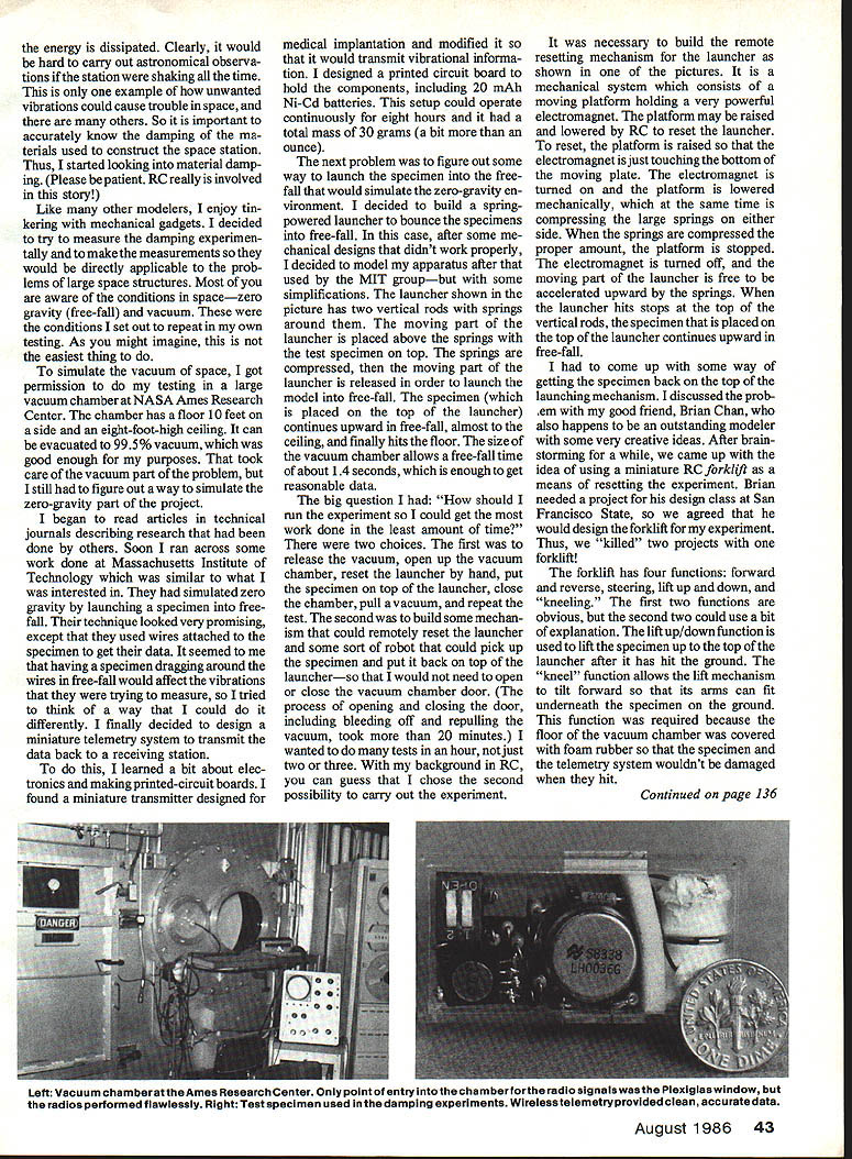 fl4jj IJL As often has past RC once again comes aid high-tech researcher instance its op erate test equipment inside NASA vacuum chamber Maybe someday well see descendant setup operat ing vacuum outer space EDon Edberg THIS IS THE STORY used skills knowledge gained years modeling carry out some engineering research efficient way have flying RC Sailpianes over 13 years among chal lenging unique uses RC Ive run across story began about two years ago graduate student Stanford University northern California beginning plan dissertation approached advisor some advice suggested investigate subject damping What damping may ask quality materials dissipates ener gy vibration instance ring bell ringing eventually stops bell rung vacuum another hr way expressing laws thermody namics say simplified terms cant get something nothing other words because no material perfect will dissipate energy eventually stop vibrating suggested damping topic because very important behavior space structures particularly large flimsy ones Imagine yourself astronaut new space station space shuttle docks bit hard sends shock waves through station damping very lnw tRtifln will vlhr2tp far haiir ,nt1 Left inside chamber priorto vacuum being drawn forklift Futaba J-seriea transmitter ueed operate Notice Ni-Cds previous picture have repiaced seaied gel cells known operate safely under vacuum Right RC spring-powered resettable launcher Abiiity retrieve test specimen reset launcher outside chamber saved hours 42 Model Aviation 7Shown during its development testing outside vacuum chamber RC forkiift returns iauncher carrying test specimen 6-in rule shows relative sizes energy dissipated Clearly would hard carry out astronomical observa tions station shaking time example unwanted vibrations could cause trouble space others So important accurately know damping ma terials used construct space station Thus started looking material damp ing Please patient RC really involved story Like other modelers enjoy tin kering mechanical gadgets decided try measure damping experimen tally make measurements would directly applicable prob lems large space structures Most aware conditions spacezero gravity free-fall vacuum conditions set out repeat own testing As might imagine easiest thing simulate vacuum space got permission testing large vacuum chamber NASA Ames Research Center chamber has floor 10 feet side eight-foot-high ceiling can evacuated 995% vacuum good enough purposes took care vacuum part problem still figure out way simulate zero-gravity part project began read articles technical journals describing research done others Soon ran across some work done Massachusetts Institute Technology similar what interested simulated zero gravity launching specimen freefall technique looked very promising except used wires attached specimen get data seemed having specimen dragging around wires free-fall would affect vibrations trying measure tried think way could differently finally decided design miniature telemetry system transmit data back receiving station learned bit about elec tronics making printed-circuit boards found miniature transmitter designed medical implantation modified would transmit vibrational informa tion designed printed circuit board hold components including 20 mAh Ni-Cd batteries setup could operate continuously eight hours total mass 30 grams bit ounce next problem figure out some way launch specimen freefall would simulate zero-gravity en vironment decided build springpowered launcher bounce specimens free-fall case after some chanical designs didnt work properly decided model apparatus after used MIT groupbut some simplifications launcher shown picture has two vertical rods springs around moving part launcher placed above springs test specimen top springs compressed moving part launcher released order launch model free-fall specimen placed top launcher continues upward free-fall almost ceiling finally hits floor size vacuum chamber allows free-fall time about 14 seconds enough get reasonable data big question should run experiment could get work done least amount time two choices first release vacuum open up vacuum chamber reset launcher hand put specimen top launcher close chamber pull vacuum repeat test seoond build some mechan ism could remotely reset launcher some sort robot could pick up specimen put back top launcherso would need open close vacuum chamber door process opening closing door including bleeding off repulling vacuum took 20 minutes wanted tests hour just two three background RC can guess chose second possibility carry out experiment necessary build remote resetting mechanism launcher shown pictures mechanical system consists moving platform holding very powerful electromagnet platform may raised lowered RC reset launcher reset platform raised electromagnet just touching bottom moving plate electromagnet turned platform lowered mechanically same time compressing large springs either side springs compressed proper amount platform stopped electromagnet turned off moving part launcher free accelerated upward springs launcher hits stops top vertical rods specimen placed top launcher continues upward free-fall come up some way getting specimen back top launching mechanism discussed prob em good friend Brian Chan also happens outstanding modeler some very creative ideas After brain storming came up idea using miniature RC forklift means resetting experiment Brian needed project design class San Francisco State agreed would design forklift experiment Thus killed two projects forklift forklift has four functions forward reverse steering lift up down kneeling first two functions obvious second two could use bit explanation lift up/down function used lift specimen up top launcher after has hit ground kneel function allows lift mechanism tilt forward its arms can fit underneath specimen ground function required because floor vacuum chamber covered foam rubber specimen telemetry system wouldnt damaged hit Continued p
