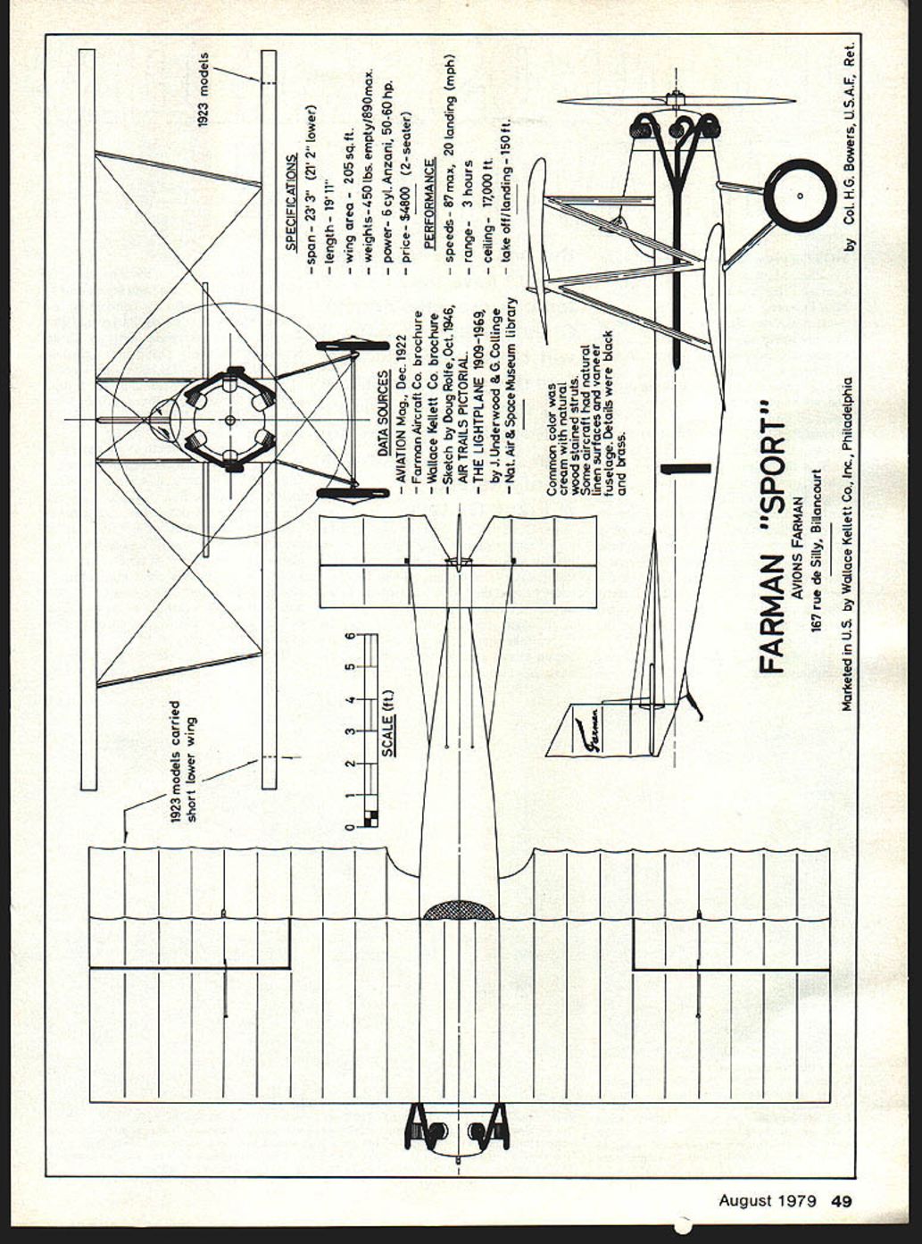 _____________________________ __________ 0 U U V 1923 modeLs carried short Lower wing N 123456 IIIII SCALE ft IL 7 I DATA SOURCES AVIATION Mug Dec1922 Furman Aircraft Co brochure WaLlace Kellett Co brochure Sketch Doug RolfeOct 1946 AIR TRAILS PICTORIAL THE LIGHTPLANE 1909-1969 J Underwood & G Collinge Nat Air & Space Museum library Common color cream natural wood stained struts Some aircraft natural Linen surfaces vaneer fuseLage Details black brass 1923 models SPECIFICATIONS span- 233 2V 2 lower length 19 11 wing area 205 sqft weights-450 Lbs empty/890max power- 6 cyl Anzani 50-60 hp price- $4800 2-seater PERFORMANCE speeds- 87max 20 landing mph range- 3 hours ceiling- 17000 ft take off/Landing- 150 ft ______________ -1 FARMAN SPORT AVIONS FARMAN 167 rue de Silly Billancourt Marketed US Wallace Kellett Co Inc Philadelphia Ii____ Col H G Bowers U SAF Ret fri j~i/ C 0 C 1 0 CD