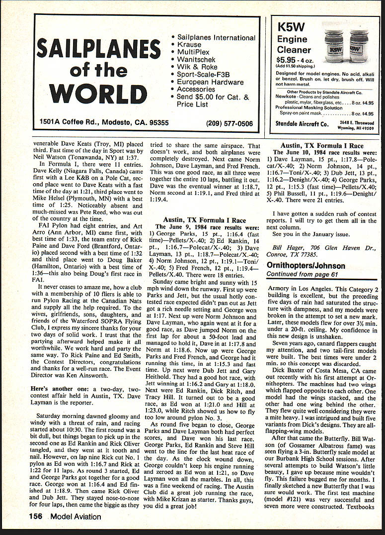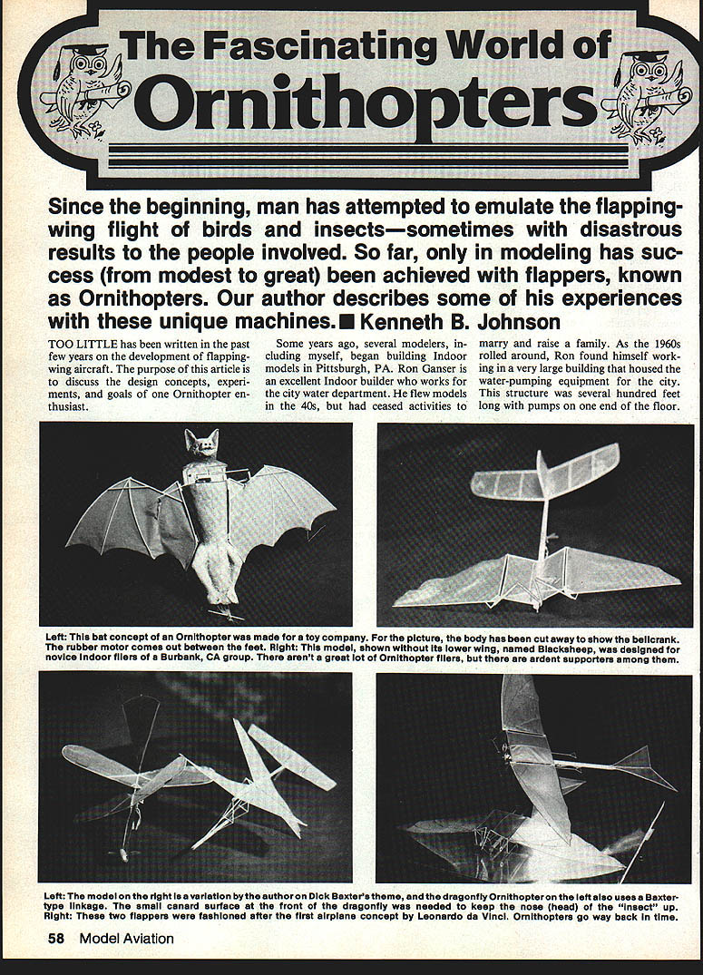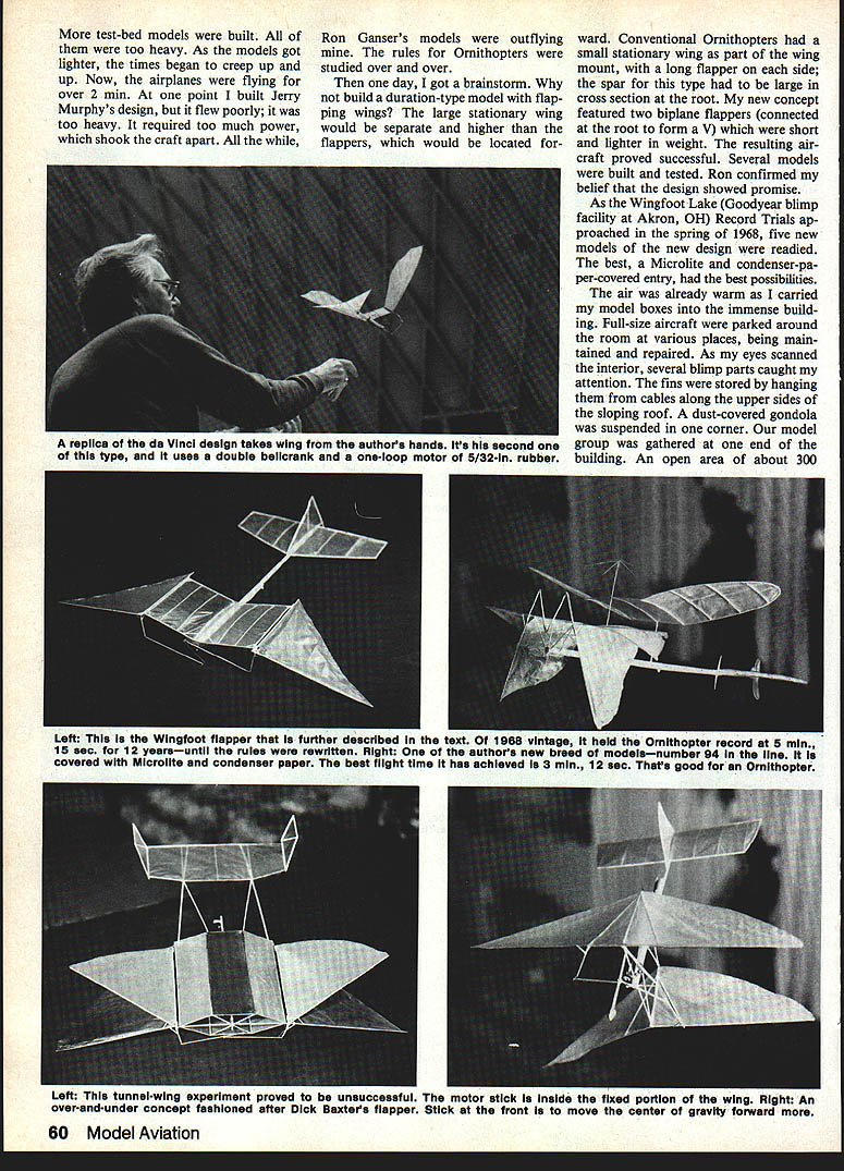 Since beginning man has attempted emulate flappingwing flight birds insectssometimes disastrous results people involved So far modeling has suc cess modest great achieved flappers known Ornithopters author describes some experiences unique machinesE Kenneth B Johnson TOO LITTLE has written past Some years ago several modelers in- marry raise family As 1960s few years development flapping- cluding myself began building Indoor rolled around Ron found himself workwing aircraft purpose article models Pittsburgh PA Ron Ganser ing very large building housed discuss design concepts experi- excellent Indoor builder works water-pumping equipment city ments goals Ornithopter en- city water department flew models structure several hundred feet thusiast 40s ceased activities long pumps end floor Left bat concept Ornithopter made toy company picture body has cut away show belicrank rubber motor comes out between feet Right modei shown its iower wing named Biackaheep designed novice indoor fiiers Burbank CA group arent great iot Ornithopter fiiers ardent supporters among Left modei right isa variation bythe author Dick Baxters theme dragonfiy Ornithopter ieftaiso uses Baxtertype iinkage smaii canard surface front dragonfiy needed keep nose head insect up Right two flappers fashioned after first airplane concept Leonardo da Vinci Ornithopters go way back time 58 Model Aviation other half building free obstructions 70-ft ceiling clean exception traveling crane ran length room Ron vited group come fly models him site Saturday morn ing would bring new creations Rons help trimming fly models hearts content soon progressed novice stage intermediate stage builders fliers least once session found ourselves climbing metal ladder ceiling driving crane down tracks dislodging trapped airplane bamboo pole Saturday Ron opened model box introduced us craft ef fect life greatly Ornithopter model very intriguing try having plan build tried design own crude say least next gathering took along new Ornithopter fly As lifted box Ron ex cused himself few minutes re turned own new flapper beautiful very impressed day Rons model flew about 2 mm best time flap per could manage 26 sec believe competitive spirit born day going build flapper someday would beat model Back workshop sketches made model tried analyze what made fly well Ornithopters fill ing mind more art job ad agency sketches flapper linkages started appearing margin pad lunchtime scraps paper reflected mind night drawings came life models Some ideas worked did Linkage setups constructed cardboard test hinge points throws Left A vertical flapper concept far-out design test theory flappers can go side side stiit efficient Note simpie A-frame mount Right Phase 2 modei author did over 31/2 mm Navy/Marine Corps armoryi 980 vintage Left Rear view Canard No 2 departure French design separate center wing panel flaps Independently two outer paneis Right authors replica modeis Eagie swept-forward wings Thread X-bracing strengthens fixed section November 1984 59 Dick Baxter winds rubber motor wife Shirley Mrs Baxter buiit wing-beater modelher first onefrom Japanese kit fiies very well either indoors outdoors test-bed models built too heavy As models got lighter times began creep up up Now airplanes flying over 2 mm point built Jerry Murphys design flew poorly too heavy required too much power shook craft apart Ron Gansers models outflying rules Ornithopters studied over over day got brainstorm build duration-type model flap ping wings large stationary wing would separate higher flappers would located forward Conventional Ornithopters ad small stationary wing part th wing mount long flapper eacl side spar type large cross section root new concept featured two biplane flappers connected root form V short lighter weight resulting air craft proved successful Several models built tested Ron confirmed belief design showed promise As Wingfoot Lake Goodyear blimp facility Akron OH Record Trials ap proached spring 1968 five new models new design readied best Microlite condenser-pa per-covered entry best possibilities air already warm carried model boxes immense build ing Full-size aircraft parked around room various places being main tained repaired As eyes scanned interior several blimp parts caught attention fins stored hanging cables along upper sides sloping roof dust-covered gondola suspended corner model group gathered end building An open area about 300 Left This Wingfoot flapper tnat Turther described text 1968 vintage held Ornithopter record 5 mm 15 sec 12 yearsuntIl rules rewrItten Right authors new breed modelsnumber 94 line covered Microite end condenser paper best flight time has achieved 3 mm 12 sec Thats good en OrnIthopter Left This tunnel-wing experiment proved unsuccessful motor stick inside fixed portion wing NIgnt Rn over-and-under concept fashioned after Dick Baxters flapper Stick front move center gravity forward 60 Model Aviation replica da Vinci design takes wing authos hands Its mecona type uses double belicrank one-loop motor 5/32-in rubber square feet served launch site edges spotted model boxes familiar faces caught eye Bob Randolph Cleveland Con test Director busy making repairs microfilm Cabin model Bill Hulbert Akron working FAI ship Jerry Skrjanc testing- ROG model Jerry well known owner Micro-X company sells Indoor model supplies Down room Edmond Smith flying Ornithopter As began test heavier models apparent air getting warmer buoyant point noticed beads sweat face Bob Ran dolph stopped patching microfilm prop mop away moisture forehead heavy models coming down good times As afternoon wore times over 3 mm lightest flapper being saved last first flights machine showed potential flapper spars broken several times rub ber too powerful craft After repairs made Jerry Skrjanc suggested try some new Pirelli rubber made up 13-in motor 070 pre-wound breaking-in asked timer wound model model climbed almost 70 ft settled its cruise touch down clock read 5 mm 15 