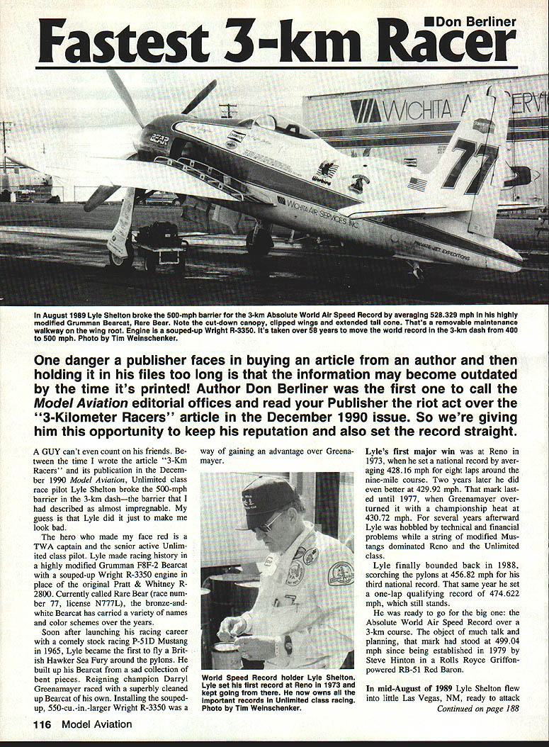 EDon Berliner Fastest 3-km Racer August 1989 Lyle Shelton broke 500-mph barrier 3-km Absolute World Air Speed Record averagIng 528329 mph highly modified Grumman Bearcat Rare Bear Note cut-down canopy clipped wings extended tall cone Thats removable maintenance walkway wing root Engine souped-up Wright R-3350 its taken over 58 years move world record 3-km dash 400 500 mph Photo Tim Weinschenker danger publisher faces buying article author holding files too long information may become outdated time its printed Author Don Berliner first call Model Aviation editorial offices read Publisher riot act over 3-Kilometer Racers article December 1990 issue So giving him opportunity keep reputation also set record straight GUY cant count friends tween time wrote article 3-Km Racers its publication Decem ber 1990 Model Aviation Unlimited class race pilot Lyle Shelton broke 500-mph barrier 3-km dashthe barrier described almost impregnable guess Lyle did just make look bad hero made face red TWA captain senior active Unlim ited class pilot Lyle made racing history highly modified Grumman F8F-2 Bearcat souped-up Wright R-3350 engine place original Pratt & Whitney R 2800 Currently called Rare Bear race num ber 77 license N777L bronze-andwhite Bearcat has carried variety names color schemes over years Soon after launching racing career comely stock racing P-51D Mustang 1965 Lyle became first fly Brit ish Hawker Sea Fury around pylons built up Bearcat sad collection bent pieces Reigning champion Darryl Greenamayer raced superbly cleaned up Bearcat own Installing souped up 550-cu-in-larger Wright R-3350 way gaining advantage over Greena mayer Lyles first major win Reno 1973 set national record aver aging 42816 mph eight laps around nine-mile course Two years later did better 42992 mph mark last ed until 1977 Greenamayer over turned championship heat 43072 mph several years afterward Lyle hobbled technical financial problems string modified Mus tangs dominated Reno Unlimited class Lyle finally bounded back 1988 scorching pylons 45682 mph third national record same year set one-lap qualifying record 474622 mph still stands ready go big Absolute World Air Speed Record over 3-km course object much talk planning mark stood 49904 mph since being established 1979 Steve Hinton Rolls Royce Griffon powered RB-5 1 Red Baron mid-August 1989 Lyle Shelton flew little Las Vegas NM ready attack Continued page 188 116 Model Aviation World Speed Record holder Lyle Shelton Lyle set first record Reno 1973 kept going now owns important records Unlimited class racing Photo Tim Weinachenker II1H No 679 Big Bingo $1700 Large RO Sportster spans 85 120-24 power Two plan sheets No 680 Beliaevs Winner $475 Russian FAI CL Combat ship spans 47 No681 1969 Bede BD-4 $325 FF Rubber Scale model spans 185 No 193StIletto CL Stunt model McDonald winner 1976 1980 1982 FAI Worid ChampsS375 No 262Creshmaster CL Crash-proof trainer two sizes15/30 35/40 power$125 No 3101930 Fleet Biplane AC Sport Scale 35/40 4-channel Wingspan 56 scale Two sheets$625 No 314Dreke II AC Ken Willards flying boat 3-channel 15-power Fly fmm land mmonahle gear$375 No 326Taylor Cub RC Don SmIls Schoolyard-Scale 0495 2-3 cheonel Spans 50 in$3SO No 332Zephyr AC Small 2-channel glider hand-launch tow thermal ofope soaring$200 No 386Laser 200 AC Sport Scale replica championship Aerehatic flier Uses 40 power 4-5 channel Two sheetsS1075 No 447112A Mia America AC Old-timer Teoaco model 049 giow 2-channels8650 No 4604-40 AC Shoulder-wing sport flier 4-cycle 40-oize engine 4 channels$698 No 465Biue Max II AC Fun-fly opertoter 40-nize eegines spans 52 Lightweight strectureS700 No 539Simitar Slow-MotIon 15 AC Tailless flying wing 15 engleen spans 60 uses 3-ch AC$398 No 578Schwelzer 1-269 AC Quarter-scale Sailplane spans 125 io Two plan sheets$1475 No 581Gee Bee Model Y AC Golden Age Aacer spans 72 1A scale 60 power Three plan sheets$1175 No 588Mariah AC Slope-Searing Sailplaee spans 41 in. uses 2 AC channels$425 No 593Taylororaft AC Sport Scale lighiplane builds standard 2-placer clipped-wing air show stonIer Spans either 70 561/a 30/40 two-otmke 40/48 four-streke engine Two plan oheets no documeotaton$1000 No 598Coronet 150 AC-Assist Old-Timer enlarged 150% spans 72 in. cues 40-sire 4-stroke/30-size 2-streke$850 No 603Sparrow Hawk P30 PP Competition rebber-power plane won g gets Spans 30 inS225 No 607Curetaa Seagull AC Giant Scale biplane spans 98 uses QaadralZoooah power Three plan sheets no decS24 00 No 809Taperwing AC Pylon Aacer spans 2it1/n Plan plus parts template shootS6 00 No 610Protobype AC Sport biplane spaos 48 uses 45/2-cycle 80/4-cycle power9650 No 619KeIth Rider R4 FF Scale Golden Age racer rebber power opens 16 in$300 No 620Gimlet 40 AC Sport/Puflem plane spans 60 40150 engine 2 sheets611 00 No 623Henderson Longster AC Quarter-scale 1933 fusser spans 90 4-stroke 40148 engine 3 plan shf. no docS1650 No 624Keleher Lark AC Quarter-scale homebuifi opens 69 601904-streke power 2 plan sheets no dec81100 No 828Sweepee AC Sport/Pattere canards forward-swept wing spans 04 uses 40 power 2 plan sheets$1300 No 628Prime Cue AC Spert/Aerebatic plane spans 90 uses Quadra 35140-sloe power Two plan sheetsS13 00 No 630original Ply Baby AC Old-timer spans 72 ones 19125 2-cycle 40 4-cycle power 2 plan sheets611 50 No 535The Gambler PP IndoOr Bostonian rebber-power cabin plane spans 15% inS2 00 No 641LII 01 Reliable AC Old-Timer spurt filer spans SOW Por engines$575 No 644Belianca Columbia AC Schoolyard Scale 2 AC channels engine Wingspan 48 inS 575 No 648Winter Hawk PP Rubber-power Coupe dHiner competiton plane spans 47 inS375 No 85047188 RC Special AC Aerohatic sport plane 40 power spans 6110 3 plan sheetsS1075 No 651Consortium AC Hand-Launch Hi-Start Glider spans 60 inS650 No 652Ocr Piedermaus AC Low-wing sport plane 20125 power spans 55 in$675 No 854Tamecat AC Trainer/spnrtster styled like P14 spans 98 40161 power Pour plan sheets51525 No 655Astroatar PP AMA Class A/B Gas plane span