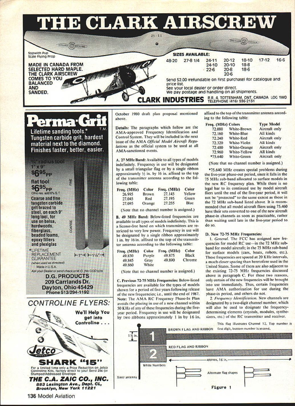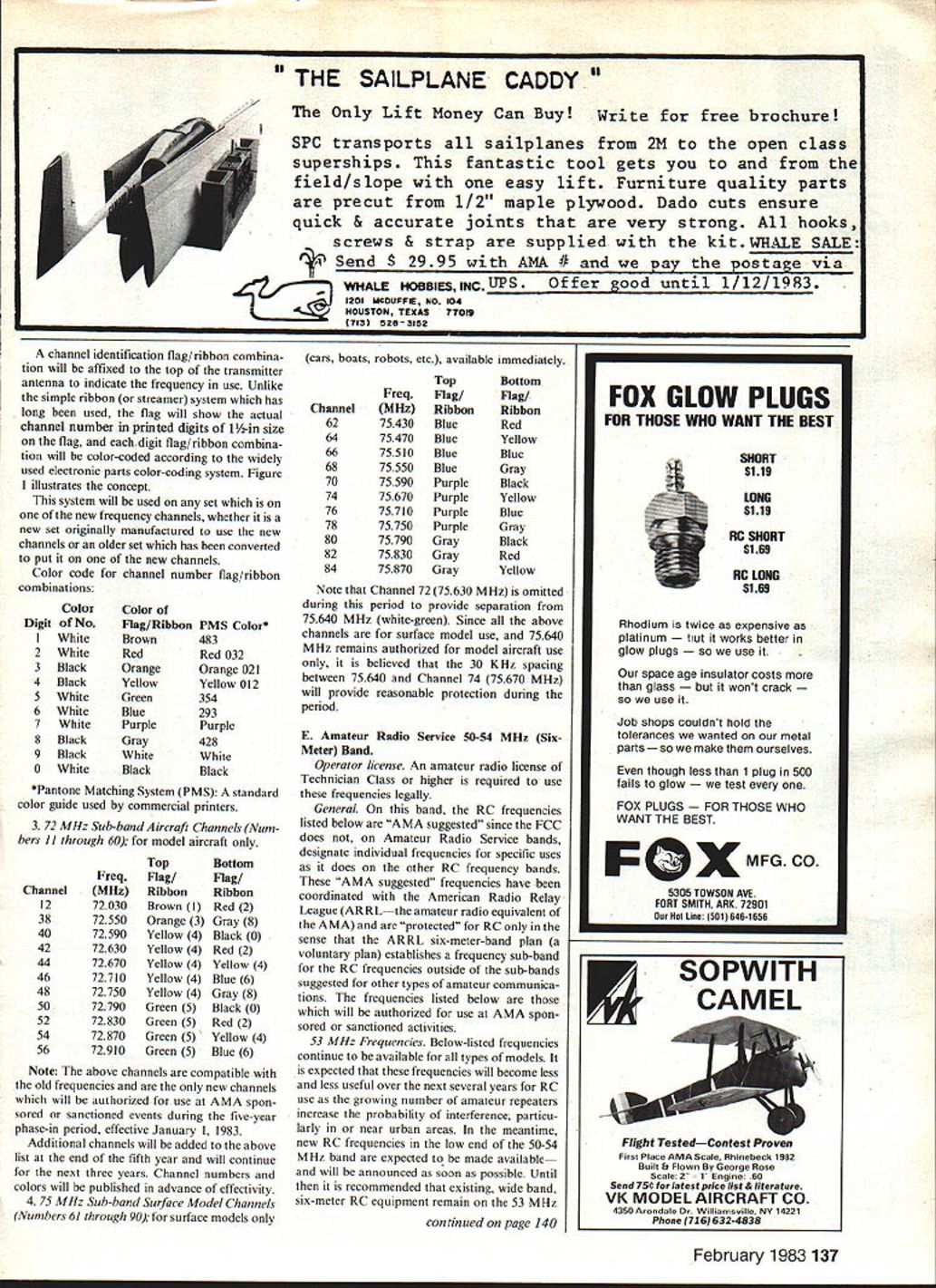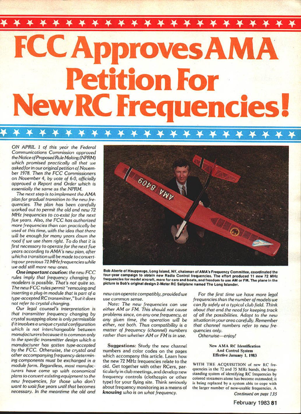 FCC Approves AMA Petition NewRC Frequencies ON APRIL 1 year Federal Communications Commission approved Notice Proposed Rule Making NPRM promised practically asked original petition Novem ber 1978 FCC Commissioners November 4 vote 6-0 officially approved Report Order essentially same NPRM next step implement AMA plan gradual transition new fre quencies plan has carefully worked out permit old new 72 MHz frequencies co-exist next five years Also FCC has authorized frequencies can practically used time idea will enough years down road use right first necessary operate next five years according AMAS new plan after transition will made convert ing previous 72 MHz frequencies add still new ones important caution new FCC rules imply frequency changing modelers possible Thats quite new FCC rules permit removing inserting plug-in module part type-accepted RC transmitter does refer crystal changing legal counsels interpretation transmitter frequency changing crystal swapping alone permissible involves unique crystal configuration interchangeable between manufacturers because common specWc transmitter design manufacturer has gotten type-accepted FCC Otherwise crystal other accompanying frequency-determin ing components must exchanged module form Regardless manufac turers have come up economical plans convert existing equipment new frequencies dont want wait five years until becomes necessary meantime old new can operate compatibly provided use common sense Note new frequencies can use either AM FM should cause problems since frequency given time operation will either both Thus compatibility matter frequency channel numbers rather whether AM FM use Suggestions Study new channel numbers color codes pages accompany article Learn new 72 MHz frequencies relate old Get together other RCers par ticularly club meetings develop new frequency controls clothespin other type flying site Think seriously about frequency monitoring means knowing what frequency first time have legal frequencies number models can fly safely typical club field Think about need keeping track possibilities Adapt new situation area carefully Remember channel numbers refer new fre quencies Otherwiseenjoy New AMA RC Identification Control System Effective January 1 1983 WITH THE ACQUISITION new RC fre quencies 72 75 MHz bands long standing system identifying RC frequencies colored streamers alone has become outmoded being replaced system able cope larger number now-usable frequencies Continued page 135 February 1983 81 Bob Aberie Hauppauge Long Island NY chairman AMAs Frequency Committee coordinated four-year campaign obtain new Radio Control frequencies effort produced 11 new 72 MHz frequencies model aircraft cars boats freedom use AM FM plane picture Bobs original design 2-Meter RC Sailplane named Long islander $MAStER AIRSCRFW RCSENTS SA STRIPPER 4 AT YOUR DEALER PRECISION STRIP WOOD TO V x Vs INS FROM BALSA SHEET ALSO FOR DRAFTING AND PHOTO MATS USES TYPE H BLADE SUPER TOOLGREAT PRICE WINDSOR PROPELLER Co 384 Tesconi Ct. Santa Rosa CA 96401 LEADER IN SMALL AIRFOIL TECHNOLOGY MAStER AIRSCREW biBLSVM5MASTER IMPROVED THROUGH FOUR YEARS OF PRODUCTION THE G/F SERIES IS UNEQUALED FOR PERFORMANCE & DURABILITY AVAILABLE WORLDWIDE THROUGH 131 DISTRIBUTORS 384 Tesconi Ct WINDSOR PROPELLER CO Santa Rosa CA 95401 As mentioned ahove Fly Baby has 106in wingspan chord 17 gives about 700 sq effective wing area about 20 lh. should Oviust like real Qttadra 4-scale SESA has 80-in wingspan 15-in ehord Thats ahout 2300 squares effective wing Quadra about 20 pounds total weight should another good combination 3-scale version mea sures 106-in span 20-in chord ith weight estimated 25 28 lb wing Quadra would probably fly would recommend little power Both SESs have simple effective cahane structure using wood no wire wire bend ing required smaller model shows very non-scale semi-symmetrical airfoil Its value would non-scale inverted performance big version has what looks like close-toscale undercambered airfoil would little harder build cover ssould look better Ily realistically three ol plans good starting point producing Giant Scale versions original planes hut youll need experience yours someone elsesl make best use New Quadra As November 12 TML scheduled start production new 50cc Quadra during first week December time read will starting ship ment will take until January February get full production fill distribu tion pipeline Bob Beckman 8248 Ho/i Grove Ct. Manassat VA 22110 New RC Frequencies Continued page 81 draft proposal new frequency identification control system presented AMA Executive Council Frequency Committee fall 1980 published October 1980 Model Aviat ion magazine proposal AMA rnembers comments re quested number received considered committee put gether new approved AMA Frequency Iden tification Control System Key guidelines 1 All new RC frequencies assigised unique channel number Frequency flags will provide dual method identification a glance ie providing both number channel number flag color-coding both flag wind ribbons trans tmtter antenna same channel number will used desig nate frequency-determining elements crys tals modules synthesizers etc both RC transmitter receiver Actual frequencies may also shown items channel number primary method frequency identification concept numbered channels has used Europe RCers some time little confusion has also used years country handy label designate various TV marine CB frequencies 2 All old RC frequencies will given channel number frequency identification wtll remain ie through long-standing arrangement color-coded flags ribbons colors designate frequency use arrangement applies 27 M Hz 53 M Hz 72-75 MHz bands Please note however previous 72-75 MHz frequencies have five-year life following authorization new frequencies after old frequencies no longer authorized RC use 27 MHz 53 MHz RC channels have no formal end-of use date legal continue used indefinitely 3 The system also provides immediate visib