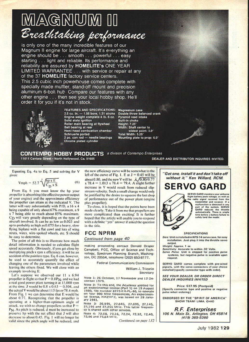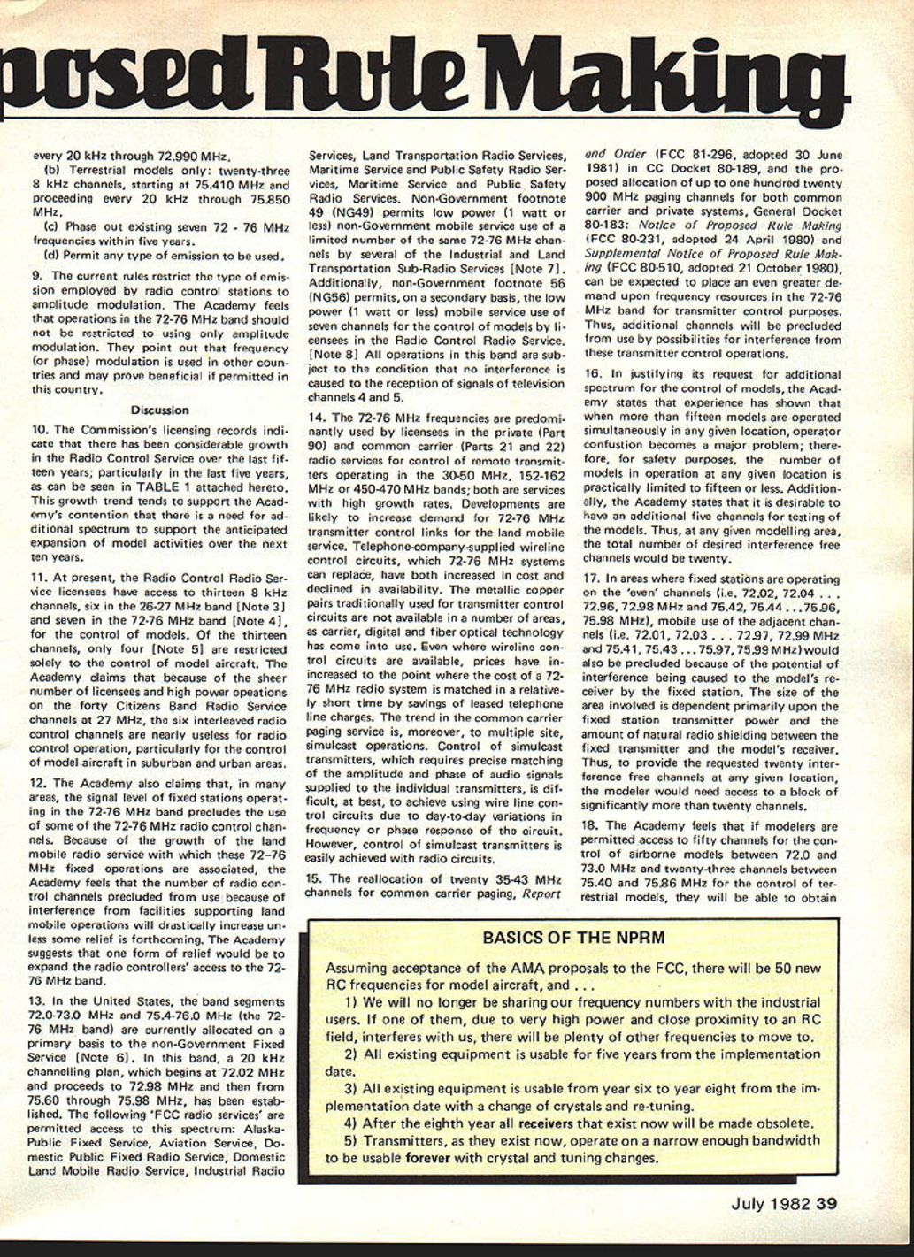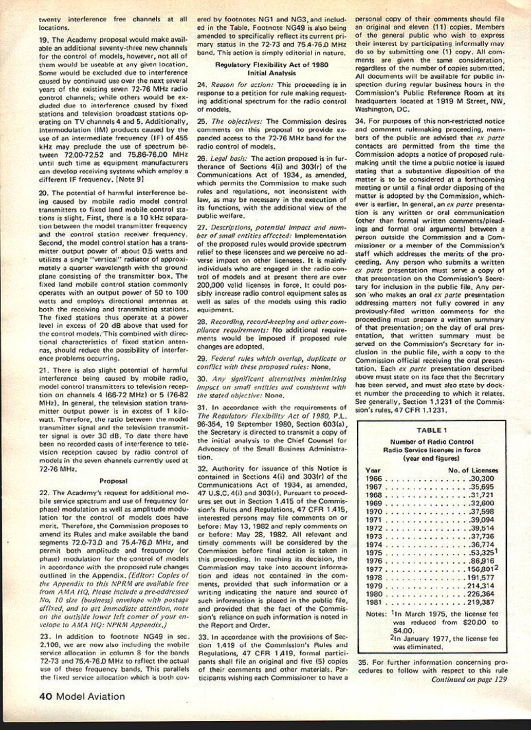 -I V-USI NvLiuc lyrpa Before FEDERAL COMMUNICATIONS COMMISSION Washington DC20554 Matter Amendment Parts 2 2122818790 95 Commissions Rules provide additional spectrum between 72 76 MHz radio control model aircraft boats cars other similar devices G-3 FCC 82-145 31081 General Docket 82-181 RM-3248 MHz radio control channels available due interference fixed land mobile operations industrial users use spectrum land mobile services growing 4 In addition need find replace ment frequencies 26-27 MHz 72-76 MHz channels Academy states need some 20 25 additional channels support growth Radio Control Radio Service over next ten years 5 As additional radio control channels requested might found Aced eny suggests secondary use ten 72-76 MHz channels currently allocated low power 1 watt less land mobile operations Special Industrial Manufacturers Railroad Radio Services along eleven guard band channels separating Govern ment non-Government allocations tween 30 42 MHz Academy also asks spectrum might found 222224 MHz 450-460 MHz 900 MHz bands 6 A series meetings held during fall 1979 Note 1] between members Commissions Staff Petitioner representatives several manufacturers radio control equipment discuss spectrum requirements manufacturers felt cause wide separation between eleven guard band channels between 30 42 MHz channels would well suited radio control models Commissions staff pointed out 222224 MHz band allocated part Amateur Radio Service attempt re-allocate spectrum would encounter much resistance amateur communi ty staff also pointed out heavy usage being made 450 460 MHz band Thus channels might readily available respect spectrum 900 MHz Academy indicated long term solution might use spectrum 900 MHZ however considerable testing would required before formal request could made Note 2] Adopted April 11982 Released April 131982 Commission Introduction 1 On 17 November 1978 Commission received petition CRM-3248 Acad emy Model Aeronautics Inc Academy requesting Commission amend Parts 2 95 Commissions Rules pro vide additional spectrum radio control model airplanes boats cars Acad emy stated additional spectrum needed order cope anticipated expan sion model activities during next ten years compensate diminished use existing thirteen frequencies 2699 2726 MHz 720 760 MHz bands due interference caused other op erations bands 2 The Academy states its petition because spectrum congestion high power operation forty Citizens Band Radio Service frequencies between 2696 2741 MHz 26-27 MHz band six inter leaved channels band allo cated Radio Control Radio Service nearly useless radio control operations 3 Currently Academy notes other spectrum available Radio Control Radio Service seven channels 72-76 MHz band however use second ary operational fixed stations Indus trial Land Transportation Public Safety Services well low power land mobile stations Manufacturers Radio Service According Academy num ber cities eg Houston TX Tampa FL etc few seven 72-76 7 As result series meetings Petitioner indicated near term 10 20 years spectrum requirements could best served allocation additional spec trum 72-76 MHz band end Petitioner established Joint Academy-Indus try Committee study nability ex panded radio control operations inter laced odd 20 kHz channels 72-76 MHz band ie 72.01 7203 7205 MHz etc establish technical parameters workable 72-76 MHz assignment plan 11 September 1980 Academy submitted Commission findings recom mendations Joint Committee Report 72-76 MHz Radio Control Systems dated September 1980 later modified letter dated 15 July 1981 8 The Academy Report proposes implemen tation additional 72-76 MHz frequencies follows a Model aircraft fifty 8 kHz chan nels starting 72010 MHz proceeding 38 Model Aviation IN JANUARY delegation Academy Frequency Committee met seven Federal Communications Commissioners Wash ington DC offices session 20-minute illustrated presentation given Fred Marks emphasize urgent need granting additional frequencies 72-76 MHz band soon scheduled action FCCS agenda special effort well received Commissioners climax four years AMA rts in-person meetings created better un derstanding within FCCS decision-making team concerning model avia tion growing need immediate relief minimal number radio frequencies presently available FCC April 1 voted adopt long-awaited Notice Proposed Rule Making NPRM released April 13 1982 public com ment Hundreds copies printed within hours after receipt mailed 200 key personnel including AMA officers model press model indus try Wednesday April 14 largest mailing printed packaged over 2200 AMA Chartered Clubs action newsletter editors publication FCC required responses NPRM within 30 days entailed rapid compressed schedule events Individuals received copies part key communications link AMA membership requested discuss NPRM club members AMA requested comments forwarded quickly possible preferably AMA Frequency Committee via AMA HQ Washington DC committee meet again April 30 May 1 draft single AMA response NPRM conjunction special weekend session model industry re view meeting planned coordinate industry inputs effort develop single AMA response NPRM behalf AMA membership should substantially decrease time required FCC decision expected release some 80 new frequencies later year Printed below NPRMBob Aberle Chairman AMA Frequency Committee NOTICE OF PROPOSED RULE MAKIrSG sdRuIE 20 kHz through 72990 MHz b Terrestrial models twenty-three 8 kHz channels starting 75410 MHz proceeding 20 kHz through 75850 MHz c Phase out existing seven 72 76 MHz frequencies within five years d Permit type emission used 9 The current rules restrict type emis sion employed radio control stations amplitude modulation Academy feels operations 72-76 MHz band should restricted using amplitude modulation point out frequency phase modulation used other coun tries may prove beneficial permitted country Discussion 10 The Commissions licensing records indi cate has considerable growth Radio Contr