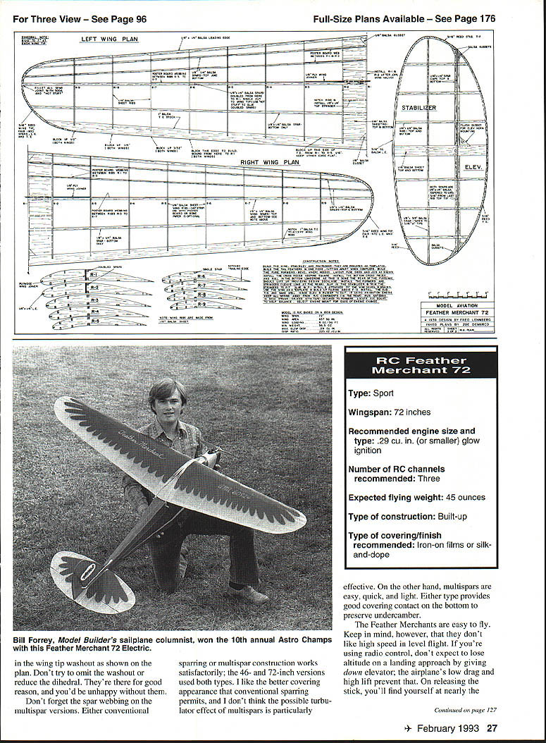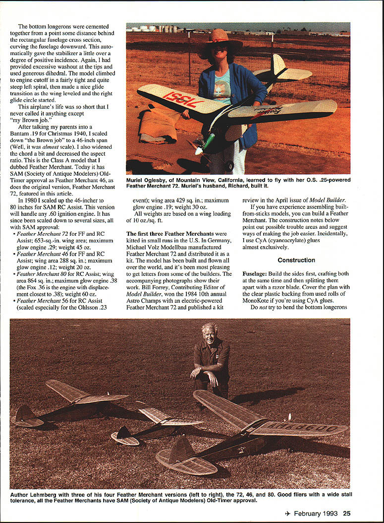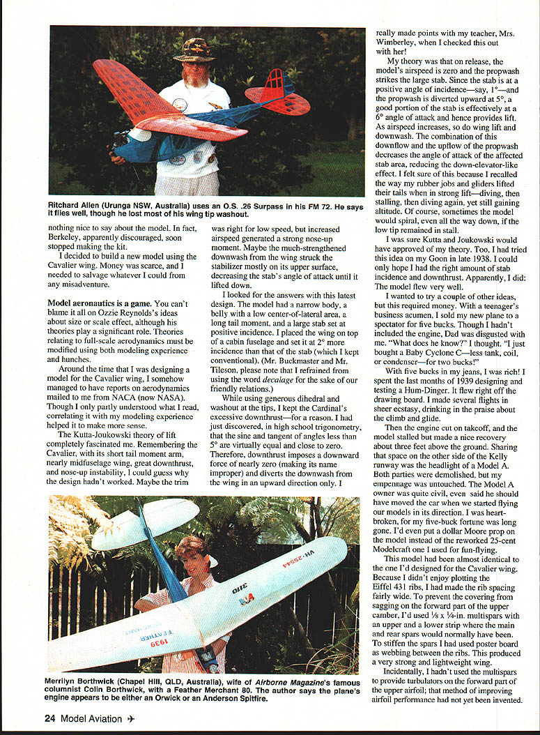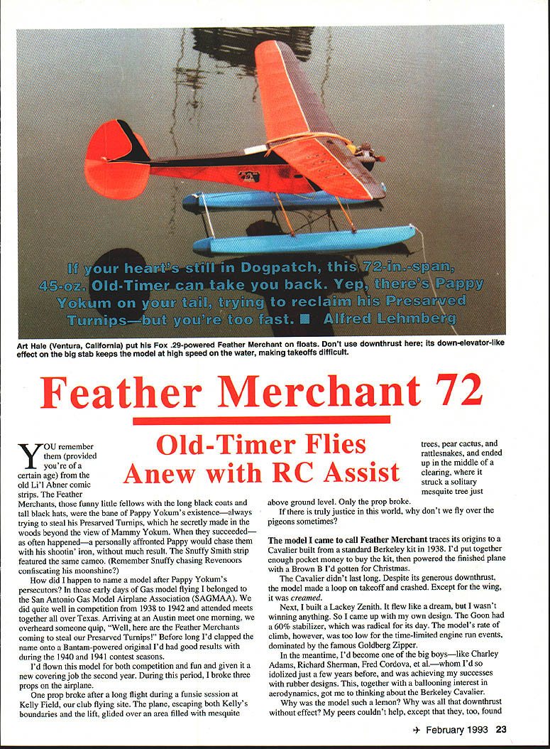 Art Hale Ventura California put Fox 2-powerea i-eather Merchant floats Dont use downthrust its down-elevator-like effect big stab keeps model high speed water making takeoffs difficult Feather Merchant 72 YOU remember provided youre certain age old Lil Abner comic strips Feather Merchants funny little fellows long black coats tall black hats bane Pappy Yokums existencealways trying steal Presarved Turnips secretly made woods beyond view Mammy Yokum succeeded often happeneda personally affronted Pappy would chase shootin iron much result Snuffy Smith strip featured same cameo Remember Snuffy chasing Revenoors confiscating moonshine did happen name model after Pappy Yokums persecutors early days Gas model flying belonged San Antonio Gas Model Airplane Association SAGMAA did quite well competition 1938 1942 attended meets together over Texas Arriving Austin meet morning overheard someone quip Well Feather Merchants coming steal Presarved Turnips Before long Id clapped name onto Bantam-powered original Id good results during 1940 1941 contest seasons Id flown model both competition fun given new covering job second year During period broke three props airplane prop broke after long flight during funsie session Kelly Field club flying site plane escaping both Kellys boundaries lift glided over area filled mesquite trees pear cactus rattlesnakes ended up middle clearing struck solitary mesquite tree just above ground level Only prop broke truly justice world dont fly over pigeons sometimes model came call Feather Merchant traces its origins Cavalier built standard Berkeley kit 1938 Id put together enough pocket money buy kit powered finished plane Brown B Id gotten Christmas Cavalier didnt last long Despite its generous downthrust model made loop takeoff crashed Except wing creamed Next built Lackey Zenith flew like dream wasnt winning anything So came up own design Goon 60% stabilizer radical its day models rate climb however too low time-limited engine run events dominated famous Goldberg Zipper meantime Id become big boyslike Charley Adams Richard Sherman Fred Cordova et alwhom Id idolized just few years before achieving successes rubber designs together ballooning interest aerodynamics got thinking about Berkeley Cavalier model such lemon downthrust effect peers couldnt help except too found uary 1993 23 Old-Timer Flies Anew RC Assist nothing nice say about model fact Berkeley apparently discouraged soon stopped making kit decided build new model using Cavalier wing Money scarce needed salvage whatever could misadventure Model aeronautics game cant blame Ozzie Reynoldss ideas about size scale effect although theories play significant role Theories relating full-scale aerodynamics must modified using both modeling experience hunches Around time designing model Cavalier wing somehow managed have reports aerodynamics mailed NACA now NASA Though partly understood what read correlating modeling experience helped make sense Kutta-Joukowski theory lift completely fascinated Remembering Cavalier its short tail moment arm nearly midfuselage wing great downthrust nose-up instability could guess design hadnt worked Maybe trim right low speed increased airspeed generated strong nose-up moment Maybe much-strengthened downwash wing struck stabilizer mostly its upper surface decreasing stabs angle attack until lifted down looked answers latest design model narrow body belly low center-of-lateral area long tail moment large stab set positive incidence placed wing top cabin fuselage set 20 incidence stab kept conventional Mr Buckmaster Mr Tileson please note refrained using word decalage sake friendly relations using generous dihedral washout tips kept Cardinals excessive downthrustfor reason just discovered high school trigonometry sine tangent angles less 50 virtually equal close zero Therefore downthrust imposes downward force nearly zero making its name improper diverts downwash wing upward direction really made points teacher Mrs Wimberley checked out theory release models airspeed zero propwash strikes large stab Since stab positive angle incidencesay 1 0—and propwash diverted upward 50 good portion stab effectively 60 angle attack hence provides lift As airspeed increases wing lift downwash combination downflow upflow propwash decreases angle attack affected stab area reducing down-elevator-like effect felt sure because recalled way rubber jobs gliders lifted tails strong liftdiving stalling diving again yet still gaining altitude course sometimes model would spiral way down low tip remained stall sure Kutta Joukowski would have approved theory Too tried idea Goon late 1938 could hope right amount stab incidence downthrust Apparently did model flew very well wanted try couple other ideas required money teenagers business acumen sold new plane spectator five bucks Though hadnt included engine Dad disgusted What does know thought just bought Baby Cyclone Cless tank coil condenserfor two bucks five bucks jeans rich spent last months 1939 designing testing Hum-Dinger flew right off drawing board made several flights sheer ecstasy drinking praise about climb glide engine cut takeoff model stalled made nice recovery about three feet above ground Sharing space other side Kelly runway headlight Model Both parties demolished empennage untouched Model owner quite civil said should have moved car started flying models its direction heart broken five-buck fortune long gone Id put dollar Moore prop model instead reworked 25-cent Modelcraft used fun-flying model almost identical Id designed Cavalier wing Because didnt enjoy plotting Eiffel 431 ribs made rib spacing fairly wide prevent covering sagging forward part upper camber Id used 1/ x -in multispars upper lower strip main rear spars would normally have stiffen spars used poster board webbing between ribs produced very strong lightweight wing Incidentally hadnt used multispars provide turbulators forward part upper airfoil method improving airfoil performan