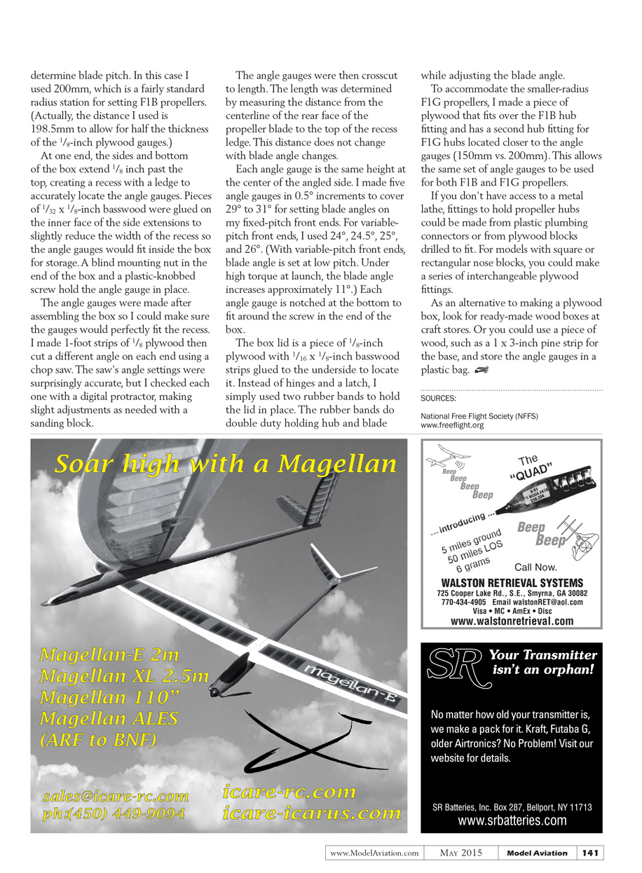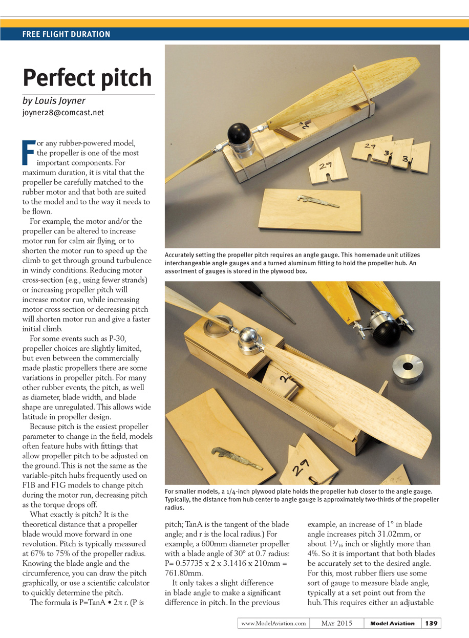 It only takes a slight difference in blade angle to make a significant difference in pitch. In the previous example, an increase of 1° in blade angle increases pitch 31.02mm, or about 13/16 inch or slightly more than 4%. So it is important that both blades be accurately set to the desired angle. For this, most rubber fliers use some sort of gauge to measure blade angle, typically at a set point out from the hub. This requires either an adjustable angle finder or a set of angled gauges.