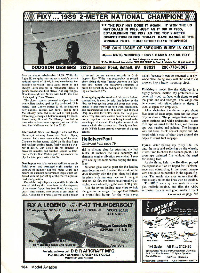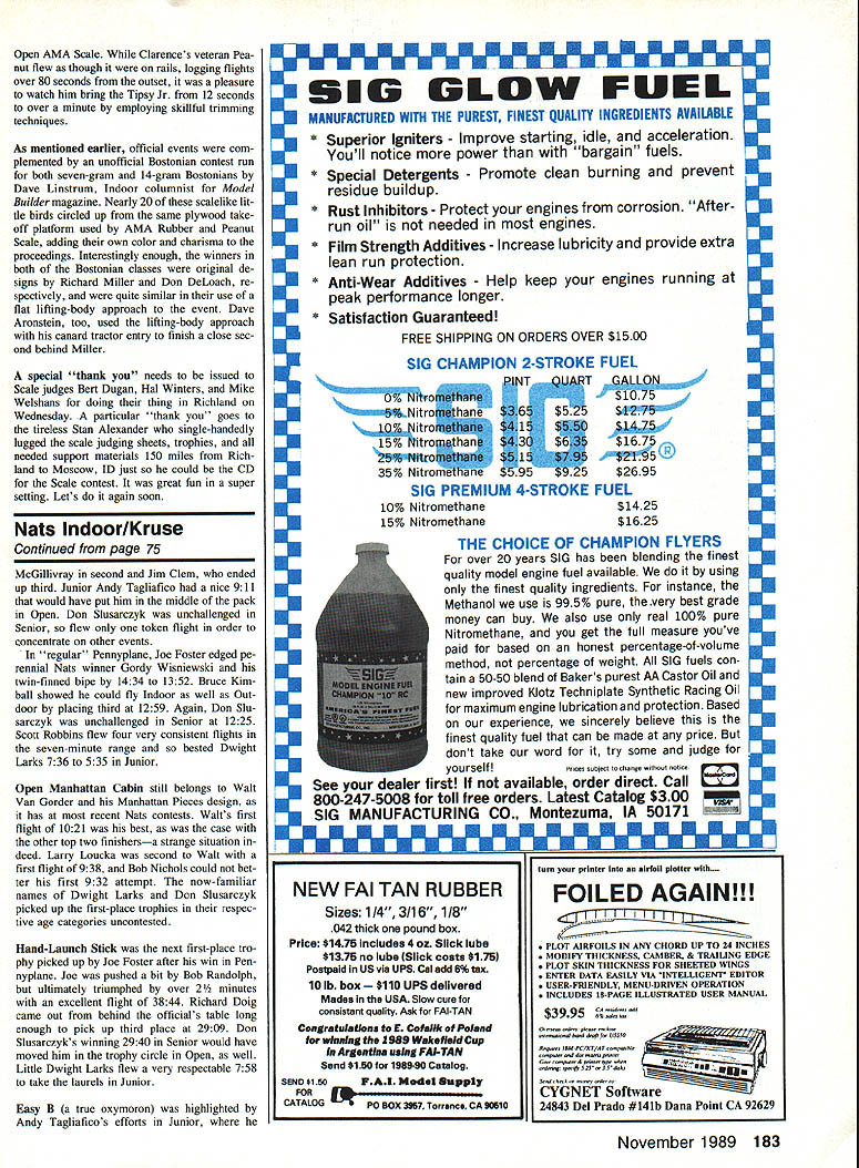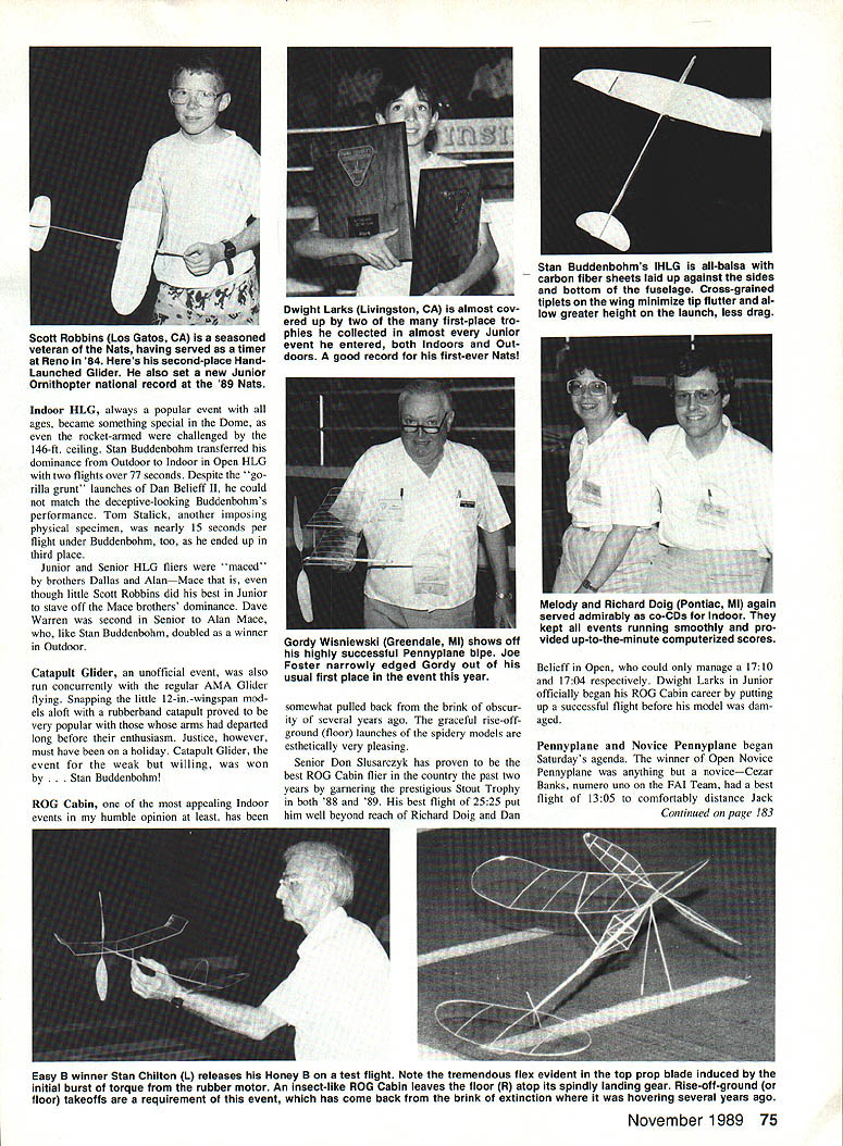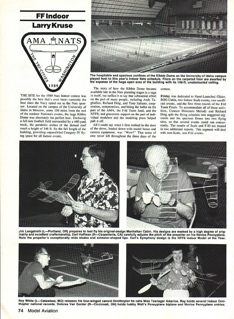 FF Indoor Larry Kruse THE SITE 1989 Nats Indoor contest possibly best thats ever beencertainly best since Navy opted out Nats spon sor Located campus University Idaho Moscow some 150 miles rest outdoor Nationals events huge Kibbie Dome absolutely perfect host Enclosing full-size football field surrounded 440-yard track parabolic arches domed roof reach height 146 ft full length building providing unparalleled Category IV fly ing space Indoor events story Kibbie Dome became available late Nats planning stages saga itself suffice say substantial effort part people including Andy Ta gliafico Richard Doig Tony Italiano coop eration compromises biting bullet part AMA FAI Team fund NFFS grassroots support part indi vidual modelers modeling press helped pull off could say first walked door dome loaded down model boxes camera equipment Wow sense awe never left throughout three days Friday dedicated Hand-Launched Glider ROG Cabin two Indoor Scale events two unoffi cial events first three rounds FAI Team Finals accommodate activ ities Contest Directors Melody Richard Doig split flying schedule staggered seg ments spacious Dome two flying sites several events could run concur rently results Scale FlD treated two additional reports segment will deal non-Scale non-FAI events 74 Model Aviation hospitable spacious confines Kibbie Dome University Idaho campus played host years Indoor Nats schedule Fliers carpeted floor dwarfed expanse huge open area building its 146-ft unobstructed ceiling contest Jim Longstreth 1Portland OR prepares test fly original-design Manhattan Cabin designs marked high degree orig inality excellent craftsmanship Earl Hoffman RCarpenteria CA carefully adjusts pitch propeller Novice Pennyplane Note propellers exceptionally wide blades scimatar-shaped tips Carls Symphony design NFFS Indoor Model Year Roy White LCatawissa MO releases four-winged canard Ornithopter calls Miss Teenager America Roy holds several Indoor Orni thopter national records Dolores Van Gorder RCincinnati OH holds hubby Walts Pennyplane biplane Novice Pennyplane entries Indoor HLG always popular event ages became something special Dome rocket-armed challenged 146-ft ceiling Stan Buddenbohm transferred dominance Outdoor Indoor Open HLG two flights over 77 seconds Despite go rilla grunt launches Dan Belieff II could match deceptive-looking Buddenbohms performance Tom Stalick another imposing physical specimen nearly 15 seconds per flight under Buddenbohm too ended up third place Junior Senior HLG fliers maced brothers Dallas AlanMace though little Scott Robbins did best Junior stave off Mace brothers dominance Dave Warren second Senior Alan Mace like Stan Buddenbohm doubled winner Outdoor Catapult Glider unofficial event also run concurrently regular AMA Glider flying Snapping little 12-in-wingspan mod els aloft rubberband catapult proved very popular arms departed long before enthusiasm Justice however must have holiday Catapult Glider event weak willing won an Buddenbohm ROG Cabin appealing Indoor events humble opinion least has somewhat pulled back brink obscur ity several years ago graceful rise-offground floor launches spidery models esthetically very pleasing Senior Don Slusarczyk has proven best ROG Cabin flier country past two years garnering prestigious Stout Trophy both 88 89 best flight 2525 put him well beyond reach Richard Doig Dan Stan Buddenbohms IHLG all-balsa carbon fiber sheets laid up against sides bottom fuselage Cross-grained tiplets wing minimize tip flutter al low greater height launch less drag Melody Richard Doig Pontiac Ml again served admirably co-CDs Indoor kept events running smoothly pro vided up-to-the-minute computerized scores Belieff Open could manage 1710 1704 respectively Dwight Larks Junior officially began ROG Cabin career putting up successful flight before model dam aged Pennyplane Novice Pennyplane began Saturdays agenda winner Open Novice Pennyplane anything noviceCezar Banks numero uno FAI Team best flight 1305 comfortably distance Jack Continued page 183 November 1989 75 Scott Robbins Los Gatos CA seasoned veteran Nats having served timer Reno 84 Heres second-place HandLaunched Glider also set new Junior Ornithopter national record 89 Nats Dwight Larks Livingston CA almost cov ered up two first-place tro phies collected almost Junior event entered both Indoors Out doors good record first-ever Natsl Gordy Wisniewski Greendale Ml shows off highly successful Pennyplane bipe Joe Foster narrowly edged Gordy out usual first place event year Easy B winner Stan Chilton L releases Honey B test flight Note tremendous flex evident top prop blade induced initial burst torque rubber motor An insect-like ROG Cabin leaves floor R atop its spindly landing gear Rise-off-ground floor takeoffs requirement event has come back brink extinction hovering several years ago Open AMA Scale Clarences veteran Pea nut flew though rails logging flights over 80 seconds Outset pleasure watch him bring Tipsy Jr 12 seconds over minute employing skillful trimming techniques As mentioned earlier official events com plemented unofficial Bostonian contest run both seven-gram 14-gram Bostonians Dave Linstrum Indoor columnist Model Builder magazine Nearly 20 scalelike littie birds circled up same plywood take off platform used AMA Rubber Peanut Scale adding own color charisma proceedings Interestingly enough winners both Bostonian classes original de signs Richard Miller Don DeLoach re spectively quite similar use flat lifting-body approach event Dave Aronstein too used lifting-body approach canard tractor entry finish close sec ond behind Miller special thank needs issued Scale judges Bert Dugan Hal Winters Mike Welshans doing thing Richland Wednesday particular thank goes tireless Stan Alexander single-handedly lugged scale judging sheets trophies needed support materials 150 miles Richland Moscow ID just could CD Scale Contest great fun super setting Lets again soon Nats Indoor/Kruse Continued page 75 McGil