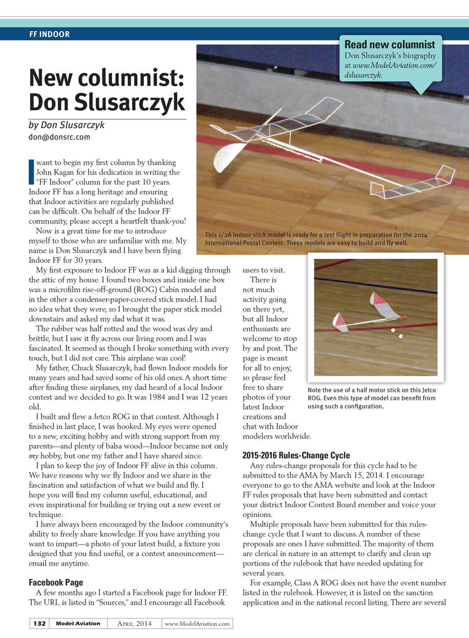 Now is a great time for me to introduce myself to those who are unfamiliar with me. My name is Don Slusarczyk and I have been flying Indoor FF for 30 years.