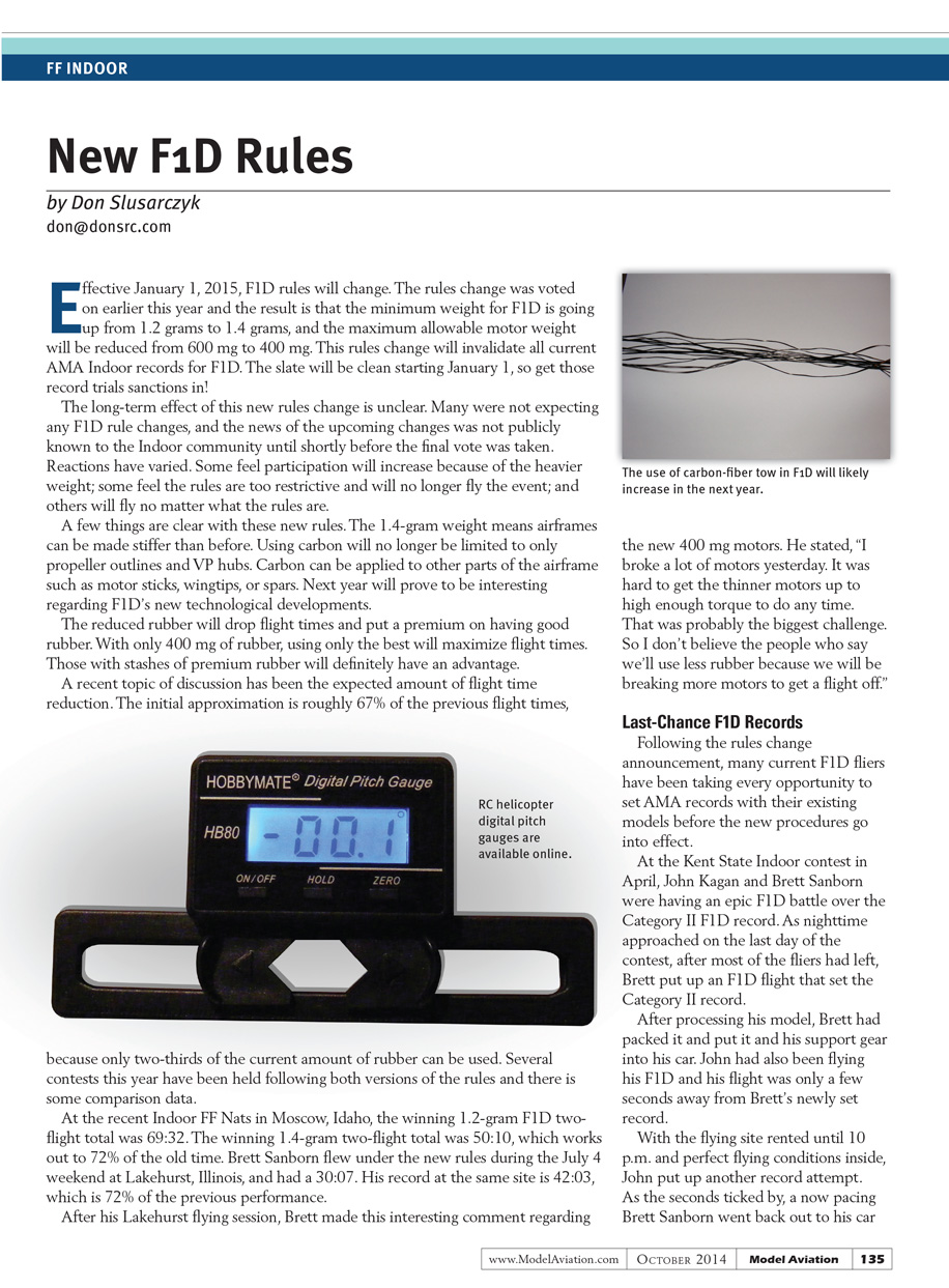 Effective January 1, 2015, F1D rules will change. The rules change was voted on earlier this year and the result is that the minimum weight for F1D is going up from 1.2 grams to 1.4 grams and the maximum allowable motor weight is being reduced from 600 mg to 400 mg. This rules change will invalidate all current AMA Indoor records for F1D. The slate will be clean starting January 1, so get those record trials sanctions in!