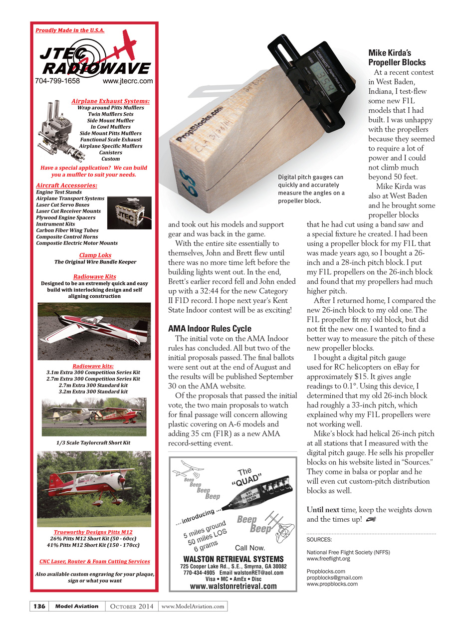 I bought a digital pitch gauge used for RC helicopters on eBay for approximately $15. It gives angle readings to 0.1°. Using this device, I determined that my old 26-inch block had roughly a 33-inch pitch, which explained why my F1L propellers were not working well.