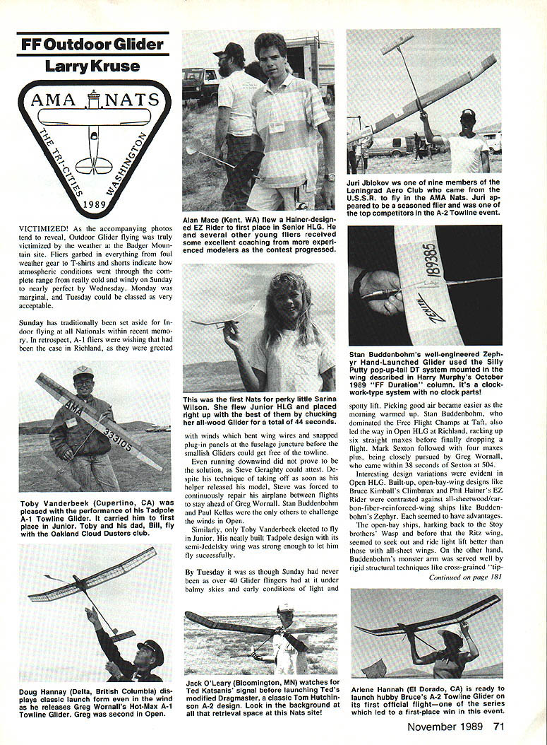 FF Outdoor Glider Larry Kruse VICTIMIZED As accompanying photos tend reveal Outdoor Glider flying truly victimized weather Badger Moun tain site Fliers garbed everything foul weather gear T-shirts shorts indicate atmospheric conditions went through com plete range really cold windy Sunday nearly perfect Wednesday Monday marginal Tuesday could classed very acceptable Sunday has traditionally set aside door flying Nationals within recent memo ry retrospect A-I fliers wishing case Richland greeted winds bent wing wires snapped plug-in panels fuselage juncture before smallish Gliders could get free towline running downwind did prove solution Steve Geraghty could attest De spite technique taking off soon helper released model Steve forced continuously repair airplane between flights stay ahead Greg Wornall Stan Buddenbohm Paul Kellas others challenge winds Open Similarly Toby Vanderbeek elected fly Junior neatly built Tadpole design its semi-Jedelsky wing strong enough let him fly successfully Tuesday though Sunday never over 40 Glider fingers under balmy skies early conditions light Stan Buddenbohms well-engineered Zeph yr Hand-Launched Glider used Silly Putty pop-up-tail DT system mounted wing described Harry Murphys October 1989 FF Duration column Its clock work-type system no clock parts spotty lift Picking good air became easier morning warmed up Stan Buddenbohm dominated Free Flight Champs Taft also led way Open HLG Richland racking up six straight maxes before finally dropping flight Mark Sexton followed four maxes plus being closely pursued Greg Wornall came within 38 seconds Sexton 504 Interesting design variations evident Open HLG Built-up open-bay-wing designs like Bruce Kimballs Climbmax Phil Hainers EZ Rider contrasted against all-sheetwood/car bon-fiber-reinforced-wing ships like Budden bohms Zephyr seemed have advantages open-bay ships harking back Stay brothers Wasp before Ritz wing seemed seek out ride light lift better all-sheet wings other hand Buddenbohms monster arm served well rigid structural techniques like cross-grained tip Continued page 181 Jack Oleary Bloomington MN watches Ted Katsanis signal before launching Teds Arlene Hannah El Dorado CA ready modified Dragmaster classic Tom Hutchin- launch hubby Bruces A-2 Towline Glider son A-2 design Look t background its first official flightone series retrieval space Nats site led first-place win event November 1989 71 Alan Mace Kent WA flew Hainer-design ed EZ Rider first place Senior HLG several other young fliers received some excellent coaching experi enced modelers contest progressed Jun Jblokov ws nine members Leningrad Aero Club came USSR fly AMA Nats Jun ap peared seasoned flier top competitors A-2 Towline event first Nats perky little Sarina Wilson flew Junior HLG placed right up best chucking all-wood Glider total 44 seconds Toby Vanderbeek Cupertino CA pleased performance Tadpole A-i Towline Glider carried him first place Junior Toby dad Bill fly Oakland Cloud Dusters club Doug Hannay Delta British Columbia dis plays classic launch form wind releases Greg Wornalls Hot-Max A-i Towline Glider Greg second Open self-preservation did everyone else except officials Sandy Charlene Frank stayed bitter end Nats FF GIider/Kruse Continued page 71 lets alleviate tip flutter provide washout carbon-wrapped fuselage eliminate fuse lage flex launch speeds Unlike other FF events good representation both Junior Senior fliers HLG Particularly impressive amount mentoring going experienced model ers helping young people launch techniques fine-trimming models gener ally providing much-needed encouragement positive reinforcement youngsters Junior high time posted Brett Whiting 110 followed Clint Hanneson second Dallas Mace third Alan Mace posted quality 276 win Senior outdistancing Lance Bays Jason Youck Re gardless well guys flew eas ily out-prettied little Sarina Wilson flying first contest story A-2 course arrival Russian contingent consisting A-2 flier Jun Jblokov coach Viktor Dudenko curious about Russians equipment model design flying skills Due lan guage barrier no interpreter present real formation came observation con versation As photos show Jblokovs ship much-flown much-repaired model standard FAI configuration featuring circletow hook carbon-fiber-reinforced wing spars able witness flight Russian Jun seemed very comfortable ship tow waited until several Ameri cans launched before trotting off down field make sure ship centered lift zoomed off line Ultimately ended up fifth place behind Steve Geraghty Kevin Col lins James Thornberg Bruce Hannah Hannahs fine score 1500 registered appropriately decorated red white blue ship demonstrated certain patriotic overtones well great flying skill Nats FF Scale/Kruse Continued page 72 James Woods nice CP-65 Porterfield Col legiate done up red white trim rem iniscent Earl Stahl design its proportions flight potential Peanut Scale its usual quota Fikes La ceys also Dick Petersons neat little LETX2-377 appeared have agricul tural heritage Ken Groves entered immacu lately crafted Bristol Scout biplane also went biplane route Don Srull-designed Voisin canard floatplane good enough representation aircraft type quality name modelers en sure good Scale contest As noted first paragraph anticipation high see some ships take air destined happen though Scale director John Guenther FF CD Stan Alexander made concerted suc cessful effort find suitable ROG surface least marginally acceptable retrieval site capricious weather victimized FF throughout week chose Thursday settle JR Galaxy B PCM Computer has user friendly central processing unit state-of-the-art Features include ABC&W 10KHZ narrow band dual conversion receiver 4 JR 4001 servos rechargeable Tx & airborne NiCds NiCd charger complete servo accessoes & hardware LCD display servo reverse & subtrims channels dual rates & exponential aileron elevator rudder interference/battery fail safe ATV stop watch count down timer accumulated use timer memo