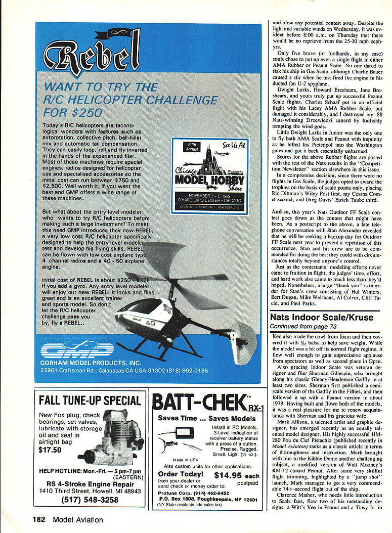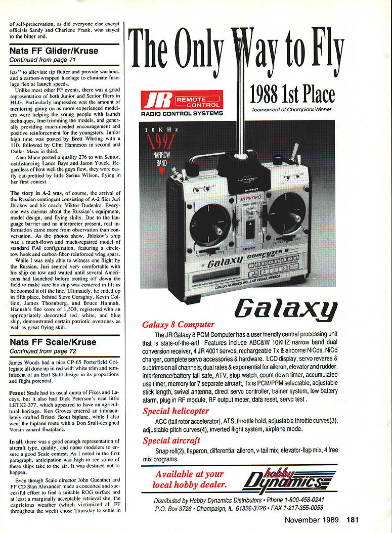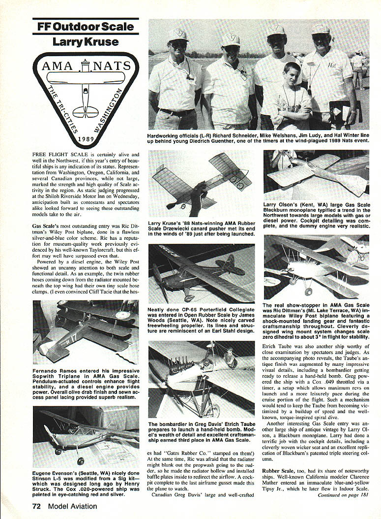 FF Outdoor Scale Larry Kruse FREE FLIGHT SCALE certainly alive well Northwest years entry beau tiful ships indication its status Represen tation Washington Oregon California several Canadian provinces large marked strength high quality Scale ac tivity region As static judging progressed Shiloh Riverside Motor Inn Wednesday anticipation built contestants spectators alike looked forward seeing outstanding models take air Gas Scales outstanding entry Ric Dit tmans Wiley Post biplane done flawless silver-and-blue color scheme Ric has reputa tion museum-quality work previously evi denced well-known Taylorcraft ef fort may well have surpassed Powered diesel engine Wiley Post showed uncanny attention both scale functional detail As example twin rubber hoses coming down radiator mounted neath top wing own tiny scale hose clamps convinced Cliff Tacie hos Fernando Ramos entered impressive Sopwith Triplane AMA Gas Scale Pendulum-actuated controls enhance flight stability diesel engine provides power Overall olive drab finish sewn ac cess panel lacing provided superb realism Eugene Evensons Seattle WA nicely done Stinson L-5 modified Sig kit designed long ago Henry Struck Cox 020-powered ship painted eye-catching red silver Larry Kruses 88 Nats-winning AMA Rubber Scale Drzewlecki canard pusher met its end winds 89 just after being launched Neatly done CP-65 Porterfield Collegiate entered Open Rubber Scale James Woods Seattle WA Note nicely carved freewheeling propeller Its lines struc ture reminiscent Earl Stahl design bombardier Greg Davis Etrich Taube prepares launch hand-held bomb Mod els wealth detail excellent craftsman ship earned third place AMA Gas Scale es Gates Rubber Co stamped same time Ric afraid radiator might blank Out propwash going rud der made radiator hollow installed baffle plates inside redirect airflow cock pit complete last airframe gusset made plane watch Canadian Greg Davis large well-crafted Larry Olsons Kent WA large Gas Scale Blackburn monoplane typified trend Northwest towards large models gas diesel power Cockpit detailing com plete dummy engine very realistic Etrich Taube also another ship worthy close examination spectators judges As accompanying photo reveals Taubes tique finish augmented impressive visual details including bombardier getting ready release hand-held bomb Greg pow ered ship Cox 049 throttled via timer setup allows maximum revs launch leisurely pace during cruise portion flight Such mechanism would tend keep Taube becoming vic timized buildup speed wellknown torque-inspired spiral dive Another interesting Gas Scale entry other large ship antique vintage Larry Ol son Blackburn monoplane Larry done terrific job cockpit details including cleverly woven wicker seat excellent repli cation Blackburns patented triple steering col umn Rubber Scale too its share noteworthy ships Well-known California modeler Clarence Mather entered immaculate blue-and-yellow Tipsy Jr later flew Indoor Scale Continued page 181 72 Model Aviation Hardworking officials L-R Richard Schneider Mike Welshans Jim Ludy Hal Winter line up behind young Diedrich Guenther timers wind-plagued 1989 Nats event real show-stopper AMA Gas Scale Ric Dittmans Mt Lake Terrace WA im maculate Wiley Post biplane featuring shock-mounted landing gear fantastic craftsmanship throughout Cleverly de signed wing mount system changes scale zero dihedral about 30 flight stability self-preservation did everyone else except officials Sandy Charlene Frank stayed bitter end Nats FF GIider/Kruse Continued page 71 lets alleviate tip flutter provide washout carbon-wrapped fuselage eliminate fuse lage flex launch speeds Unlike other FF events good representation both Junior Senior fliers HLG Particularly impressive amount mentoring going experienced model ers helping young people launch techniques fine-trimming models gener ally providing much-needed encouragement positive reinforcement youngsters Junior high time posted Brett Whiting 110 followed Clint Hanneson second Dallas Mace third Alan Mace posted quality 276 win Senior outdistancing Lance Bays Jason Youck Re gardless well guys flew eas ily out-prettied little Sarina Wilson flying first contest story A-2 course arrival Russian contingent consisting A-2 flier Jun Jblokov coach Viktor Dudenko curious about Russians equipment model design flying skills Due lan guage barrier no interpreter present real formation came observation con versation As photos show Jblokovs ship much-flown much-repaired model standard FAI configuration featuring circletow hook carbon-fiber-reinforced wing spars able witness flight Russian Jun seemed very comfortable ship tow waited until several Ameri cans launched before trotting off down field make sure ship centered lift zoomed off line Ultimately ended up fifth place behind Steve Geraghty Kevin Col lins James Thornberg Bruce Hannah Hannahs fine score 1500 registered appropriately decorated red white blue ship demonstrated certain patriotic overtones well great flying skill Nats FF Scale/Kruse Continued page 72 James Woods nice CP-65 Porterfield Col legiate done up red white trim rem iniscent Earl Stahl design its proportions flight potential Peanut Scale its usual quota Fikes La ceys also Dick Petersons neat little LETX2-377 appeared have agricul tural heritage Ken Groves entered immacu lately crafted Bristol Scout biplane also went biplane route Don Srull-designed Voisin canard floatplane good enough representation aircraft type quality name modelers en sure good Scale contest As noted first paragraph anticipation high see some ships take air destined happen though Scale director John Guenther FF CD Stan Alexander made concerted suc cessful effort find suitable ROG surface least marginally acceptable retrieval site capricious weather victimized FF throughout week chose Thursday settle JR Galaxy B PCM Computer has user friendly central processing unit state-of-the-art Features include ABC&W 10KHZ narrow band dual conversion receiver 4 JR