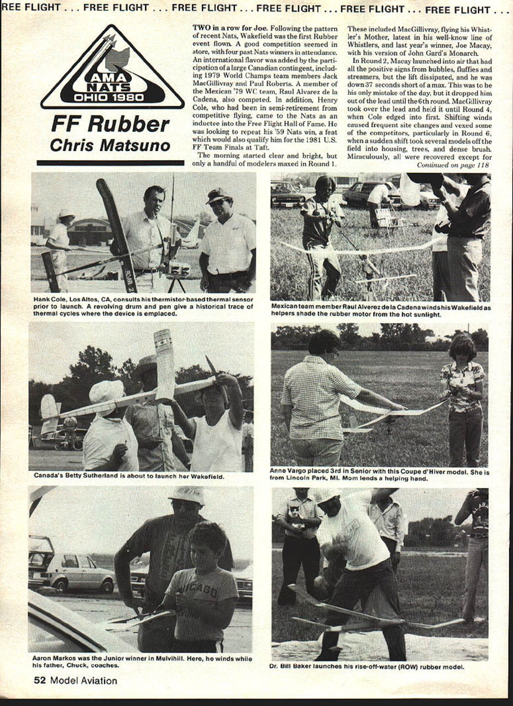REE FLIGHT. FREE FLIGHT . FREE FLIGHT. FREE FLIGHT . FREE FLIGHT . FREE FLIGHT. FF Rubber Chris Matsuno TWO row Joe Following pattern recent Nats Wakefield first Rubber event flown good competition seemed store four past Nats winners attendance An international flavor added parti cipation large Canadian contingent includ ing 1979 World Champs team members Jack MacGillivray Paul Roberts member Mexican 79 WC team Raul Alvarez de la Cadena also competed addition Henry Cole semi-retirement competitive flying came Nats inductee Free Flight Hall Fame looking repeat 59 Nats win feat would also qualify him 1981 Us FF Team Finals Taft morning started clear bright handful modelers maxed Round 1 included MacGillivray flying Whist lers Mother latest well-know line Whistlers last years winner Joe Macay version John Gards Monarch Round 2 Macay launched air positive signs bubbles fluffies streamers lift dissipated down 37 seconds short max mistake day dropped him out lead until 6th round MacGillivray took over lead held until Round 4 Cole edged first Shifting winds caused frequent site changes vexed some competitors particularly Round 6 sudden shift took several models off field housing trees dense brush Miraculously recovered except Continued page 118 52 Model Aviation Hank Cole Los Altos CA consults thermistor-based thermal sensor prior launch revolving drum pen give historical trace thermal cycles device emplaced Mexican team member Raul Alverez dela Cadena winds Wakefield helpers shade rubber motor hot sunlight about launch Wakefield .. C ~JuIJc U flIVUI rruuu us Lincoln Park Ml Mom lends helping hand Aaron Markos Junior winner Mulvihill winds father Chuck coaches Dr Bill Baker launches rise-off-water ROW rubber model SPORT SCALE away way home Nats would like express condolences Doug behalf Speed fliers Nats FF Power/Kruse Continued page 50 weather conditions later week rm sure looked back upon Wed nesday some degree longing since national records set three classes Junior Mike Wineland led parade recordsetters flying high-thrust design featuring Jedelaky wing Senior Barry Ziegenfuse man hour five straight maxes Open Dirty Harry Murphy CIA Central Indiana Aeromodelers cleaned up total 1525 Throughout day numerous wind shifts challenged contest ants finally shortly after mid-afternoon air deteriorated event over practical purposes Thursday dawned rather semi-dawned hazy partly overcast Although sun quickly burned through air never really set up good thermal activity scores tend reflect D Gas favorite practically spectators brings out heavy artillery Dave Wineland followed son Mikes lead previous day walked away marbles unusual aspects D year several beasties either SPORT TRAINER 13377 Beach Ave Venice CA p0291PIONEERS IN SILENT FLIGHT never trimmed badly out trim Whatever case least three biggies splattered themselves runway taken home large doggie bags FAL unlike 1979 well-represented both quality quantity ships As day progressed wind increased nearly everyone tried get flights early round possible addition being well-represented event well-contested too Chuck Markos broke long dry spell FM breaking winners circle flying contest-seasoned Par FM design Markos 1260 hotly pursued Norm Poti 1240 Best Finish award Poti would have won immaculate Niblet design weather steadily worsened Friday both wind some rain later day Whie field adequate previous days contest tightened up Gas site became significant factor determining outcome Norm Poti Dick Covalt Gil Morris locked maxmatching day About 330 wind picked up began rain however since late officials could move launch site contest ended Morris going over south perimeterfence 400 last winning maz Electric repeat last year Open Bill Jenkins taking first place national-record-holding Electric Country Boy q iUl9 ASTRI PLIGHT IAC younger set did up Brown speak wiht Karen winning Junior sister Susan wrapping up Senior Again Electric still emerging event Nationals level potential certainly become very popular Saturday final FF day saw good battles B Gas shape up between Bill Dunlop Gil Robbins Richard Bloomquist Open Bryan Fulmer David Willis Brad Fulmer Junior Dunlop finally topped Robbins just 7 sec after all-day struggle Bryan Fulmer dropped third max Junior David Willis launched some bad air also giving Bryan win Brother Brad Fuhner chased Willis hard could came up 6 sec short putting together 1-2 brother act interesting design notes coming out B Gas both Bill Dunlop first place winner Bill Jenkins fifth place winner flying 500-sq versions Jim Clems Witch Hawk apparently independently scaled up B-size H-in-in listening Jim Let conclude thanking Roger Wathen assited photographically covering Free Flight power Roger efforts appreciated contest officials support staff FF Power 1980 Nats showed decided resurgence numbers positive contestant attitude Most certainly can no outcry FF being treated stepchild year least far location concerned So missed contest missed good Nats FF Out Rub/Matsuno Continued page 52 happened Coles number model landed next busy highway whereupon stolen some unthinking slob compound Coles woes appeared DT timer ran short Just done 1979 Macay wrapped things up solid max Round 7 winning second Nats row Cole 2nd Reid Hull flying tailed model sub-rubber 3rd Coupe day much repeat last year 118 Model Aviation 1t1 POHTEHPIELD COLLEGIATE ideal model spon scale flyer Its gentle forgiving nature make perfect begin ners yet quite responsive skilled hands balsa construc tion light strong Porterfield can rog grass field climb steeply avoid obstacles Its light wing loading lets land dime give nine cents change Join quiet revolution enjoy Porterfield Collegiate neighborhood park school yard Wing span 695 Area 695 sq Weight 4 3 channel radio Astro 15 can also use Astro 25 15 25 glow engine 1018 ne 1 HO ~OH pert little sport train popular Astro 05 fight system can bIm ailt rudder elevator control pylon racing aerobatic flying inches weight 28 oz light OUR AI