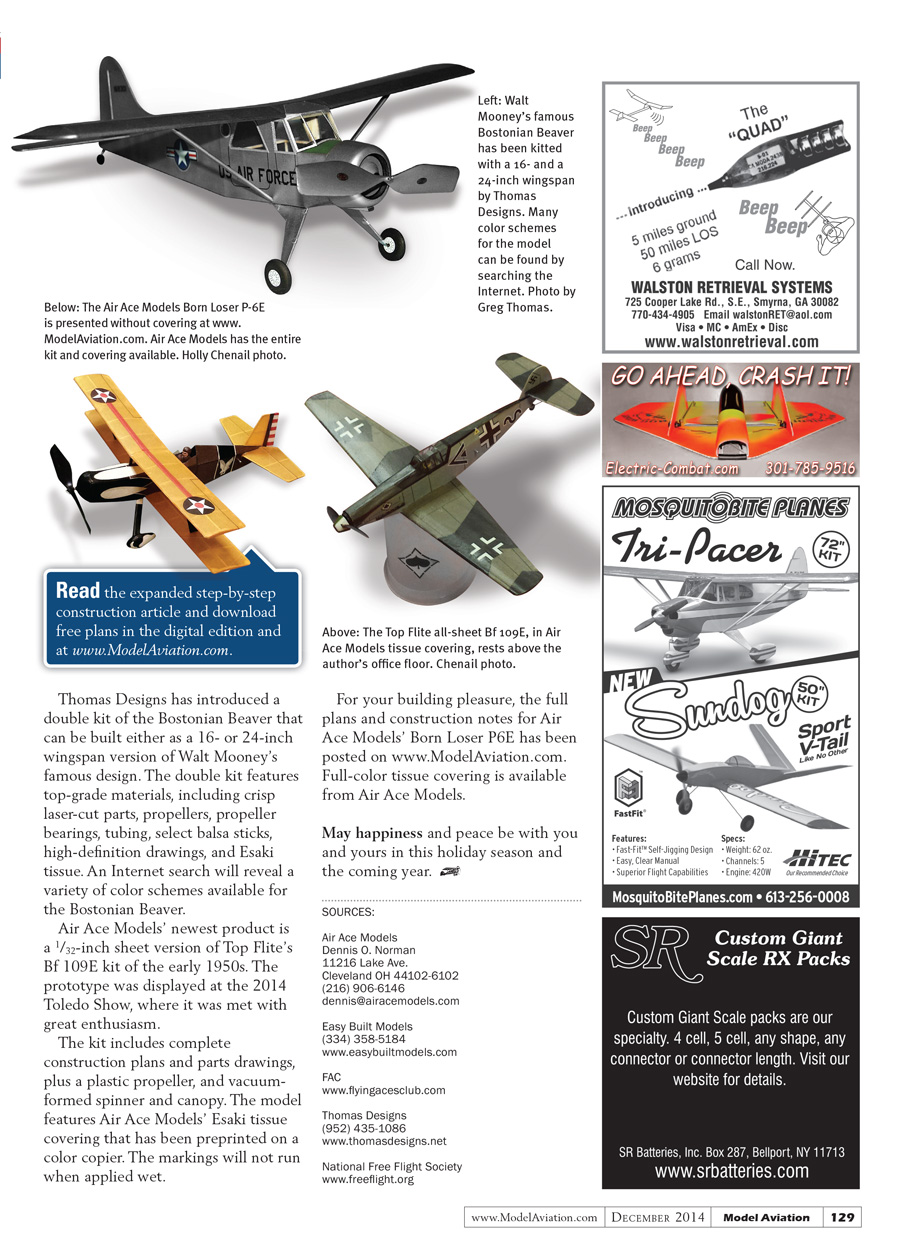 For your building pleasure, the full plans and construction notes for Air Ace Models’ Born Loser P6E has been placed on the Model Aviation website. Full-color tissue covering is available from Air Ace Models.