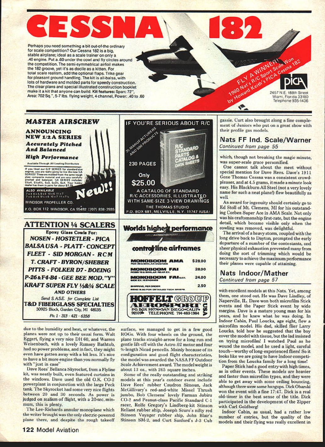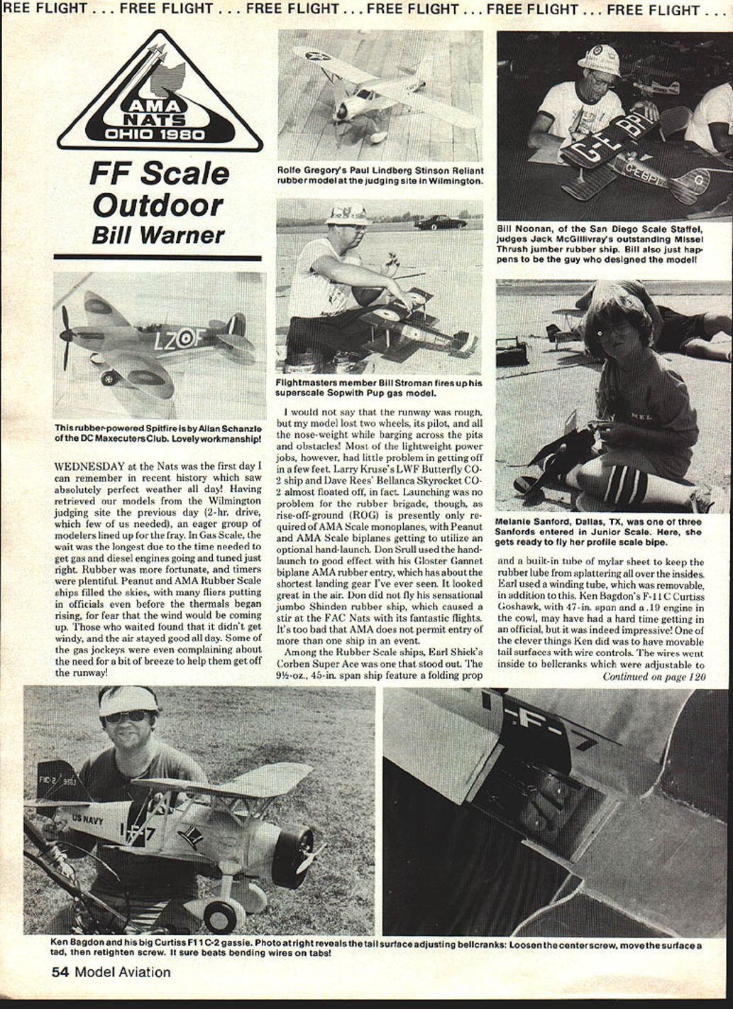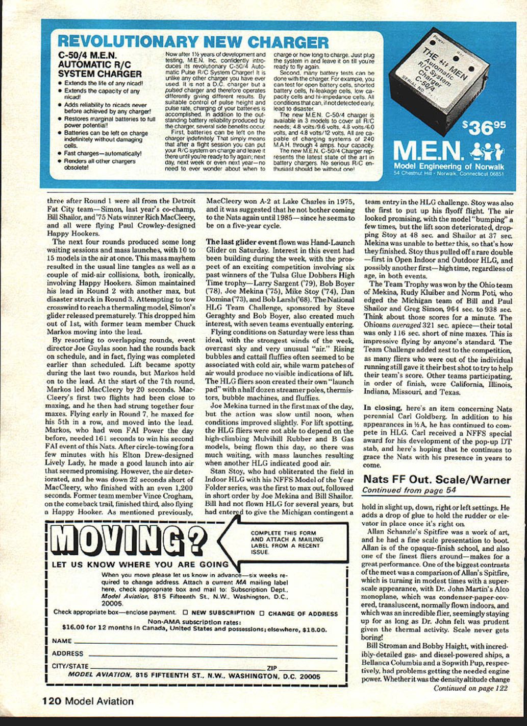 REE FLIGHT. FREE FLIGHT. FREE FLIGHT. FREE FLIGHT. FREE FLIGHT . FREE FLGHT. FF Scale Outdoor Bill Warner WEDNESDAY Nats first day can remember recent history saw absolutely perfect weather day Having retrieved models Wilmington judging site previous day 2-hr drive few us needed eager group modelers lined up fray Gas Scale wait longest due time needed get gas diesel engines going tuned just nght Rubber fortunate timers plentifuL Peanut AMA Rubber Scale ships filled skies fliers putting officials before thermals began rising fear wind would coming up waited found didnt get windy air stayed good day Some gas jockeys complaining about need bit breeze help get off runway 54 Model Aviation would say runway rough model lost two wheels its pilot nose-weight barging across pits obstacles Most lightweight power jobs however little problem getting off few feet Larry Kruses LWF Butterfly CO 2 ship Dave Rees Bellanca Skyrocket CO 2 almost floated off fact Launching no problem rubber brigade though rise-off-ground ROG presently re quired AMA Scale monoplanes Peanut AMA Scale biplanes getting utilize optional hand-launch Don Srull used handlaunch good effect Gloster Gannet biplane AMA rubber entry has about shortest landing gear rye ever seen looked great air Don did fly sensational jumbo Shinden rubber ship caused stir FAC Nats its fantastic flights Its too bad AMA does permit entry ship event Among Rubber Scale ships Earl Shicks Corben Super Ace stood out 9Y2-oz 45-in span ship feature folding prop built-in tube mylar sheet keep rubber lube splattering over insides Earl used winding tube removable addition Ken Bagdons F-i IC Curtiss Goshawk 47-in span 19 engine cowl may have hard time getting official indeed impressive clever things Ken did have movable tail surfaces wire controls wires went inside bellcranks adjustable Continued page 120 Rolfe Gregorys Paul Lindberg Stinson Reliant rubber model judging site Wilmington Bill Noonan San Diego Scale Staffel judges Jack McGillivrays outstanding Missel Thrush jumber rubber ship Bill also just hap pens guy designed model Thisrubbeipowered SpitfireisbyAllanSchanzle DC Maxecuters Club Lovelyworkmanship Flightmasters member Bill Stroman fires up nis superscale Sopwith Pup gas model Melanie Santord Dallas TA ol tflree Sanfords entered Junior Scale gets ready fly profile scale bipe Ken Bagdon big Curtiss Fl 1 C-2 gassie Photo right revealsthetail su oce adju..ibelkre.isuuserutneeniers~rew move inc surreiee tad retighten screw sure beats bending wires tabs three after Round 1 Detroit Fat City teamSimon last years co-champ Bill Shailor and75 Nats winner RichMacCleery flying Paul Crowley-designed Happy Hookers next four rounds produced some longThe last glider event flown Hand-Launch waiting sessions mass launches 10 toGlider Saturday Interest event 15 models air once mass mayhembeen building during week prosresulted usual line tangles well apect exciting competition involving six couple mid-air collisions both ironicallypast winners Tulsa Glue Dobbers High involving Happy Hookers Simon maintainedTime trophyLarry Sargent 79 Bob Boyer lead Round 2 another max but78 Joe Mekina 75 Mike Stoy 74 Dan disaster struck Round 3 Attempting towDomina 73 Bob Larsh 68 National crosswind reach thermaling model SimonsHLG Team Challenge sponsored Steve glider released prematurely dropped himGeraghty Bob Boyer also created much out 1st former team member Chuckinterest seven teams eventually entering Markos moving lead Flying conditions Saturday less resorting overlapping rounds eventideal strongest winds week director Joe Guylas soon rounds backovercast sky very unusual air Rising schedule fact flying completedbubbles cattail fluffies often seemed earlier scheduled Lift became spottyassociated cold air warm patches during last two rounds Markos heldair would produce no visible indications lift lead start 7th roundThe HLG fliers soon created own launch Markos led MacCleery 20 seconds Mac-pad half dozen streamer poles thermis Cleerys first two flights close totors bubble machines fluffies maxing strung together four Joe Mekina turned first max day maxes Flying early Round 7 maxed forbut action slow until noon 5th row moved leadconditions improved slightly lift spotting Markos won FAI Power daythe HLG fliers able depend before needed 161 seconds win secondhigh-climbing Mulvihill Rubber B Gas FM event Nats After circle-towing amodels being flown day few minutes Elton Drew-designedmuch waiting mass launches resulting Lively Lady made good launch airwhen another HLG indicated good air seemed promising However air deter- Stan Stoy obliterated field iorated down 22 seconds short ofIndoor HLG NFFS Model Year MacCleery finished 1200Folder series first max out followed seconds Former team member Vince Croghamin short order Joe Mekina Bill Shailor comeback trail finished third also flyingBill flown l{LG several years Happy Hooker As mentioned previouslyhad enterd give Michigan contingent DFhFh1COMPLETE THIS FORM IhlEhEflEIUIEIFAND ATTACH MAILINGI LABEL FROM RECENT IbJJ ISSUE LET US KNOW WHERE YOU ARE GOING\ move please let us know advancesix weeks re quired change address Attach current MA mailing label check appropriate box mail Subscription Dept. Model Aviation 815 Fifteenth St. NW. Washington DC. 20005 Check appropriate boxenclose payment 0 NEW SUBSCRIPTION 0 CHANGE OF ADDRESS Non-AMA subscriptIon rates $1600 12 months Canada United States possesslonselsewhere $1800 NAME ADDRESS CITY/STATE ____________________________________________ ZIP _______________ MODEL AVIATION 815 FIFTEENTH ST. NW. WASHINGTON DC 20005 team entry HLG challenge Stoy also first put up flyoff flight air looked promising model bumping few times lift soon deteriorated drop ping Stoy 48 sec Shaior 37 sec Mekina unable better thats finished Stoy thus pulled off rare double first Open Indoor Outdoor HLG possibly another firsthigh time regardless age both events Team Trophy won Ohio team Mekins Rudy Kluiber Norm Poti edged M