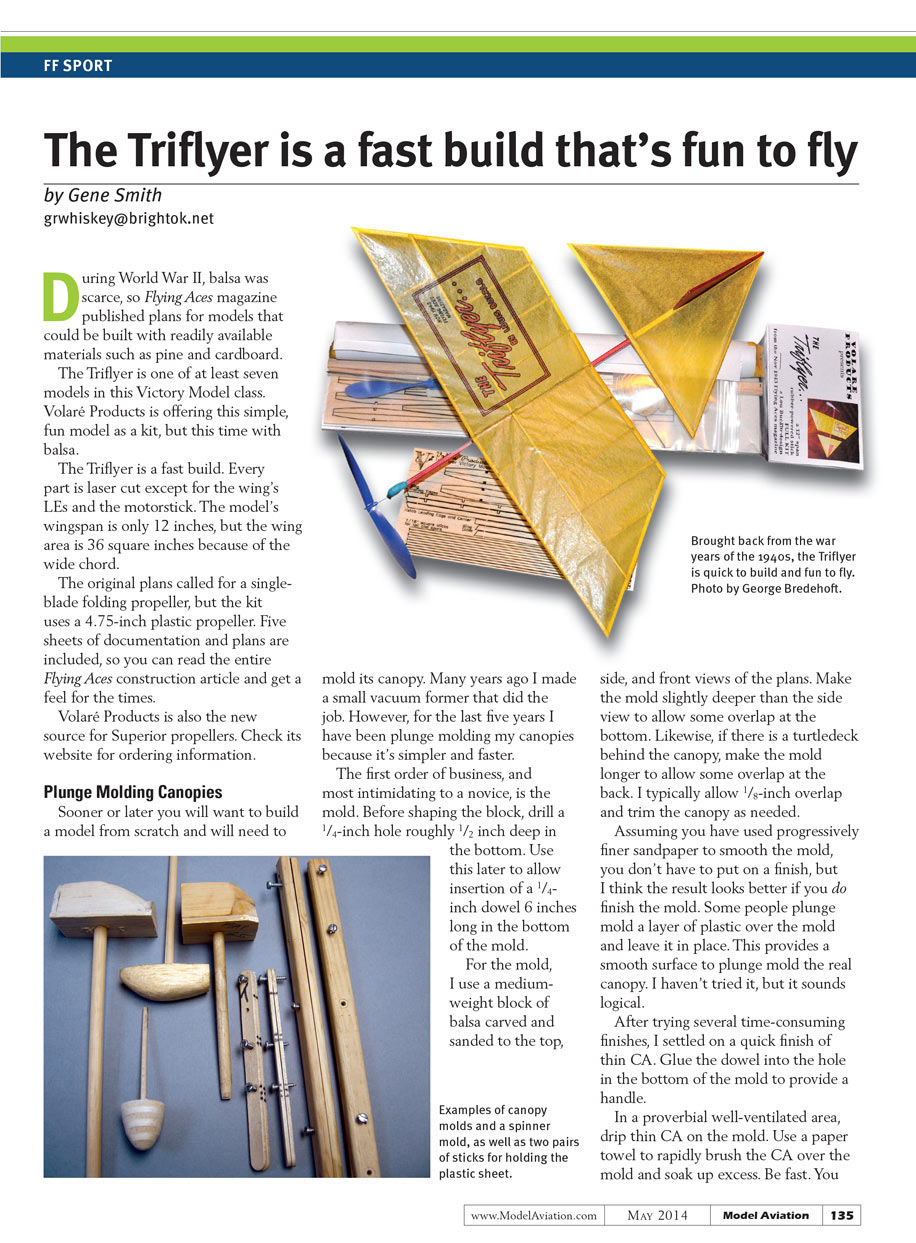 The Triflyer is one of at least seven models in this Victory Model class. Volaré Products is offering this simple, fun model as a kit, but this time with balsa.