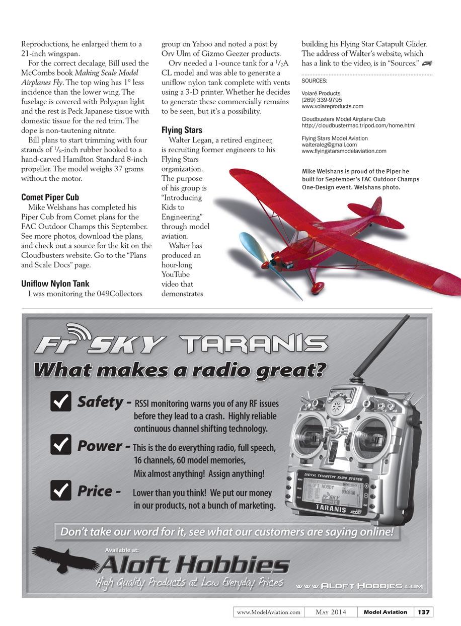 Mike Welshans has completed his Piper Cub from Comet plans for the FAC Outdoor Champs this September. See more photos, download the plans, and check out a source for the kit on the Cloudbusters website. Go to the “Plans and Scale Docs” page.