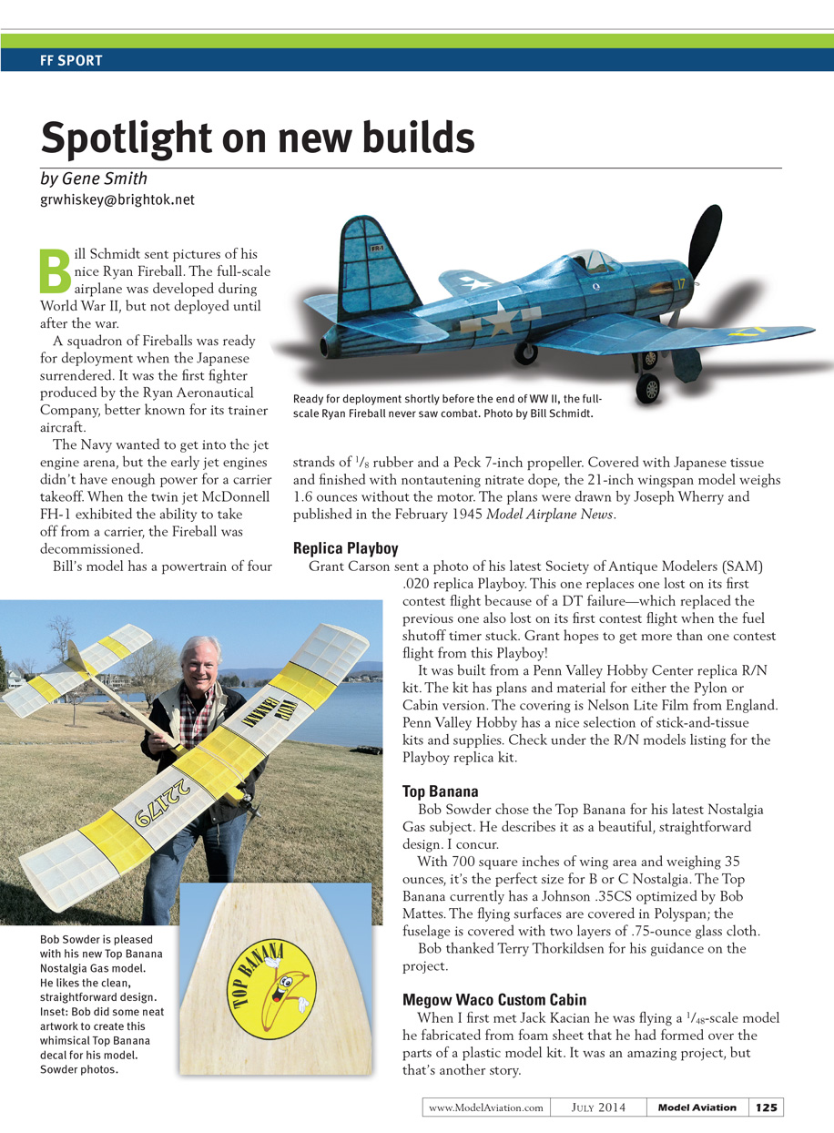 Grant Carson sent a photo of his latest Society of Antique Modelers (SAM) .020 replica Playboy. This one replaces one lost on its first contest flight because of a DT failure—which replaced the previous one also lost on its first contest flight when the fuel shutoff timer stuck. Grant hopes to get more than one contest flight from this Playboy!