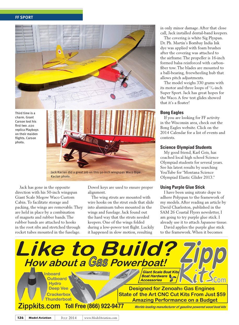 The model weighs 330 grams with its motor and three loops of 1/4-inch Super Sport. Jack has great hopes for the Waco. A few test glides showed that it’s a floater!
