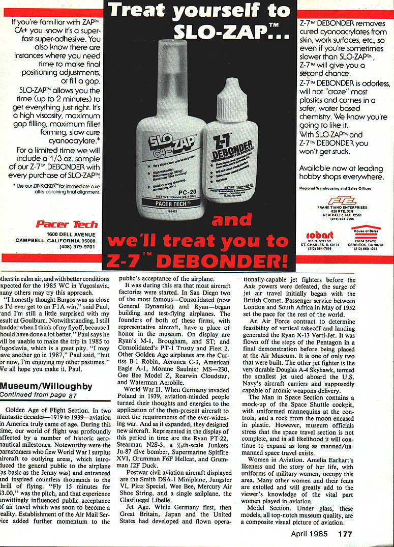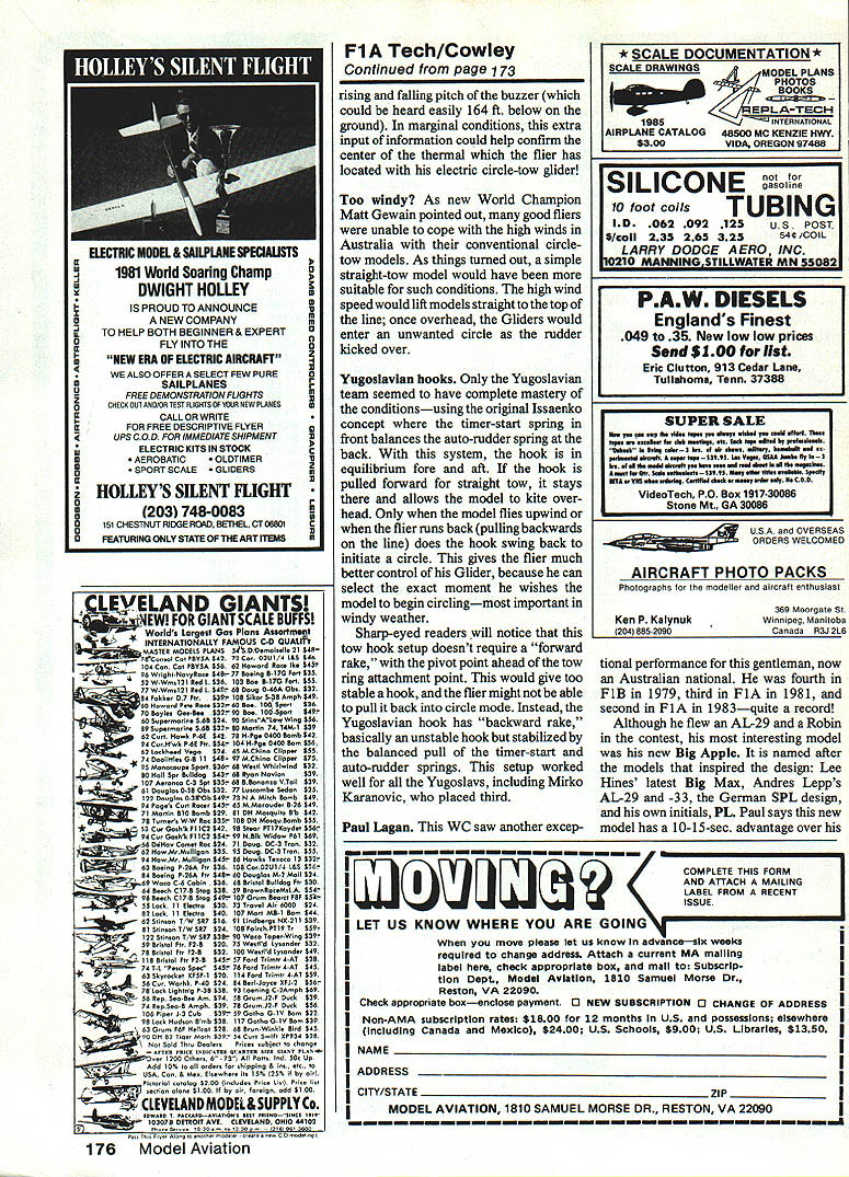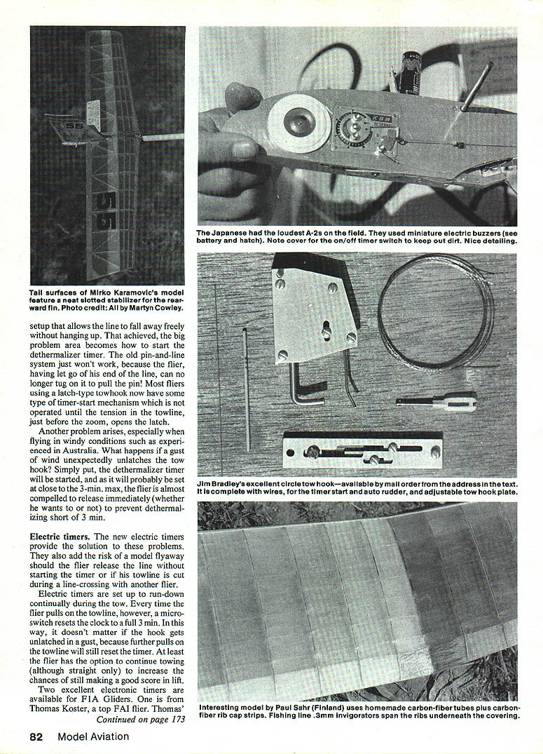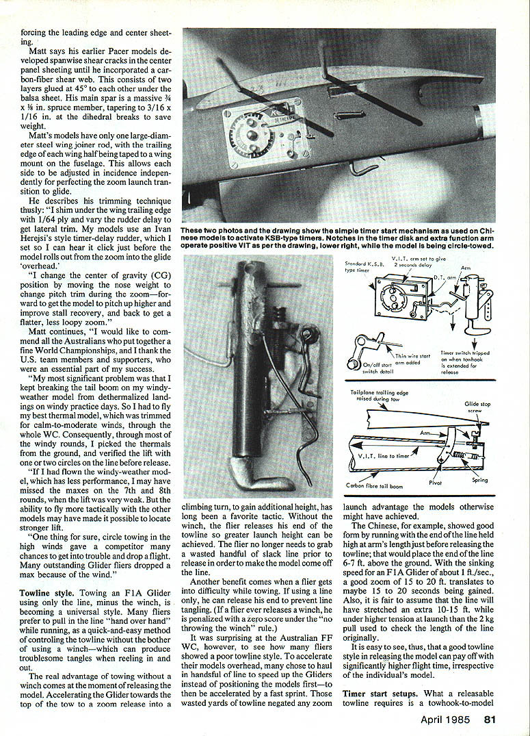 FiA Technicalities big report World Championships such author has done us before never seems give enough room tell about innovations techniques seen Thats again looking 1983 Free Flight World Championshipsthis month especially A-2 Glider event FlA EMartyn Cowley THE CURRENT FlA GLIDER World Champion Matt Gewain sec ond American win title since Nordic event became WC way back 1946 first late Gerry Ritz 1959 Matt has leading Free Flighter Florida now living three 1983 team members came same state Like other two Florida fliers Matts models feature much use carbon-fiber reinforcement material has become very desirable reinforcing wings make strong lightweight struc tures able withstand enormous loads imposed during zoom launches Pre-cured carbon-fiber easiest form modelers use now available mail order Matts team mate Jim Bradley 1337 Pine Sap Rd Orlando FL 32817 Twinn-K dis Note hook pivot behind Atomring giving backward er line spring roAookad1ust hook position Tow ring front model CG Mom towheePenont signols latch opens timer starts Notw pivoting towhook balanced redder spring timer start spring ok will now stay position / flier chooses during tow / Timer stert ossembly tormord spr ng 80 Model Aviation SECTION A-A 25 A105 tributor model shops sheets uni-directional pre-cured fibers 008 010 thick can easily stripped small widths suitable capping spars Thick cyanoacrylate glues work best slow-cure epoxy Matt used Dremel Moto Tool router attachment inset carbon-fiber strips wing trailing edge models well reinDownward pci1 hook releases timer start arm Ie 14-C-1412 it~J L timerGuid 7VLJ 0506 light allay Eaceplate Switch loses timer Ten p ng sa fu Arm moves start timer vane Tension spring balances rudder spring give hook equilibrium DETAIL mm w C odeed n2mmod tube World Champion Matt Gewainstow hook installation Note Horejal-style rudderdelay slider toward rear tow hook plate controls zoom launch Spring iong wire reicased timer Gewains winning Pacer will featured future issue MA Yugoslavian hook-operated Seelig timer stan used Mirko Karamovic shown photo two drawings upper drawing concentrates tow hook right features timer start mechanism Illustrations courtesy ofAcro Modeller forcing leading edge center sheet ing Matt says earlier Pacer models de veloped spanwise shear cracks center panel sheeting until incorporated car bon-fiber shear web consists two layers glued 450 other under balsa sheet main spar massive x ce member tapering 3/16 x 1/16 dihedral breaks save weight Matts models have large-diam eter steel wing joiner rod trailing edge wing half being taped wing mount fuselage allows side adjusted incidence indepen dently perfecting zoom launch tran sition glide describes trimming technique thusly shim under wing trailing edge 1/64 ply vary rudder delay get lateral trim models use Ivan Herejsis style timer-delay rudder set can hear click just before model rolls out zoom glide overhead change center gravity CG position moving nose weight change pitch trim during zoomfor ward get model pitch up higher improve stall recovery back get flatter less loopy zoom Matt continues would like com mend Australians put together fine World Championships thank US team members supporters essential part success significant problem kept breaking tail boom windyweather model dethermalized land ings windy practice days So fly best thermal model trimmed calm-to-moderate winds through whole WC Consequently through windy rounds picked thermals ground verified lift two circles line before release flown windy-weather mod el has less performance may have missed maxes 7th 8th rounds liftwas very weak ability fly tactically other models may have made possible locate stronger lift thing sure circle towing high winds gave competitor chances get trouble drop flight outstanding Glider fliers dropped max because wind Towline style Towing F lA Glider using line minus winch becoming universal style fliers prefer pull line hand over hand running quick-and-easy method controling towline bother using winchwhich can produce troublesome tangles reeling out real advantage towing winch comes moment releasing model Accelerating Glider towards top tow zoom release climbing turn gain additional height has long favorite tactic Without winch flier releases end towline greater launch height can achieved flier no longer needs grab wasted handful slack line prior release order make model come off line Another benefit comes flier gets difficulty towing using line can release end prevent line tangling flier ever releases winch penalized zero score under no throwing winch rule surprising Australian FF WC however see fliers showed poor towline style accelerate models overhead chose haul handsful line speed up Gliders instead positioning models firstto accelerated fast sprint wasted yards towline negated zoom VIT nrnet give Stondord KSB2 recoed deloyAm type 4 Tinrer mith tripped towbook extended remote C \ Thin wire Start Oe/off stort ore odded switch detoil Toilpione troiling edge roised daring tow Corbon fibre tail boom Pivot Spring launch advantage models otherwise might have achieved Chinese example showed good form running end line held high arms length justbefore releasing towline would place end line 6-7 ft above ground sinking speed F 1 Glider about 1 ft/sec good zoom 15 20 ft translates maybe 15 20 seconds being gained Also fair assume line will have stretched extra 10-15 ft under higher tension launch 2kg pull used check length line originally easy see thus good towline style releasing model can pay off significantly higher flight time irrespective individuals model Timer start setups What releasable towline requires towhook-to-model April 1985 81 two photos drawing show simple timer start mechanism used Chi nese modeis activate KSB-type timers Notches timer disk extra function arm operate positive VIT per drawing lower right model being circie-towed setup allows line fall away freely hanging up achieved big problem area becomes start d