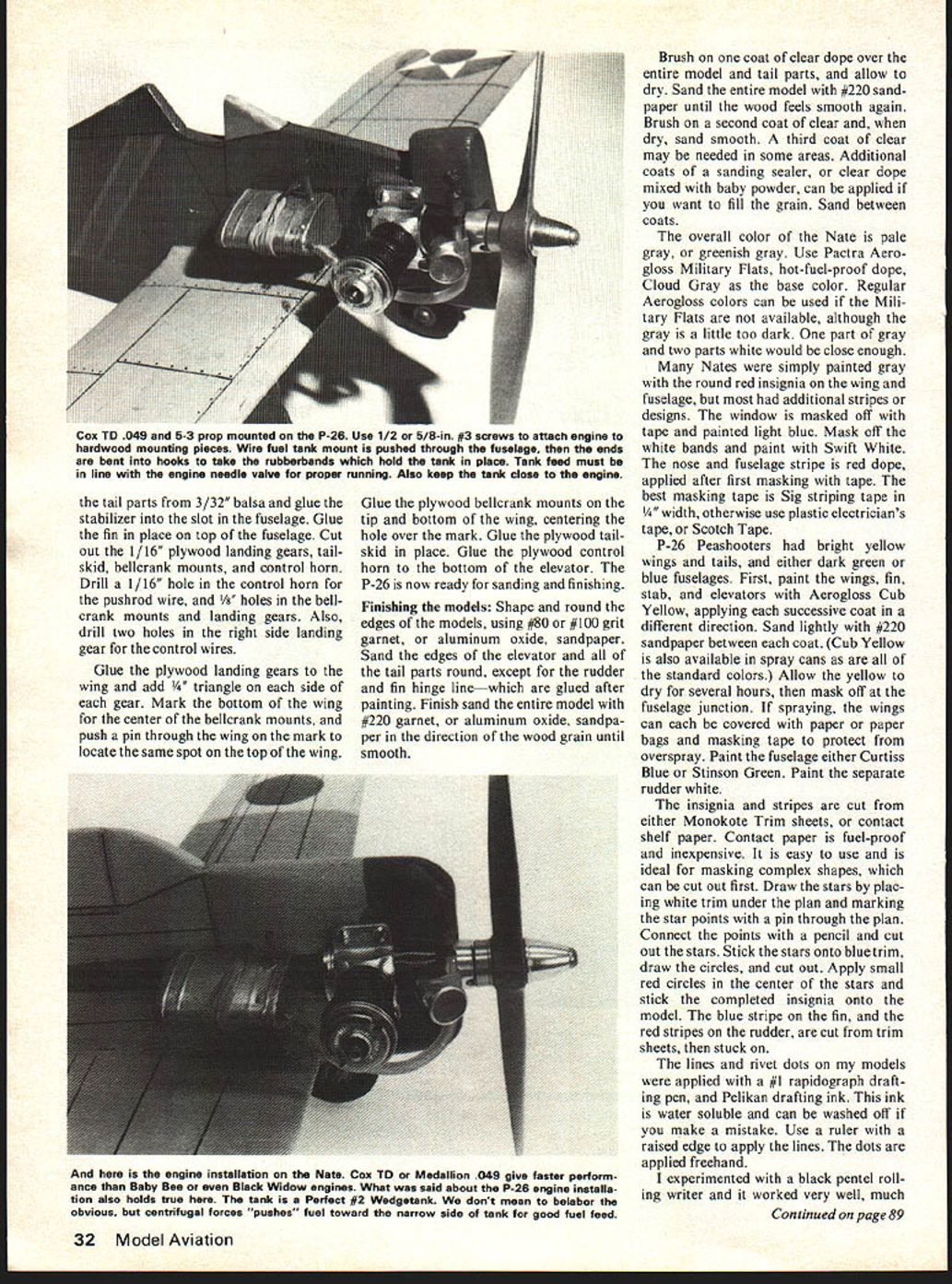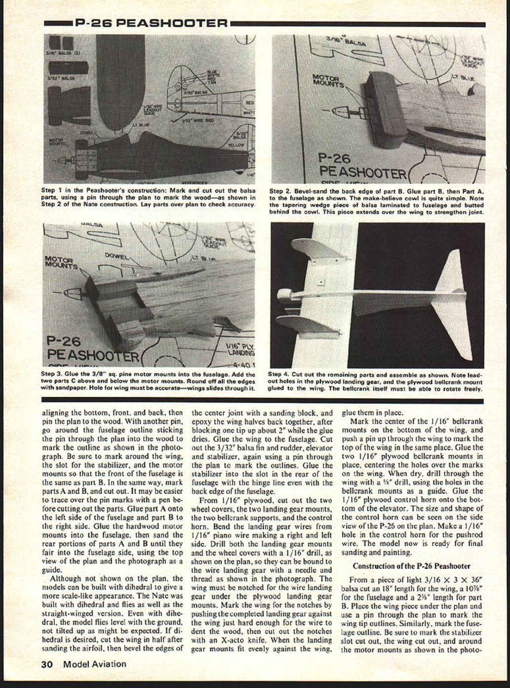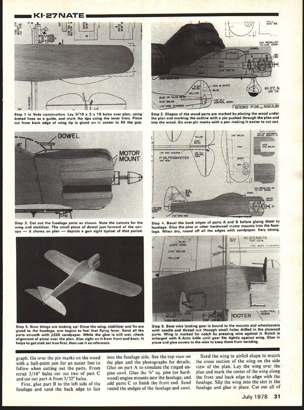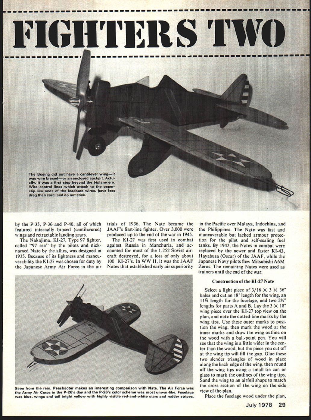 Contemporary pre war days Japanese Nate American P-26 peashooter make colorful subjects Half-A power Anyone mock combatE Fred Reese THE BOEING P-26 Peashooter Japanese Nakajima KI-27 Nate fighters early stages World War II designed produced 1930s camouflaged paint schemes favor Peashooter Nates painted bright distinc tive markings colors making very attractive models Models aircraft seldom seen because very short noses profiles both balance just right times have looked aircraft build models took some neighbor hood kids flying profiles prompt build could play too TD 049s both fly very fast 26 wire control lines lot fun fly P-26 designed Boeing 1931 first all-metal low-winged fighter accepted US Army Air Corps wing wire braced like older biplanes order make lighter airplane much faster biplanes replaced P-26 very maneuverable mid 1930s standard pursuit plane US bases Hawaii Panama Canal Zone Eleven P-26s sold China used against raiding Japa nese fighters 1937 Fourteen P-26s ground Pearl Harbor destroyed stood neatly lined up runway Japanese struck December 7 1941 group P-26 pursuits sold Philippines used against Japanese tackers early Pacific War 1940 P-26 obsolete replaced 28 Model Aviation maIl models easy decorate insignias Cut Monokote trim sheets colored contact paper ink lines can applied Pentel Rolling Writer drafting pen covered clear dope seal protect decorations Nate foreshadowed famous Zero fighter P-35 P-36 P-40 featured internally braced cantilevered wings retractable landing gears Nakajima KI-27 Type 97 fighter called 97 sen pilots nick named Nate allies designed 1935 Because its lightness maneu verability K 1-27 chosen duty Japanese Army Air Force air trials 1936 Nate became JAAFs first-line fighter Over 3000 produced up end war 1945 KI-27 first used combat against Russia Manchuria ac counted 1252 Soviet air craft destroyed loss about 100 KI-27s WW II JAAF Nates established early air superiority Pacific over Malaya Indochina Philippines Nate fast maneuverable lacked armour protec tion pilot self-sealing fuel tanks 1942 Nates combat replaced newer faster KI-43 Hayabusa Oscar JAAF Japanese Navy pilots flew Mitsubishi A6M Zeros remaining Nates used trainers until end war Construction KI-27 Nate Select light piece 3/16 X 3 X 36 balsa cut 18 length wing II th fuselage two 2 lengths parts B Lay 3 X 18 wing piece over KI-27 top view plan note dotted-line marks wing tips Use outer marks posi tion wing mark wood inner marks draw wing outline wood ball-point pen will see wing little wider cen ter wood piece cut off wing tip will fill gap Glue two slender triangles wood place along back edge wing round off wing tips using small tin can glass mark outlines wing tips Sand wing airfoil shape match cross section wing side view plan Place fuselage wood under plan July1978 29 Seen tram rear veasnooxer makes interesting comparison Nate Air Force Army Air Corps P-26s day P-26s color scheme unwar-like Fuselage blue wings tail bright yellow highly visible red-and-white stars rudder stripes P-26 PEASHOOTER aligning bottom front back pin plan wood another pin go around fuselage outline sticking pin through plan wood mark outline shown photo graph sure mark around wing slot stabilizer motor mounts front fuselage same part B same way mark parts B cut out may easier trace over pin marks pen fore cutting out parts Glue part onto left side fuselage part B right side Glue hardwood motor mounts fuselage sand rear portions parts B until fair fuselage side using top view plan photograph guide Although shown plan models can built dihedral give scale-like appearance Nate built dihedral flies well straight-winged version dihe dral model flies level ground tilted up might expected di hedral desired cut wing half after sanding airfoil bevel edges center joint sanding block epoxy wing halves back together after blocking tip up about 2 glue dries Glue wing fuselage Cut out 3/32 balsa fin rudder elevator stabilizer again using pin through plan mark outlines Glue stabilizer slot rear fuselage hinge line back edge fuselage 1/16 plywood cut out two wheel covers two landing gear mounts two bellcrank supports control horn Bend landing gear wires 1/16 piano wire making right left side Drill both landing gear mounts wheel covers 1/16 drill shown plan can bound wire landing gear needle thread shown photograph wing must notched wire landing gear under plywood landing gear mounts Mark wing notches pushing completed landing gear against wing just hard enough wire dent wood cut out notches X-acto knife landing gear mounts fit evenly against wing glue place Mark center 1/16 bellcrank mounts bottom wing push pin up through wing mark top wing same place Glue two 1/16 plywood bellcrank mounts place centering holes over marks wing dry drill through wing /8 drill using holes bellcrank mounts guide Glue 1/16 plywood control horn onto bot tom elevator size shape control horn can seen side view P-26 plan Make 1/16 hole control horn pushrod wire model now ready final sanding painting Construction P-26 Peashooter piece light 3/16 36 balsa cut 18 length wing lO/8 fuselage 25A length part B Place wing piece under plan use pin through plan mark wing tip outlines Similarly mark fuse lage outline sure mark stabilizer slot cut out wing cut out around motor mounts shown photo30 Model Aviation Step 1 Peashooters Construction Mark cut out balsa parts using pin through plan mark woodas shown Step 2 Nate construction Lay parts over plan check accuracy Step 2 Bevel-sand back edge part B Glue part B Part fuselage shown make-believe cowl quite simple Note tapering wedge piece balsa laminated fuselage butted behind cowl piece extends over wing strengthen joint Step 3 Glue 3/8 sq pine motor mounts fuselage Add two parts C above below motor mounts Round off edges sandpaper Hole wing must accuratewings slides through iep out remaining parts assemble shown Note lead out holes plywood landing gear plywood bellcrank mount glued wing bellcrank itself must ab